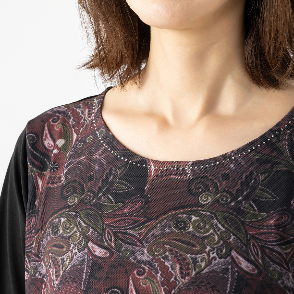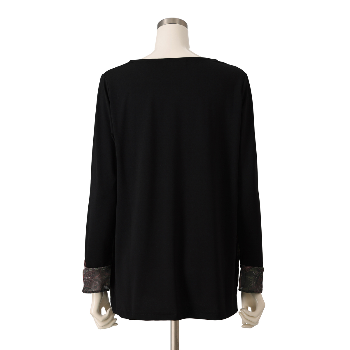 柔らかく軽やかなシフォン生地のプリントが目を引く長袖プルオーバーです。身頃にはカットソー生地を使い、着心地よく仕上げました。袖口の重なり合うように使用したプリントが、お手元に彩りを添えます