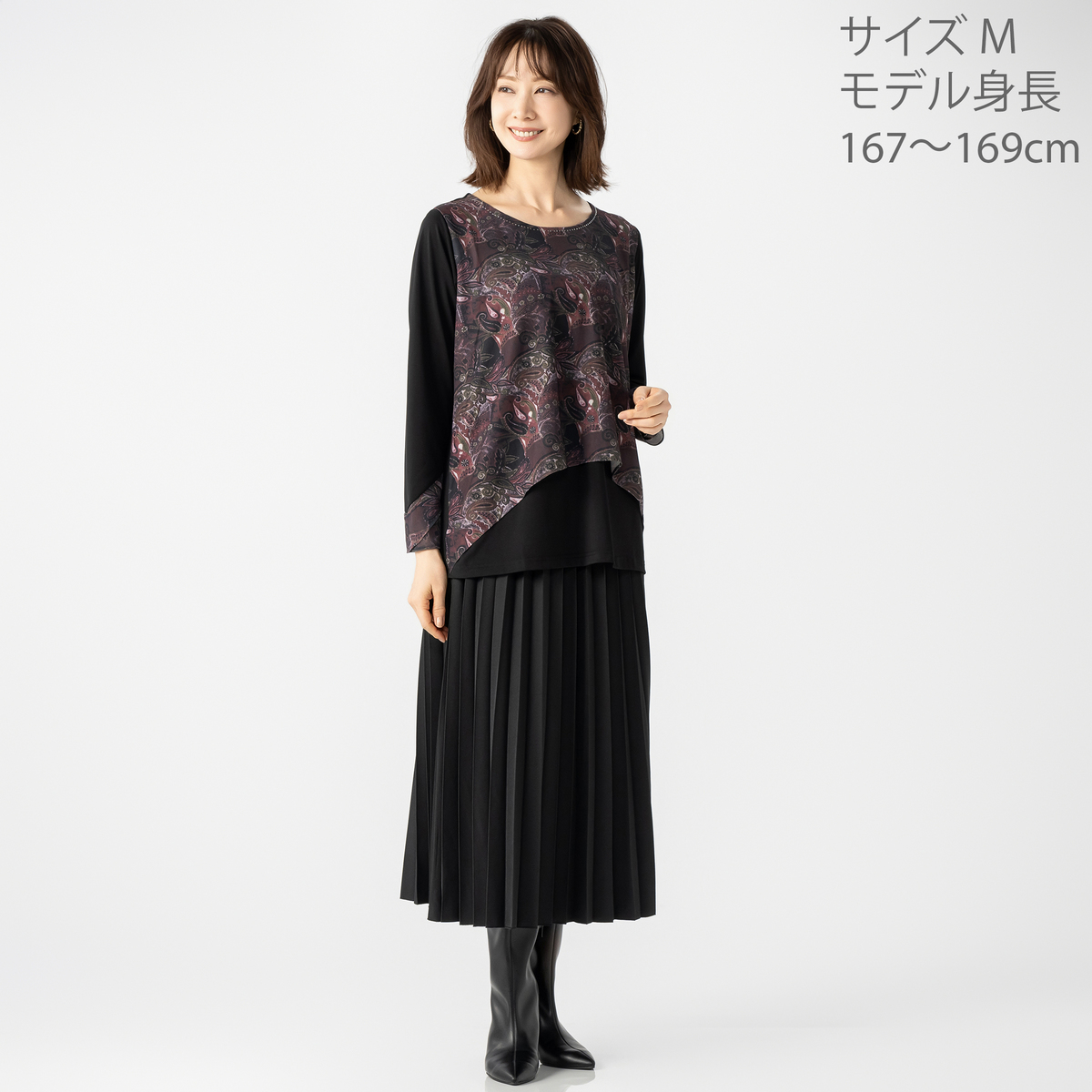 [商品寸法(ヌード)cm] サイズ バスト 着丈 肩幅 袖丈 M:100(79〜87) 66 35 54 L:103(84〜92) 67 36 55 LL:106(89〜97) 68 37 56 3L:109(94〜102) 69 38 57 [素材] 本体:ポリエステル95%、ポリウレタン5% プリント部分:ポリエステル95%、ポリウレタン5% [お手入れ] 手洗い可 [注意事項] ※商品寸法の誤差は多少発生します。ご了承下さい ※洗濯後はすぐに脱水し、形を整えて干して下さい。長時間水につけたままにしないで下さい ※洗濯後は重ね置きしないで下さい ※もみ洗いはお避け下さい ※スチームアイロンを浮かしながら掛け、形を整えて下さい ※濃色物は、洗濯の際、色落ちすることがありますので他の物と分けて洗って下さい 【中国製】