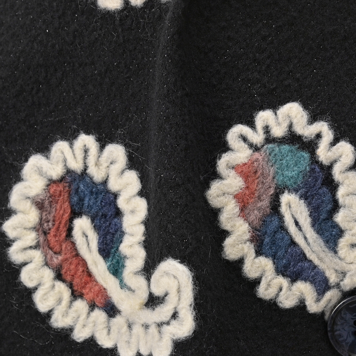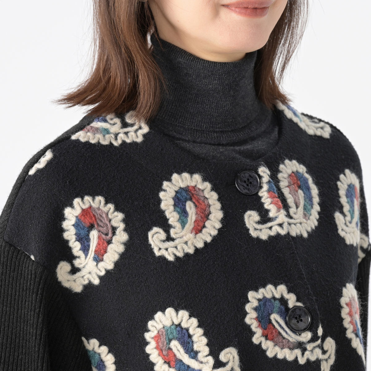前身に大胆にあしらわれた、太く立体感のある毛糸刺繍が特徴のカーディガン。少しボリューム感のある袖は、華やかな印象を与えてくれます
