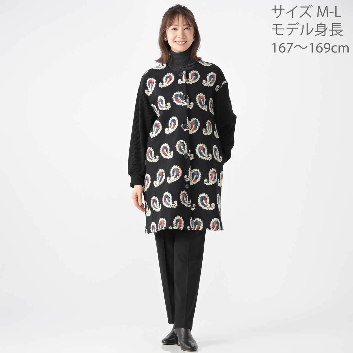[商品寸法(ヌード)cm] サイズ バスト 着丈 M-L : 104(79〜92) 88 LL-3L : 110(89〜102) 90 サイズ 裄丈 M-L : 74 LL-3L : 76 [素材] <ブラック> 前身頃:ポリエステル65%、アクリル30%、ナイロン5% 刺繍糸:ポリエステル100% 袖・後身頃:ポリエステル95%、ポリウレタン5% <ネイビー> 前身頃:ポリエステル50%、アクリル45%、ナイロン5% 袖・後身頃:ポリエステル95%、ポリウレタン5% [お手入れ] 手洗い可 [注意事項] ※商品寸法の誤差は多少発生します。ご了承下さい ※洗濯後はすぐに脱水し、形を整えて干して下さい。長時間水につけたままにしないで下さい ※洗濯後は重ね置きしないで下さい ※もみ洗いはお避け下さい ※スチームアイロンを浮かしながら掛け、形を整えて下さい ※濃色物は、洗濯の際、色落ちすることがありますので他の物と分けて洗って下さい 【中国製】