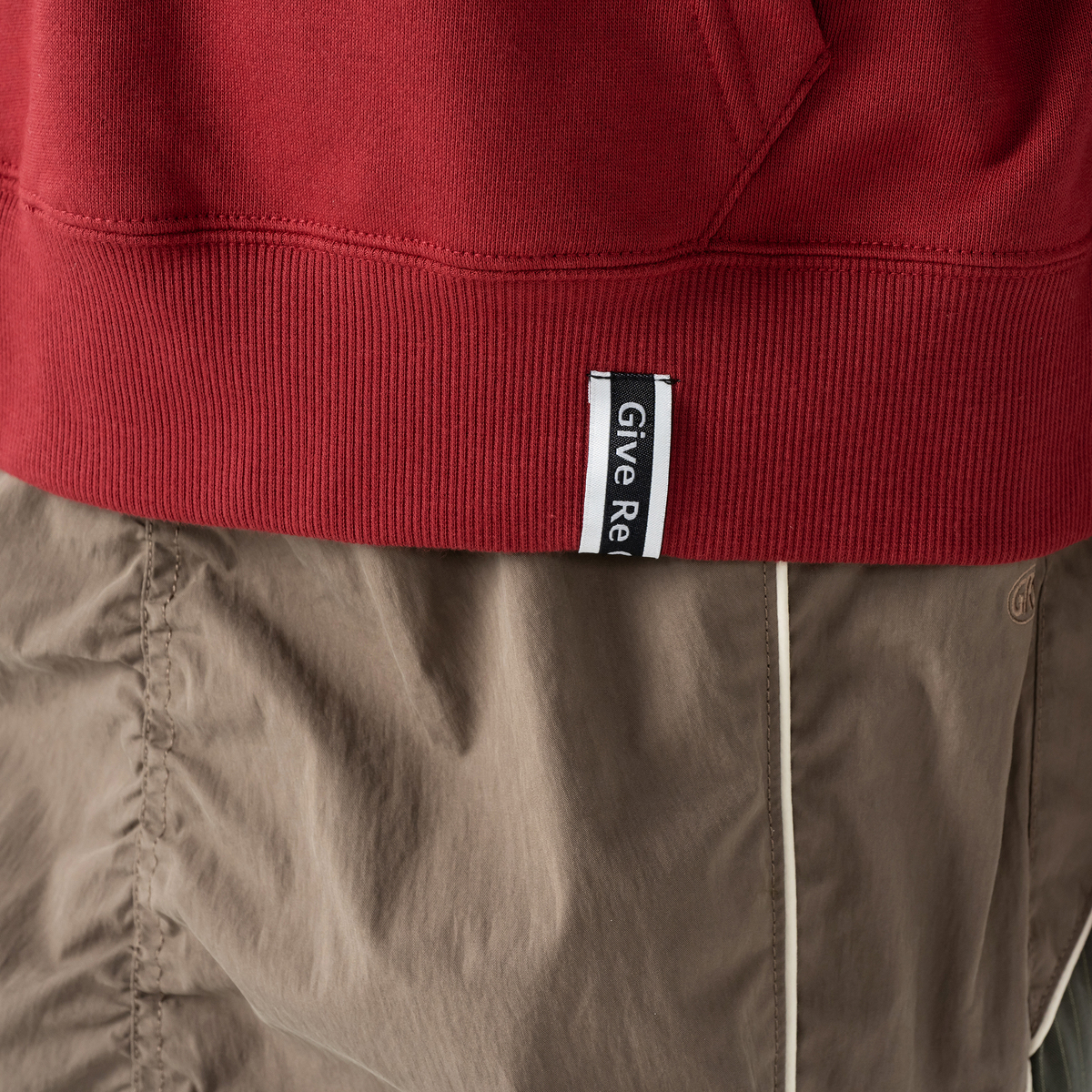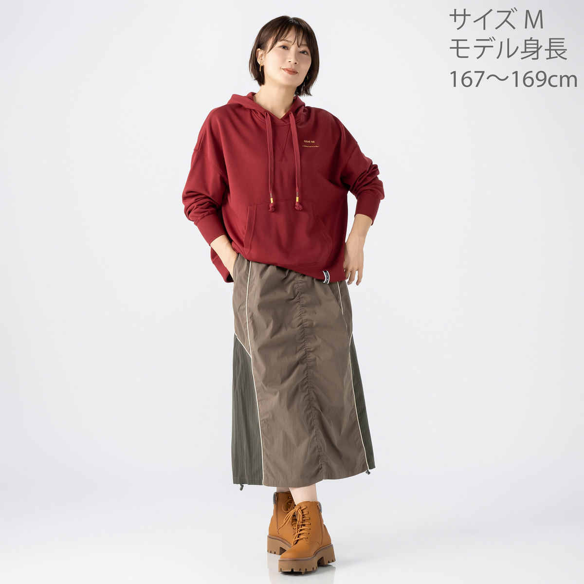 フードのひも先にはクラフト感ある飾り巻き刺繍を施し、裾にはロゴ入りピスネーム付き。袖口や裾口、ガゼット部分には伸縮のあるリブを同色系使いしています