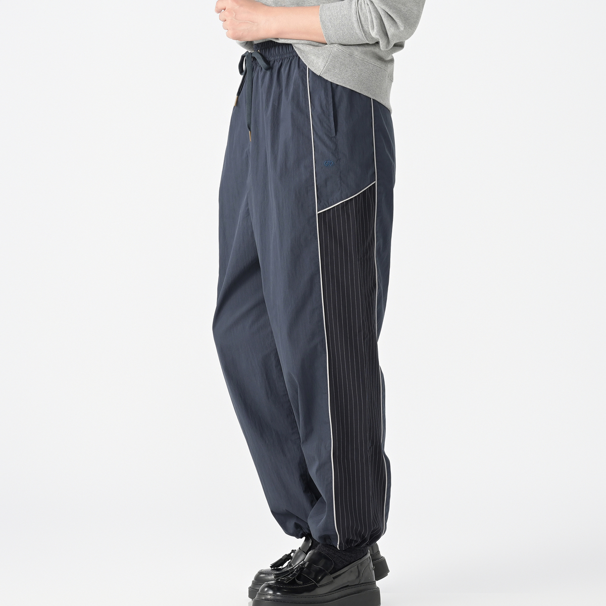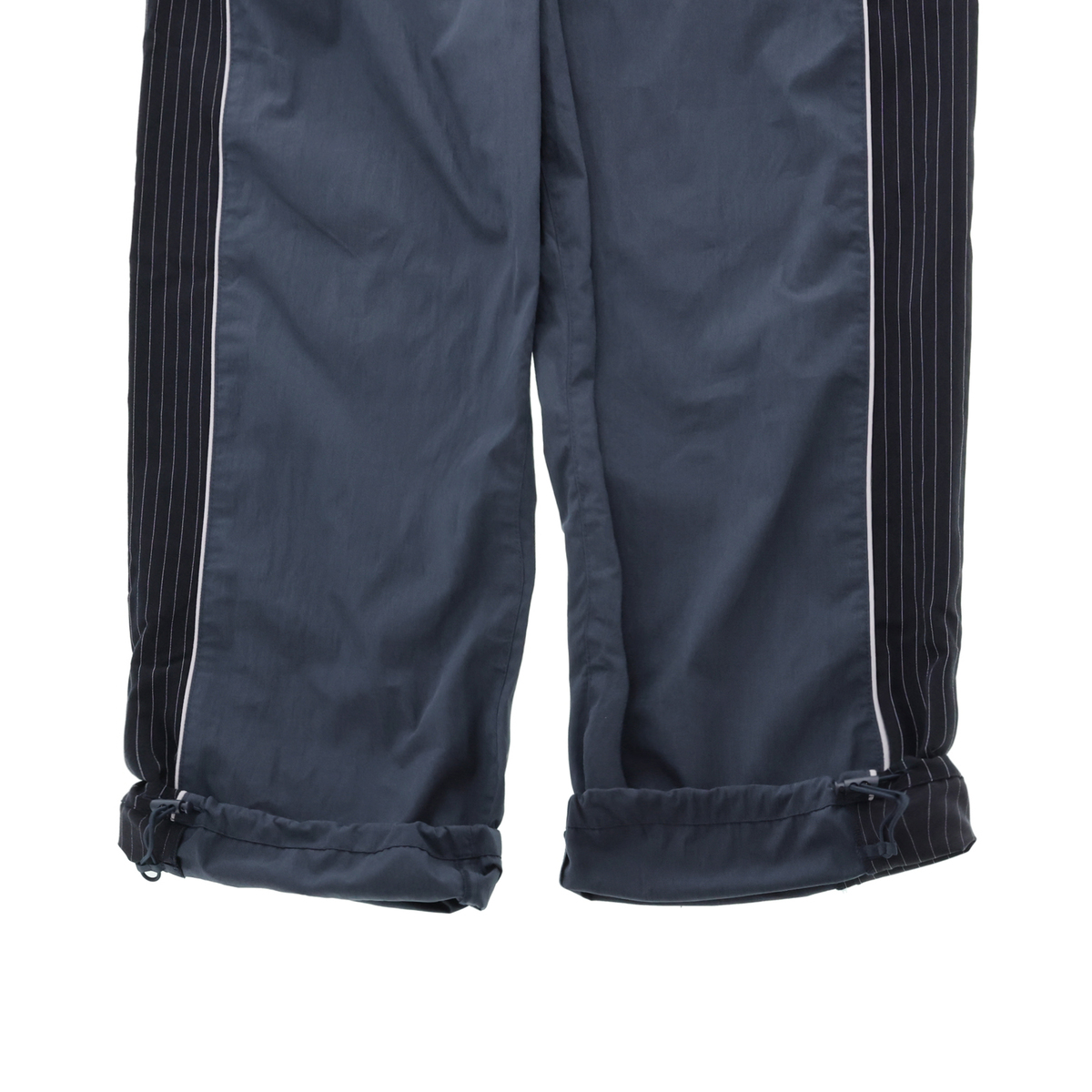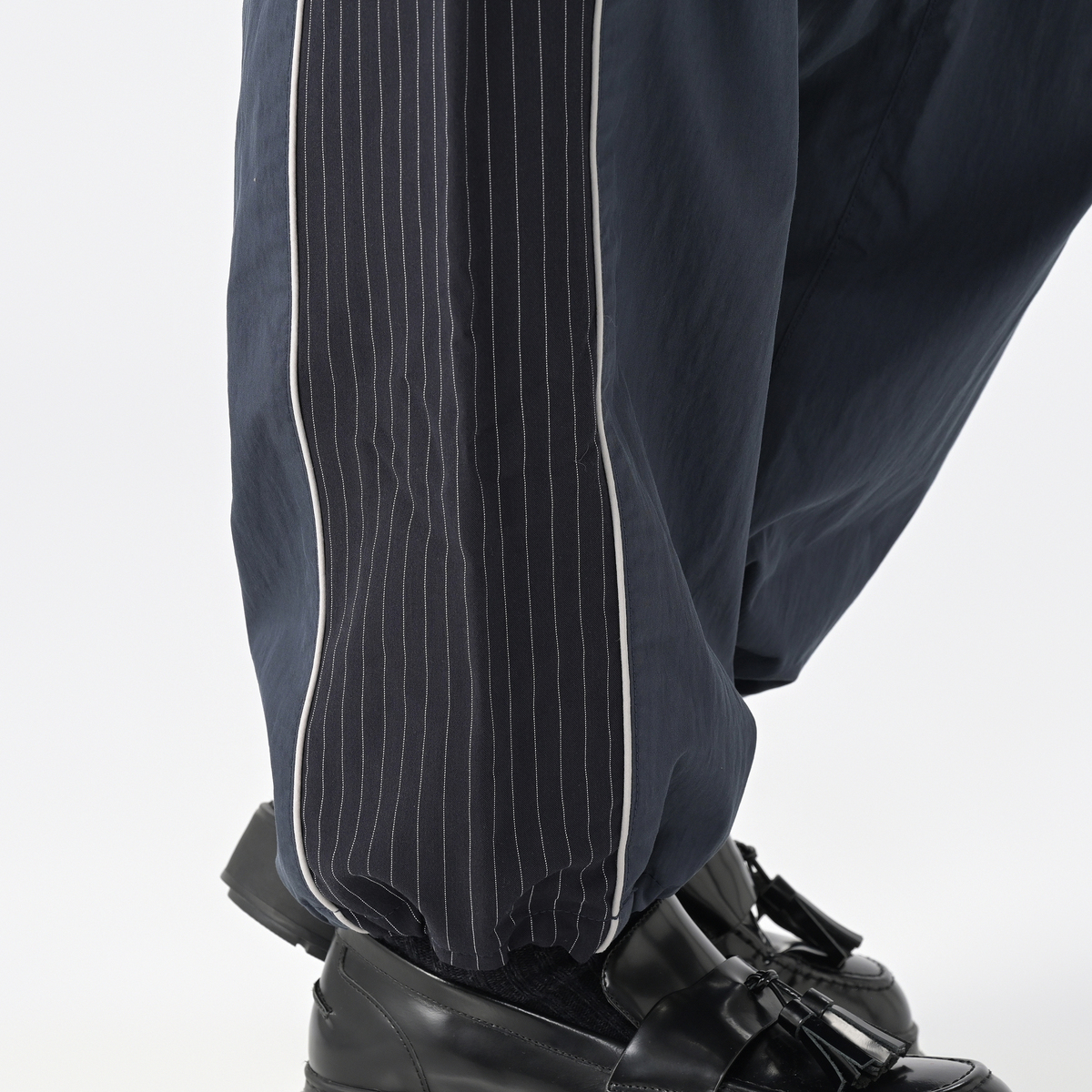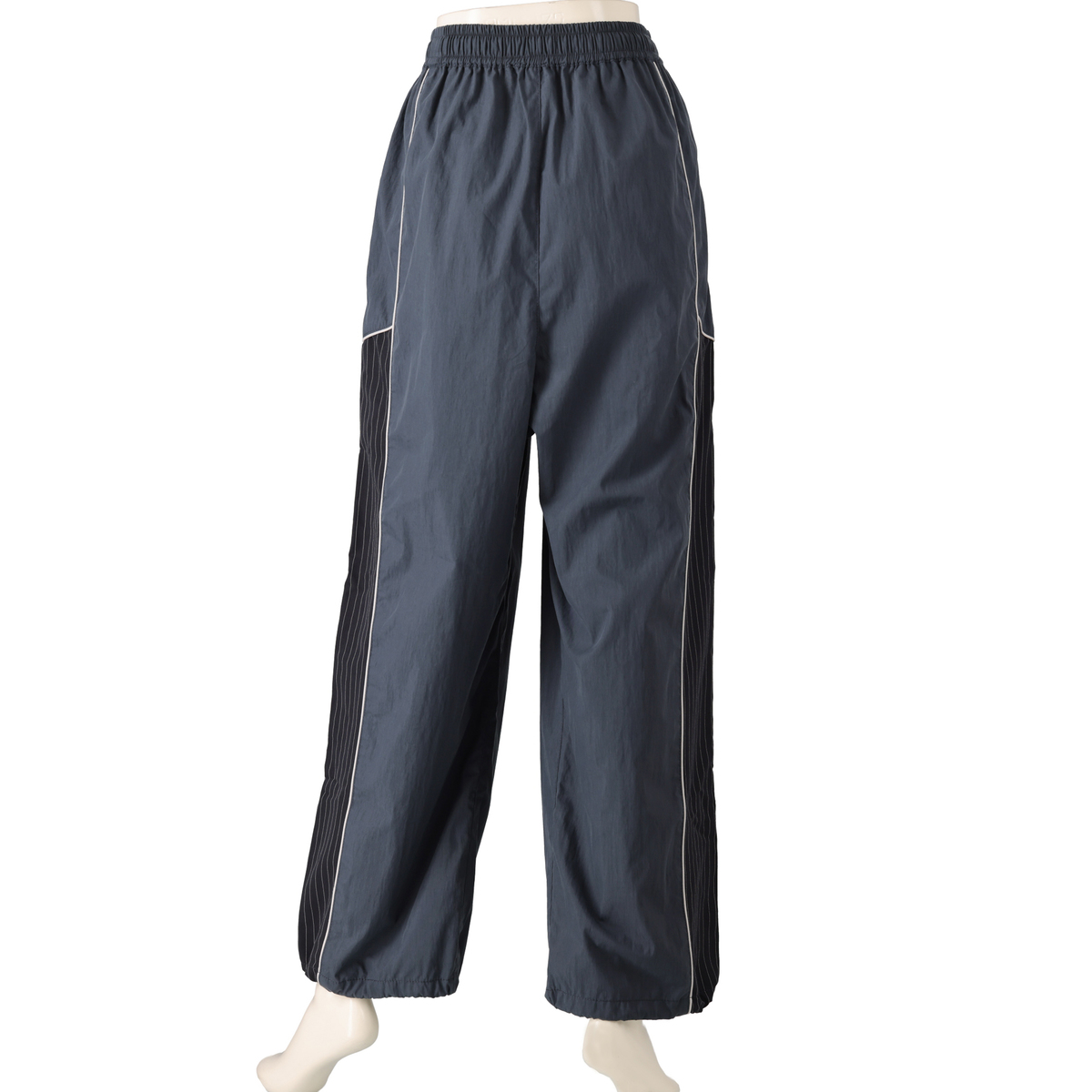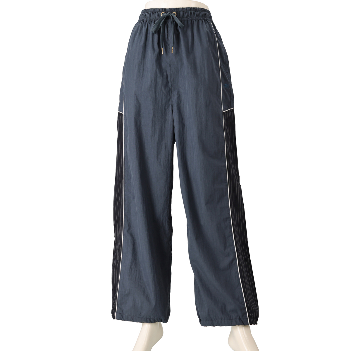 ストライプ柄使いや配色パイピングコードがアクセントのセミワイドパンツ。ウエストはゴム仕様で、裾のドロスト&ストッパーでシルエット変化を楽しめます。休日のお出かけやアウトドアなど、スポーティーとアーバンのミックススタイルが魅力です
