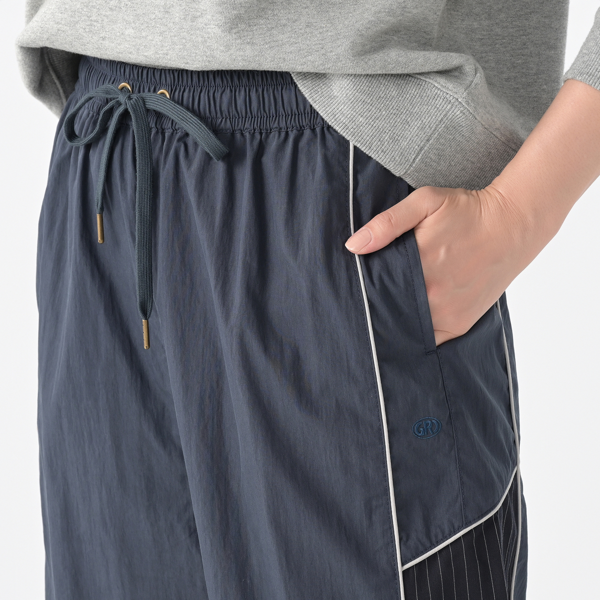 脇から少し内側の切替ラインに仕込んだ配色パイピングコードと、脇パーツのストライプ柄の縦のラインが、気になるヒップやもも周りを程よく細見せ。脚のラインをひろいにくいセミワイドシルエットなので、スタイルUP効果を期待できます