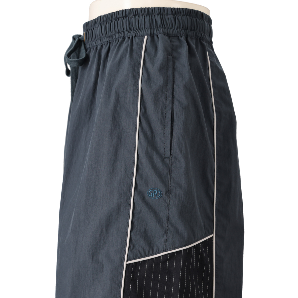 本体は高密度な布帛素材を採用し、脇パーツ下部にはストライプ柄の布帛ツイル素材を切替えて別布使いしています。脇には便利なポケット付きです