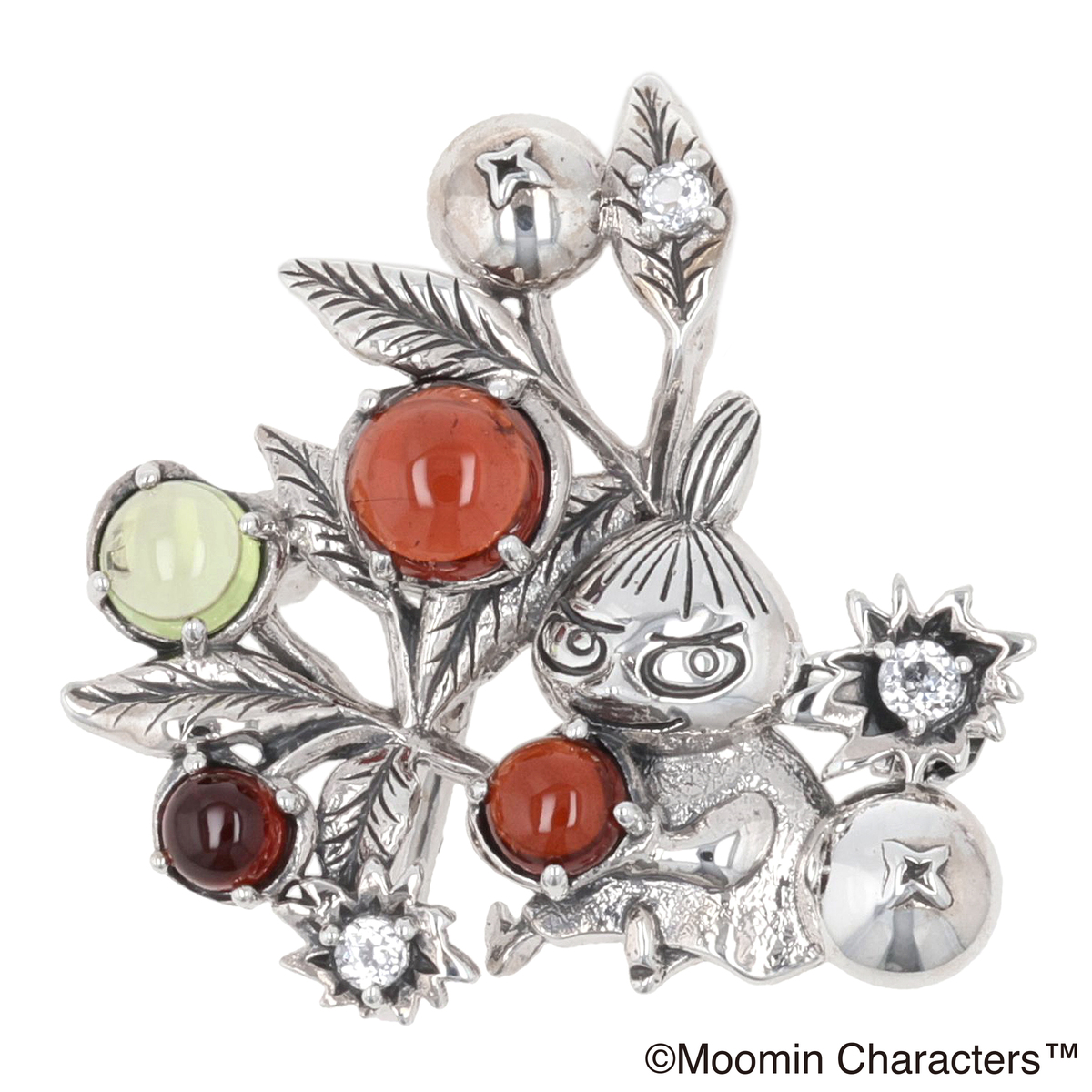 リトルミイをモチーフにしたブローチ兼ペンダントヘッド。体はとても小さいけれど勇敢で前向き、スリルが好きで自分のことは自分で決めて突き進んでいくリトルミイ。そんなリトルミイが、赤く熟したコケモモを選んでご機嫌そうな姿をジュエリーで表現しました