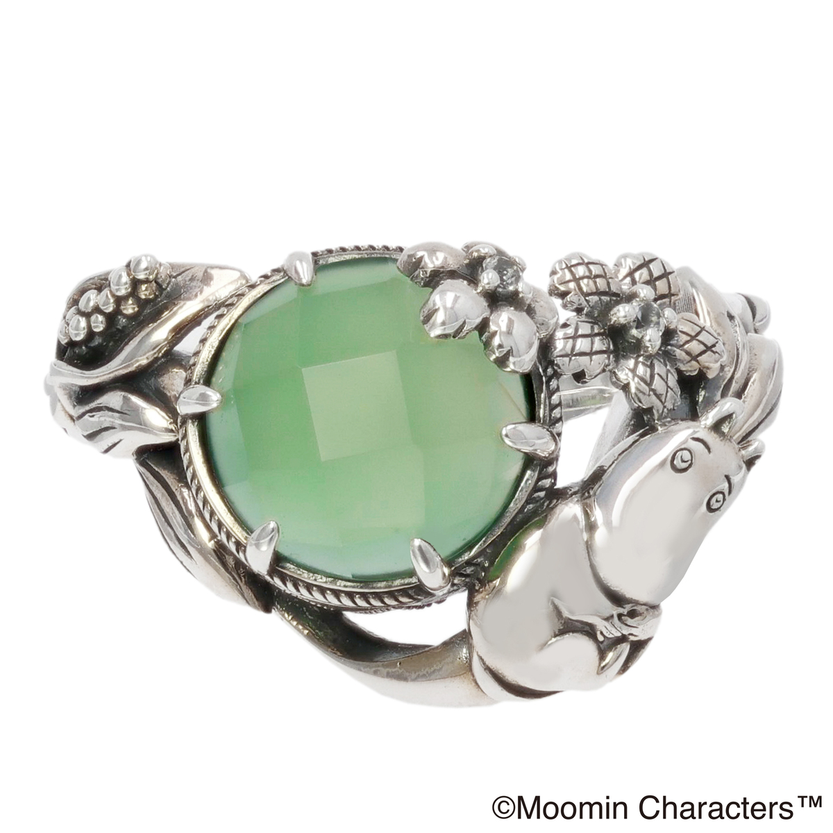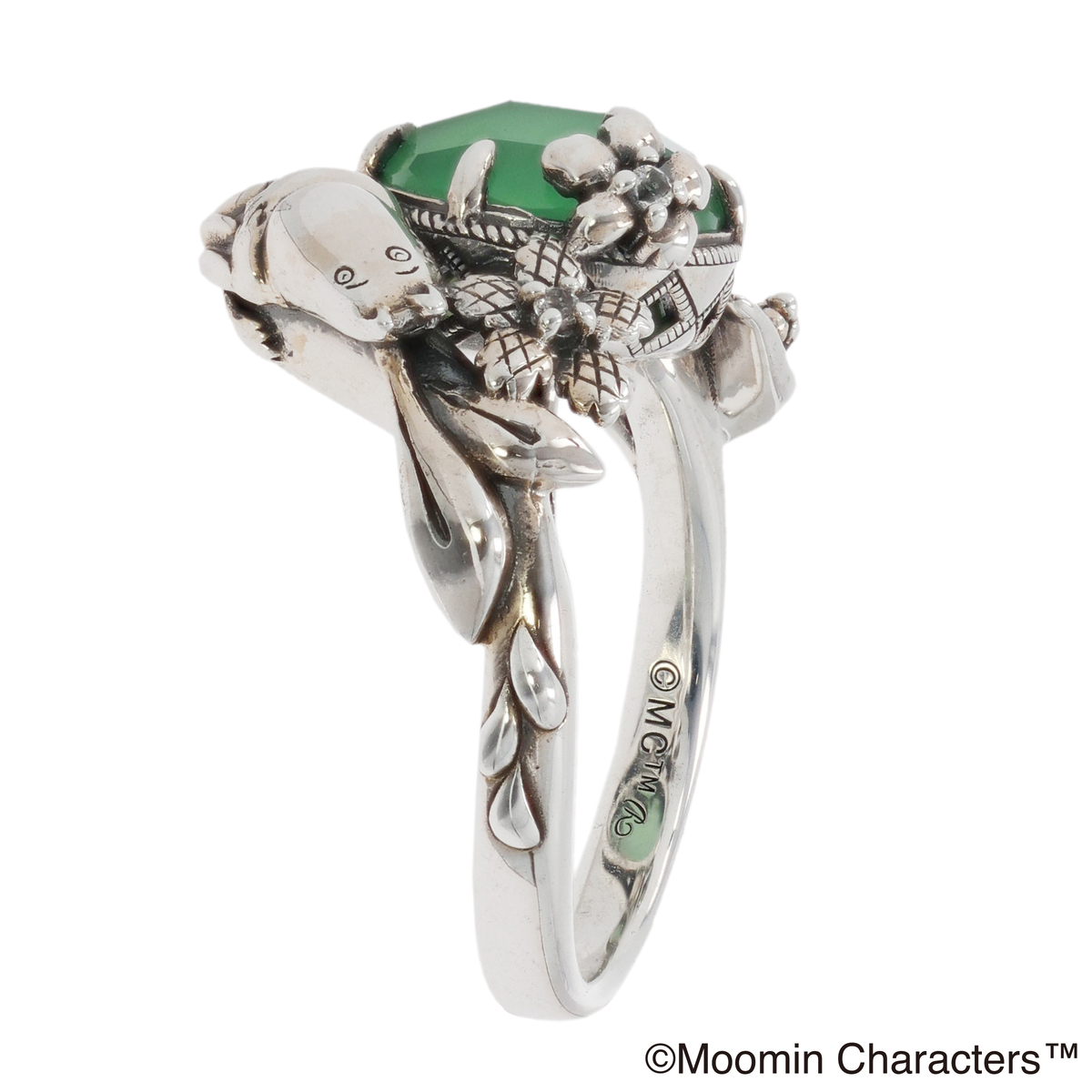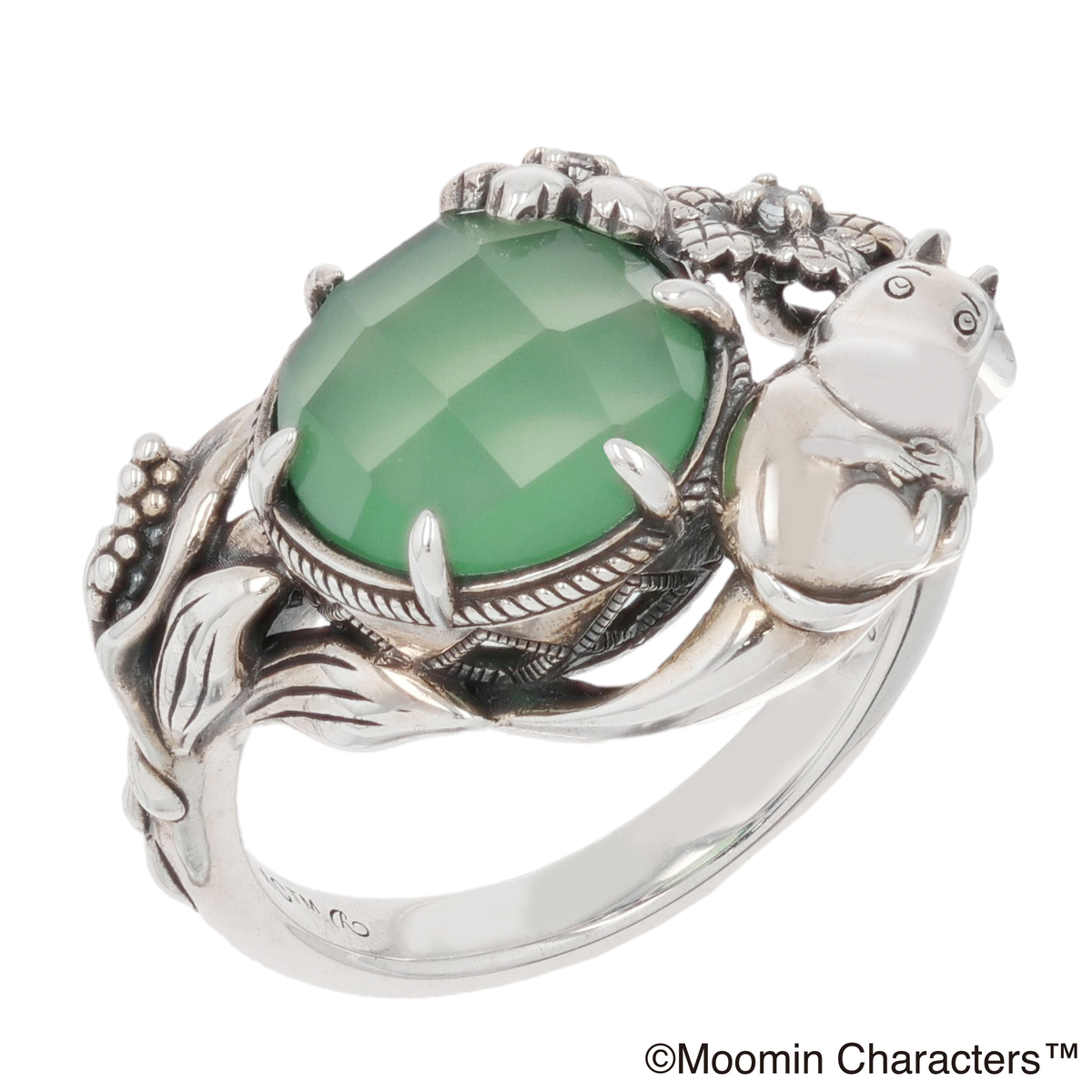 愛らしいムーミンとグリーンメノウをあしらったリング。チェッカーカットを施したグリーンメノウのさわやかな色合いとホワイトトパーズが上品に煌めくデザインです