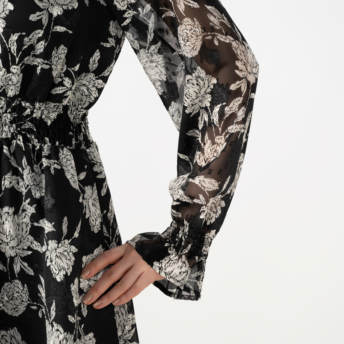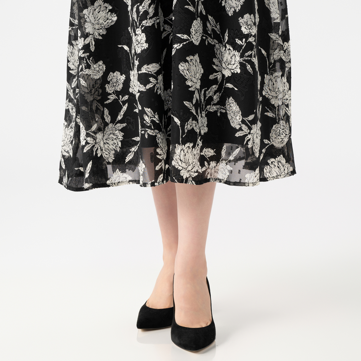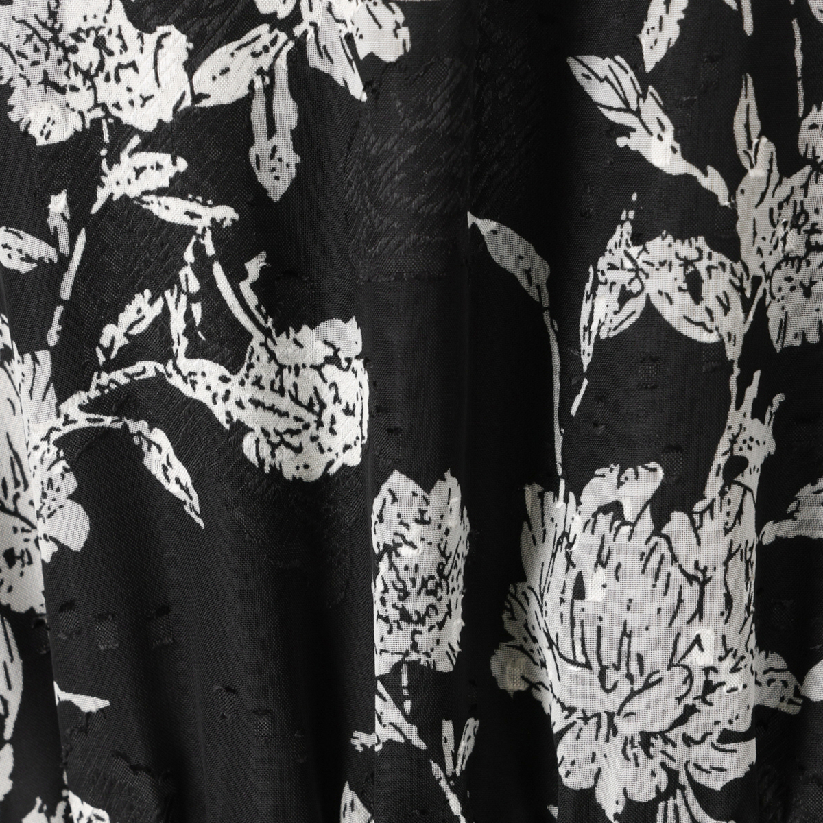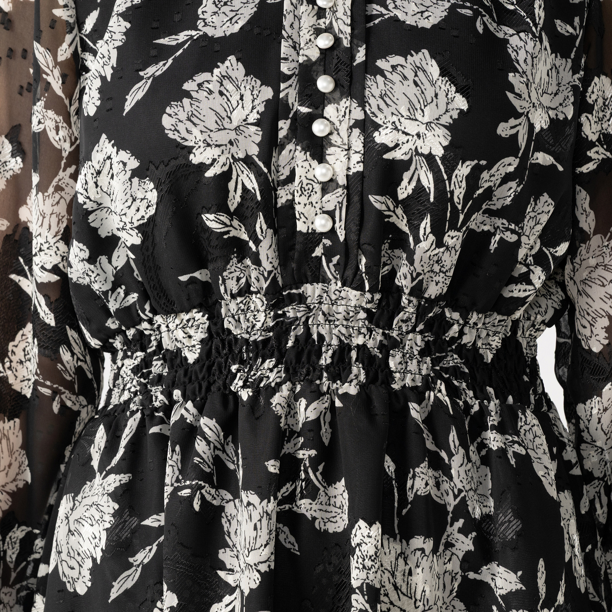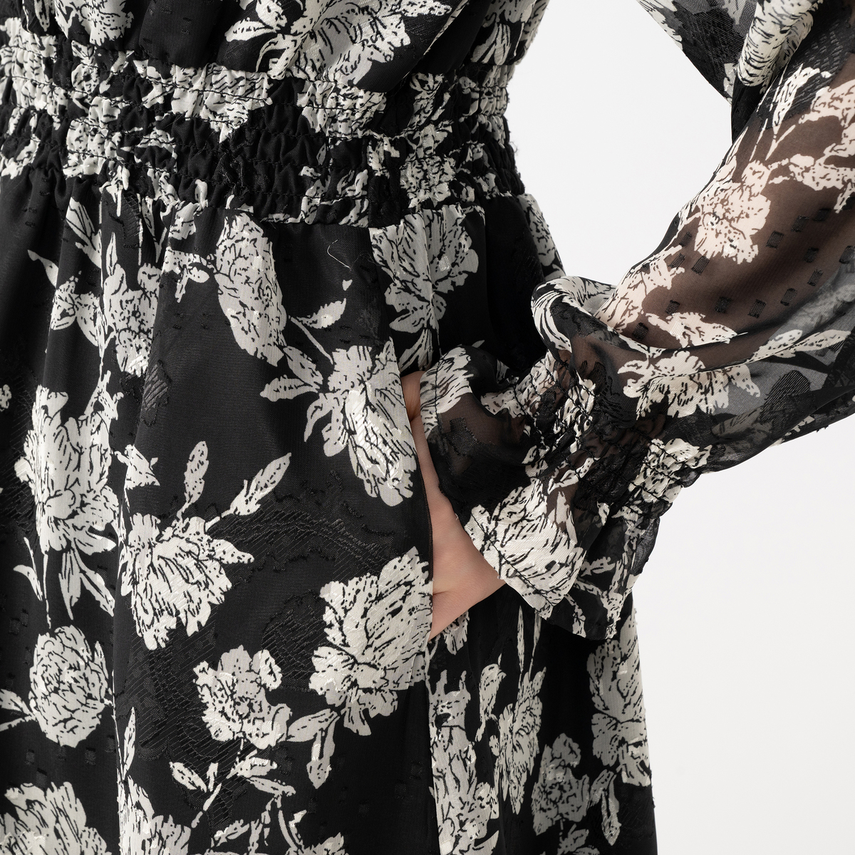 ジャガード素材に花柄プリントを施したワンピース。ウエスト部分にシャーリングゴムを使った着やすいデザインです。両脇には便利なポケットを付けました