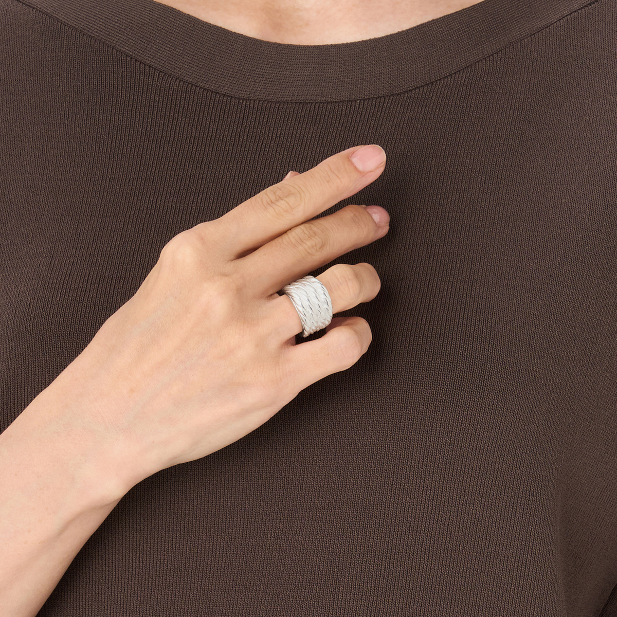 ハープの弦が連なったような縄目モチーフのデザイン。優美な雰囲気を醸し出すリングです