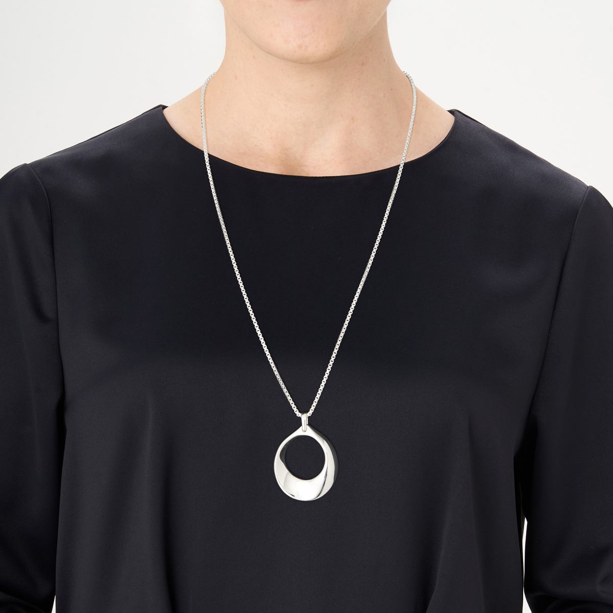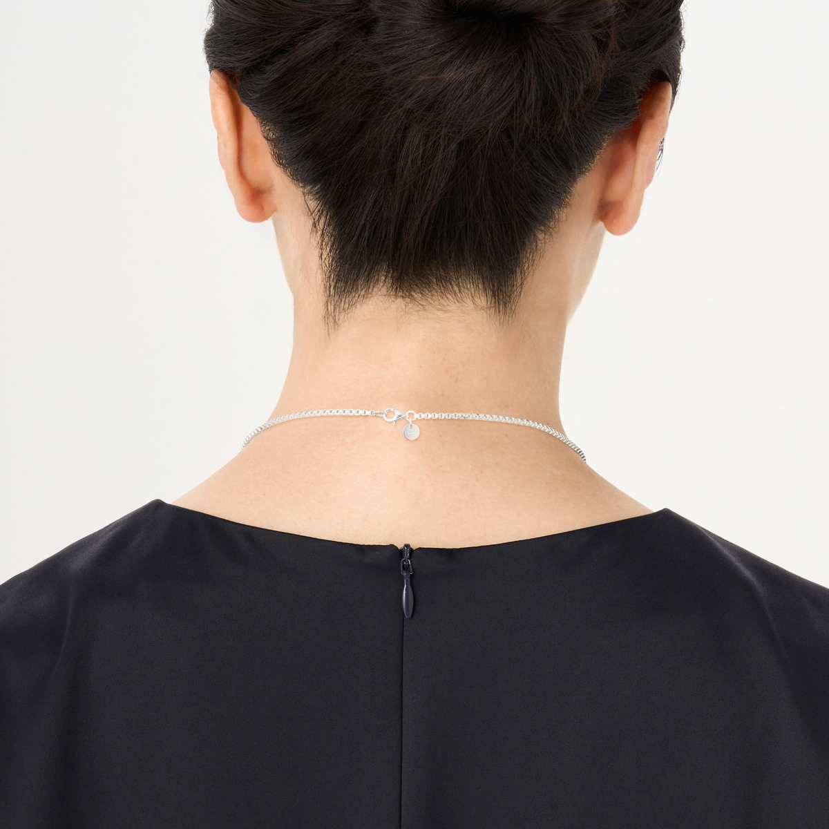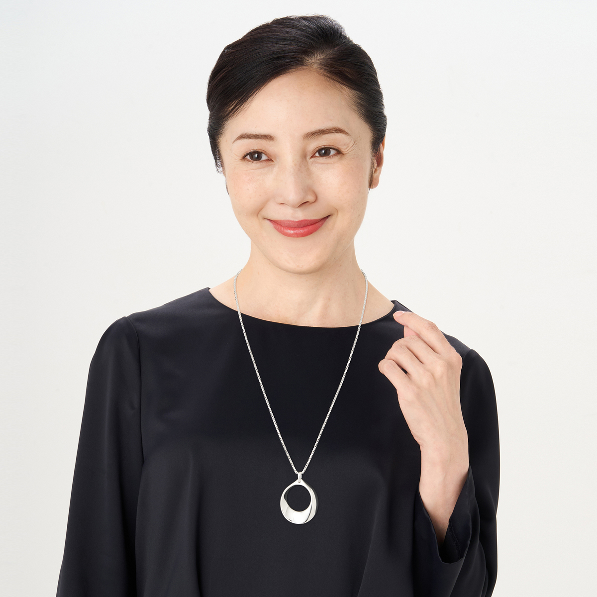揺らめく水面のようなモチーフのペンダント。磨き上げられた鏡面が艶やかな煌めきを放ち、存在感たっぷりに胸元を彩ります。流れるような煌めきが揺れ動き、艶感のある輝きを放つチェーンネックレスも美しく、洗練されたシンプルなデザインです。様々なコーディネートでお楽しみください