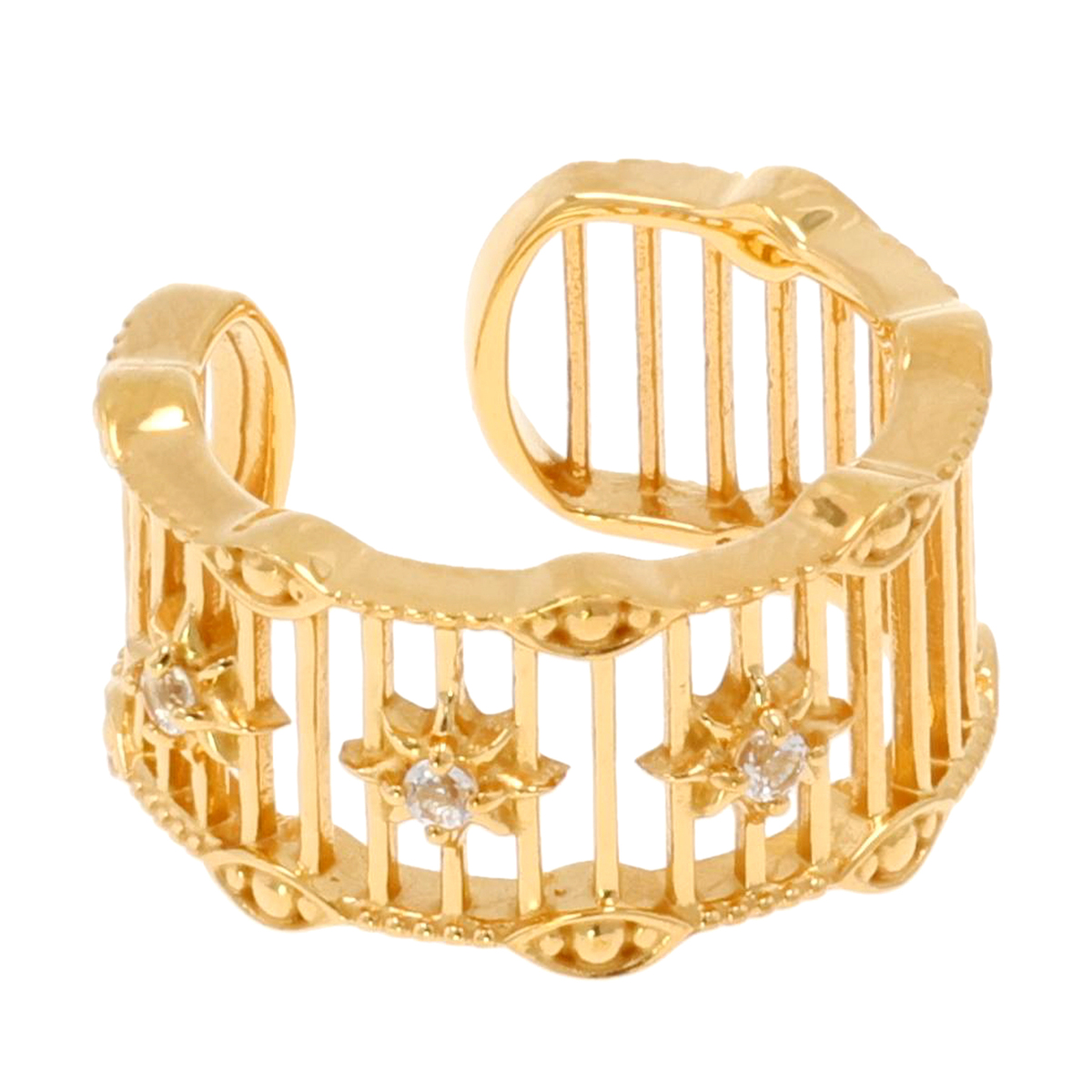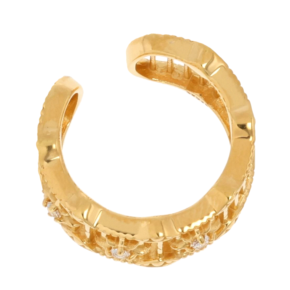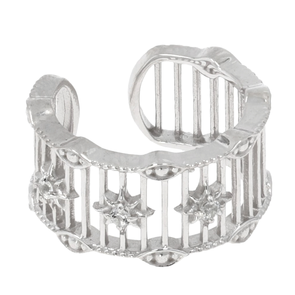 レースをイメージした透かし柄にホワイトトパーズを配してデザイン。耳横の上部からはめ込み、下にスライドさせるだけのイヤーカフです。耳たぶ横をほどよい幅で飾り、しっかりフィットしてお使い頂けます
