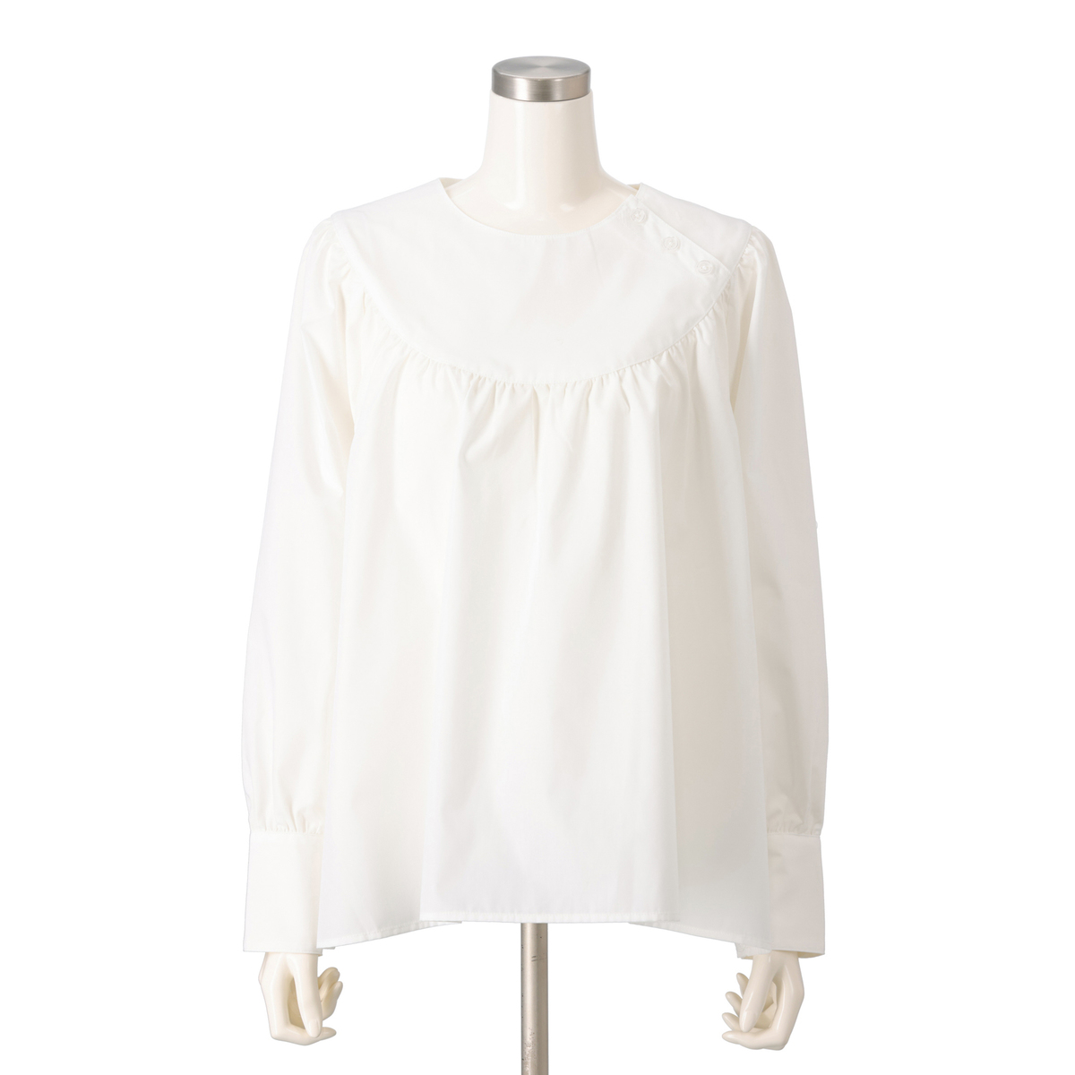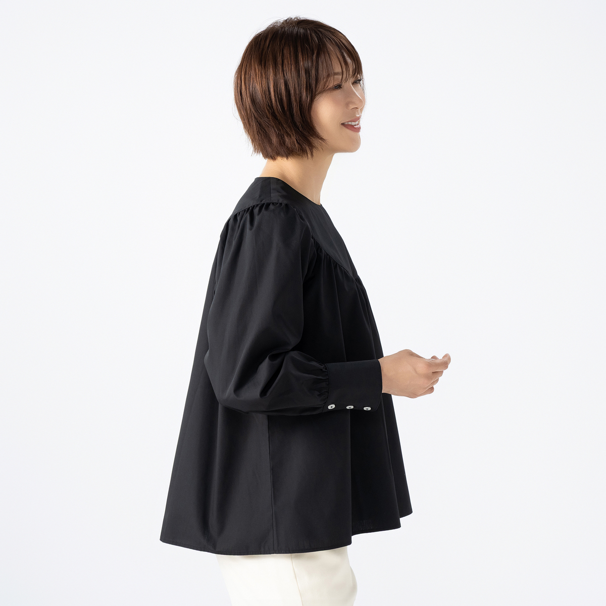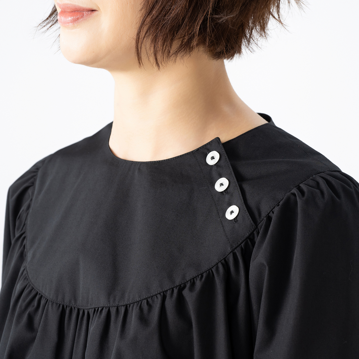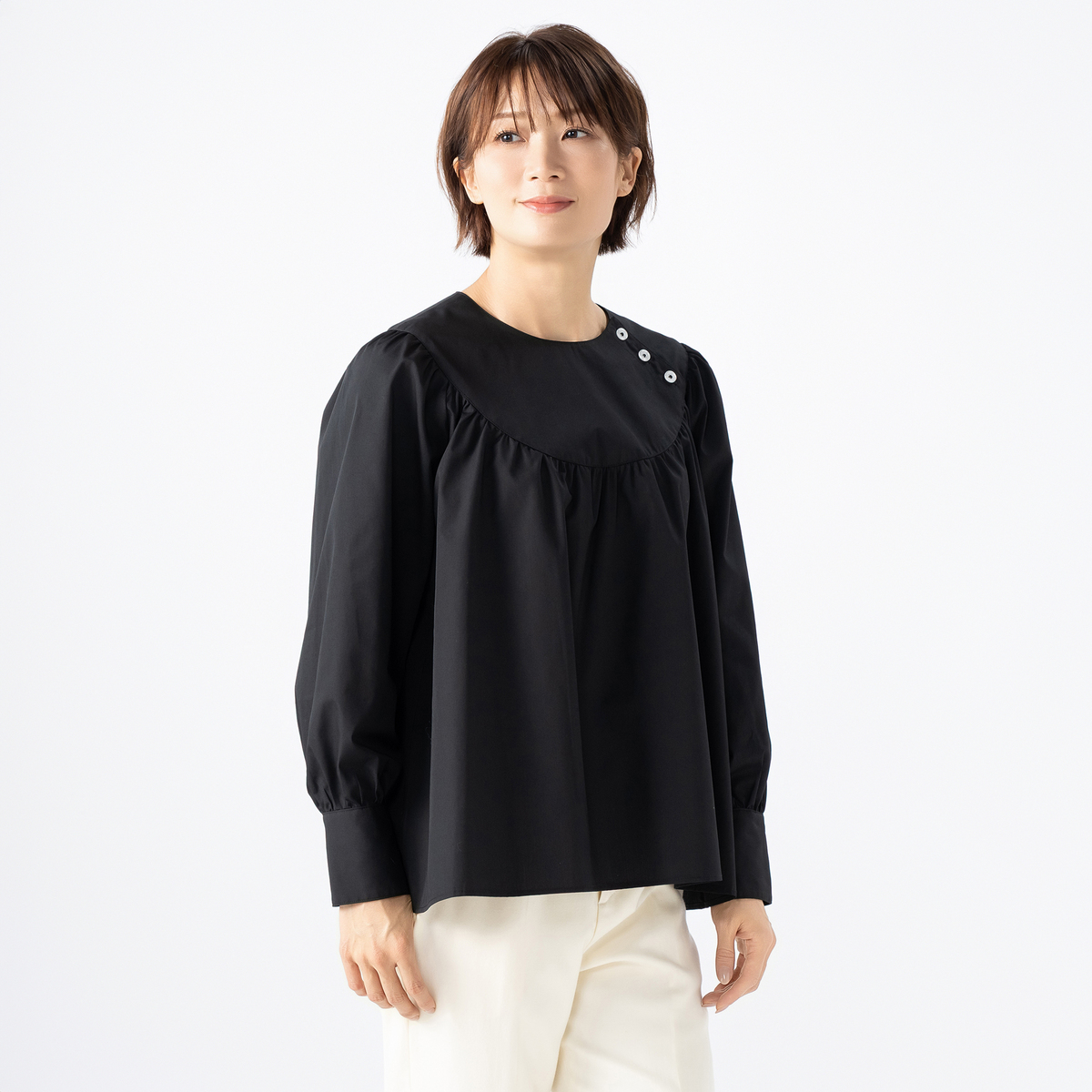 ラウンドヨークが目を引くノーカラーブラウス。開閉可能な左衿のボタンがアクセントとなり、やわらかな雰囲気でお召しいただけます