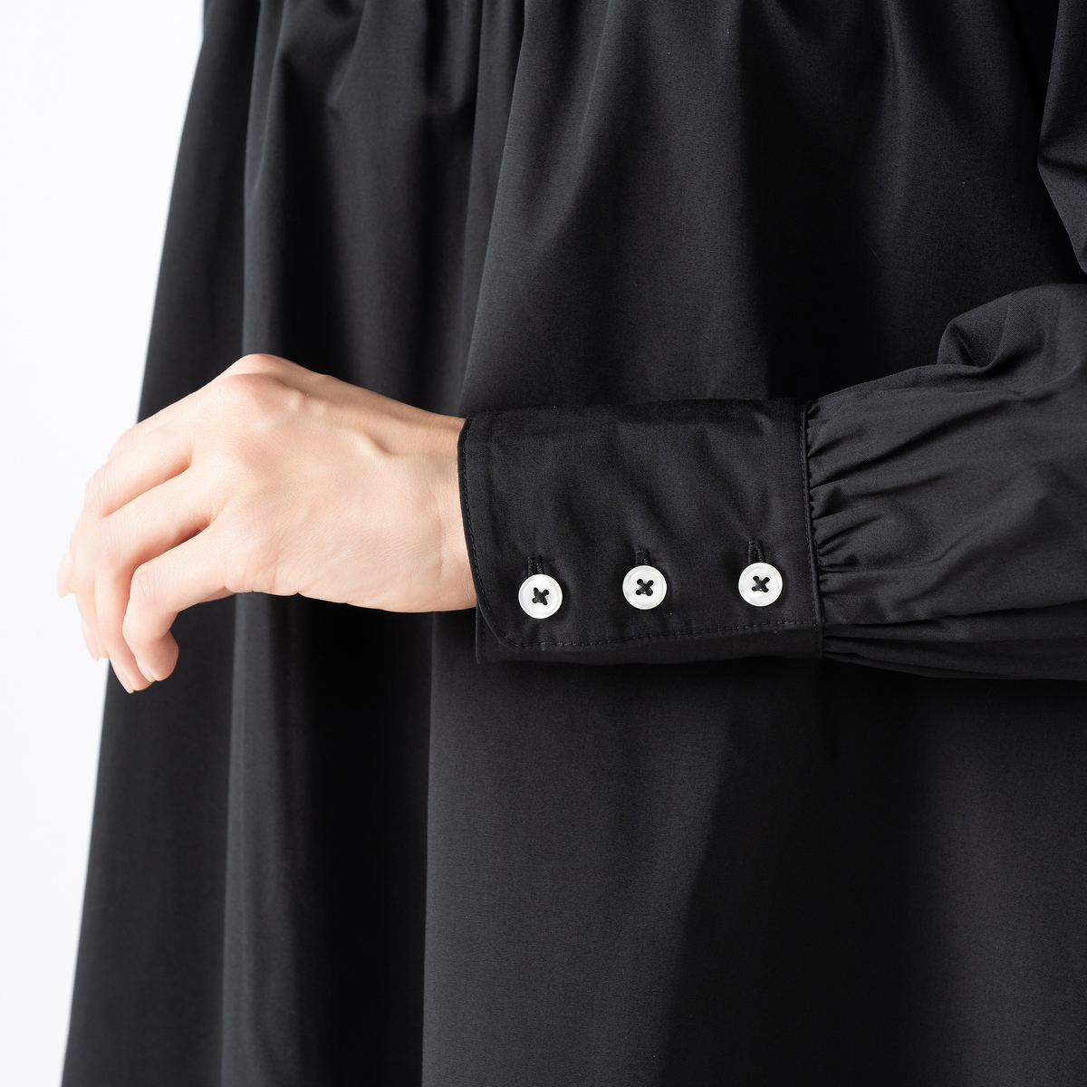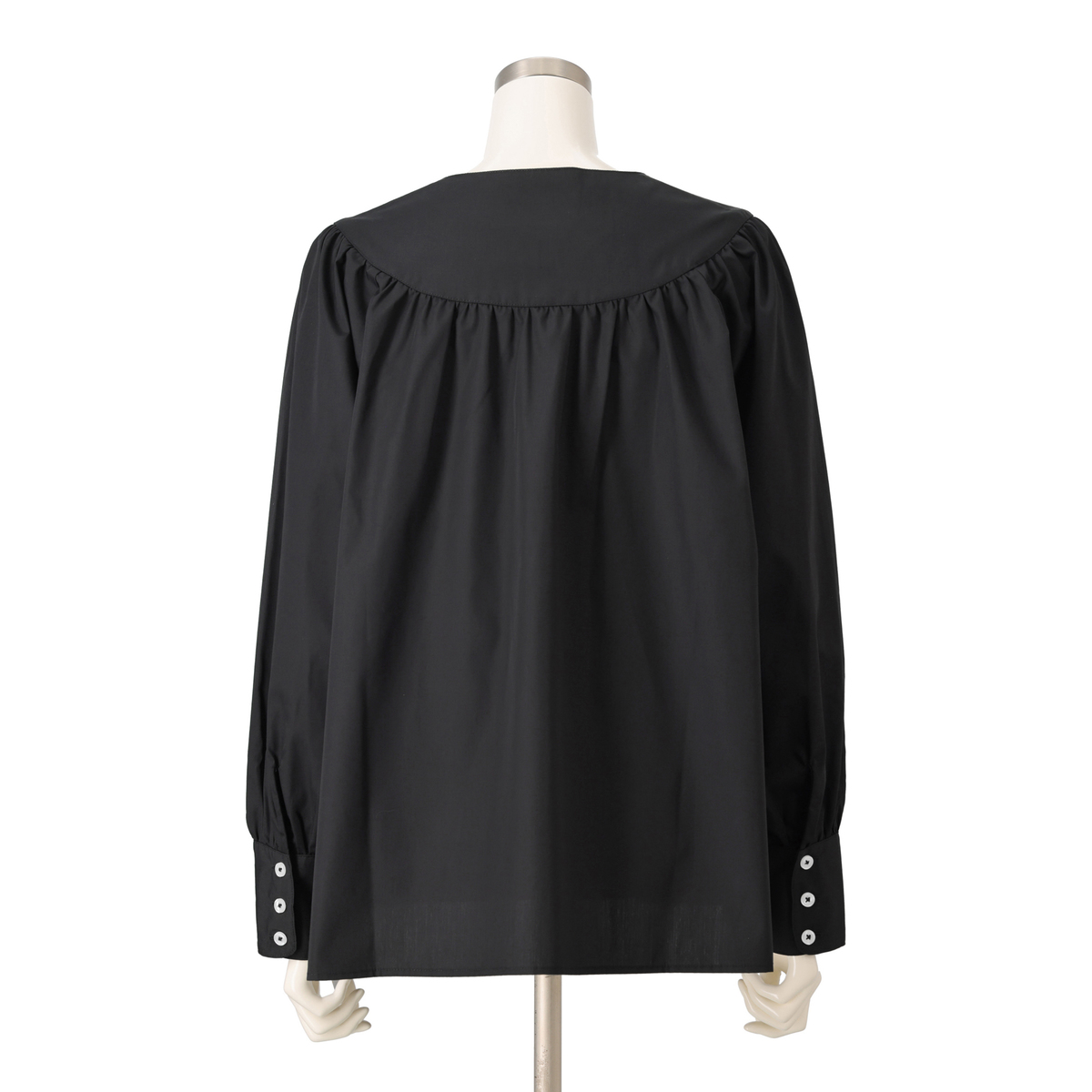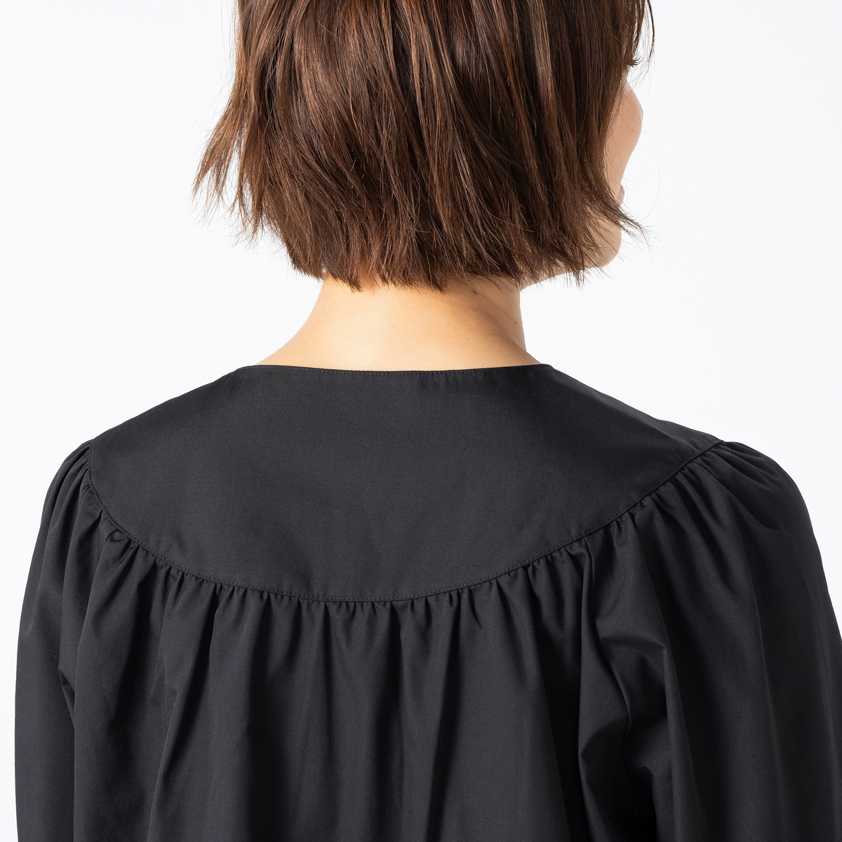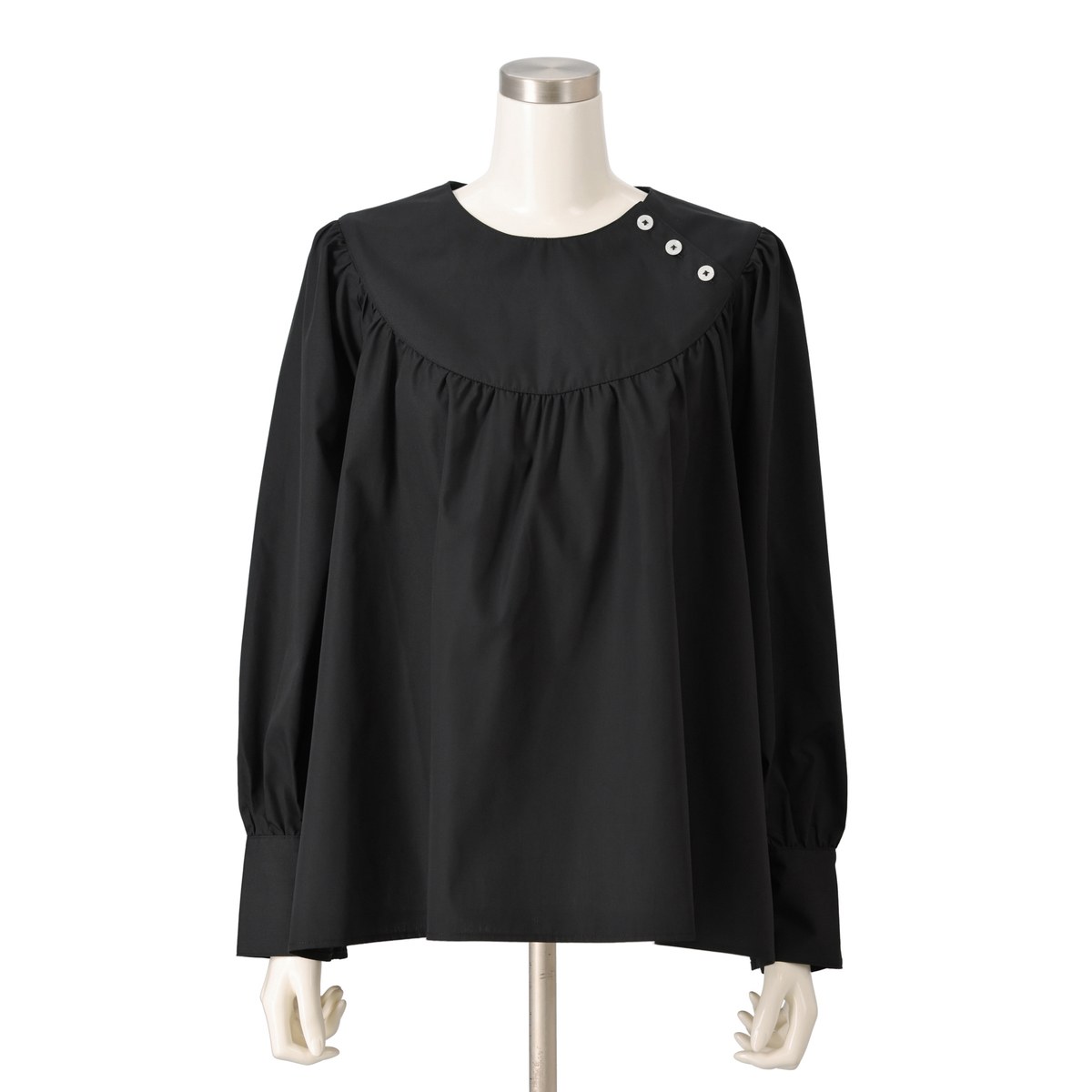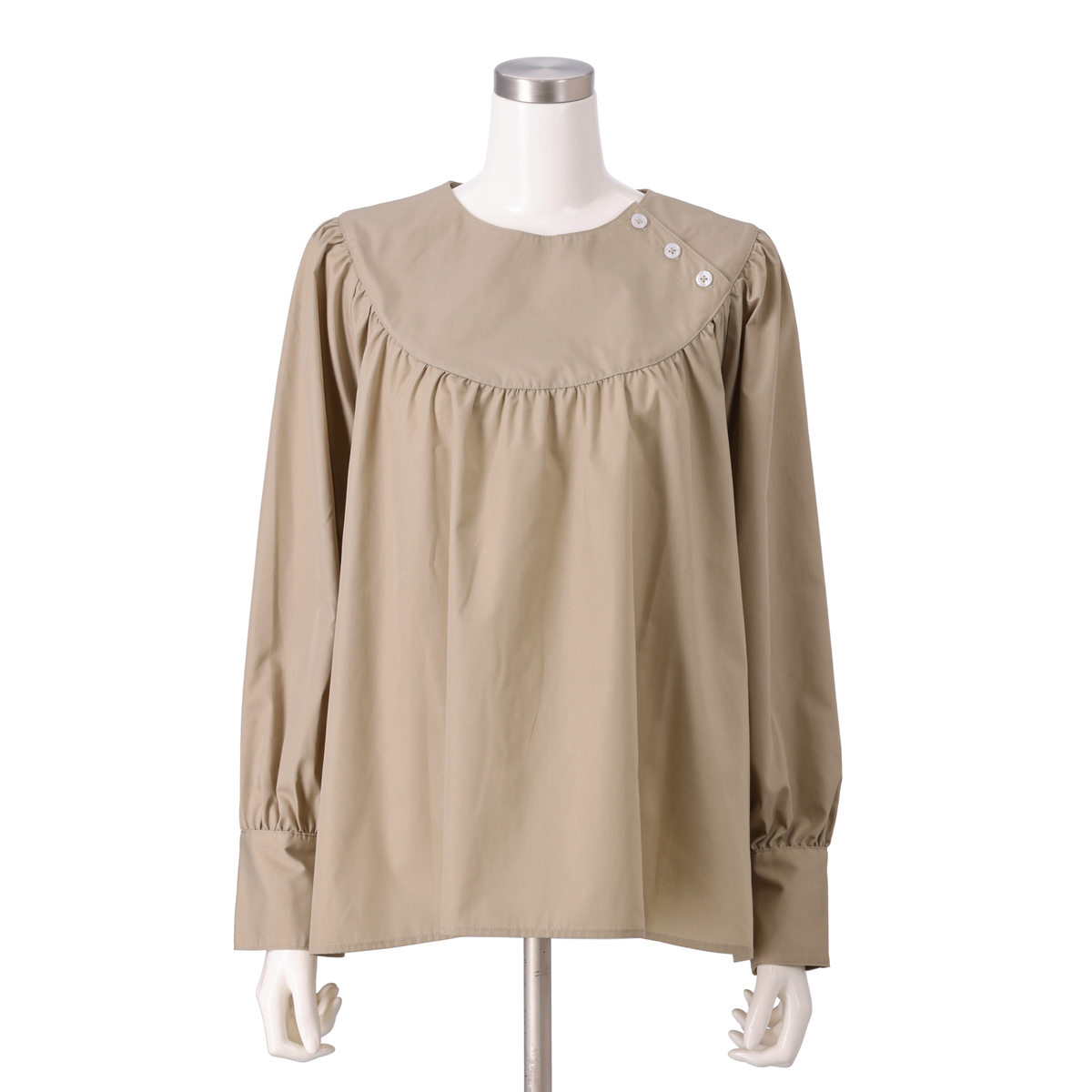 ラウンドヨークが目を引くノーカラーブラウス。開閉可能な左衿のボタンがアクセントとなり、やわらかな雰囲気でお召しいただけます