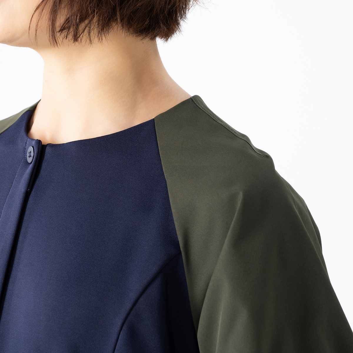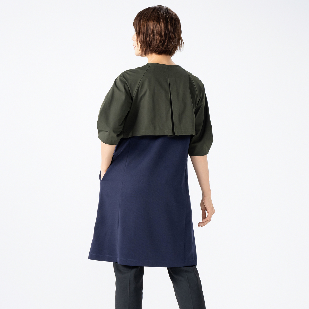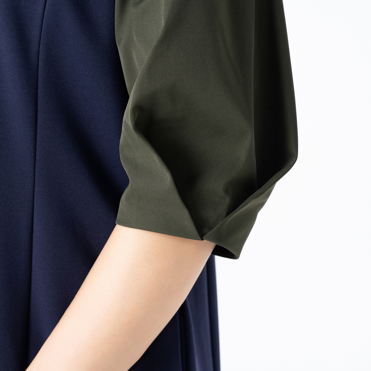 スタイリッシュな異素材切替のワンピース。背中にはアンブレラヨークを施し、後ろ姿まで美しく仕上げています。