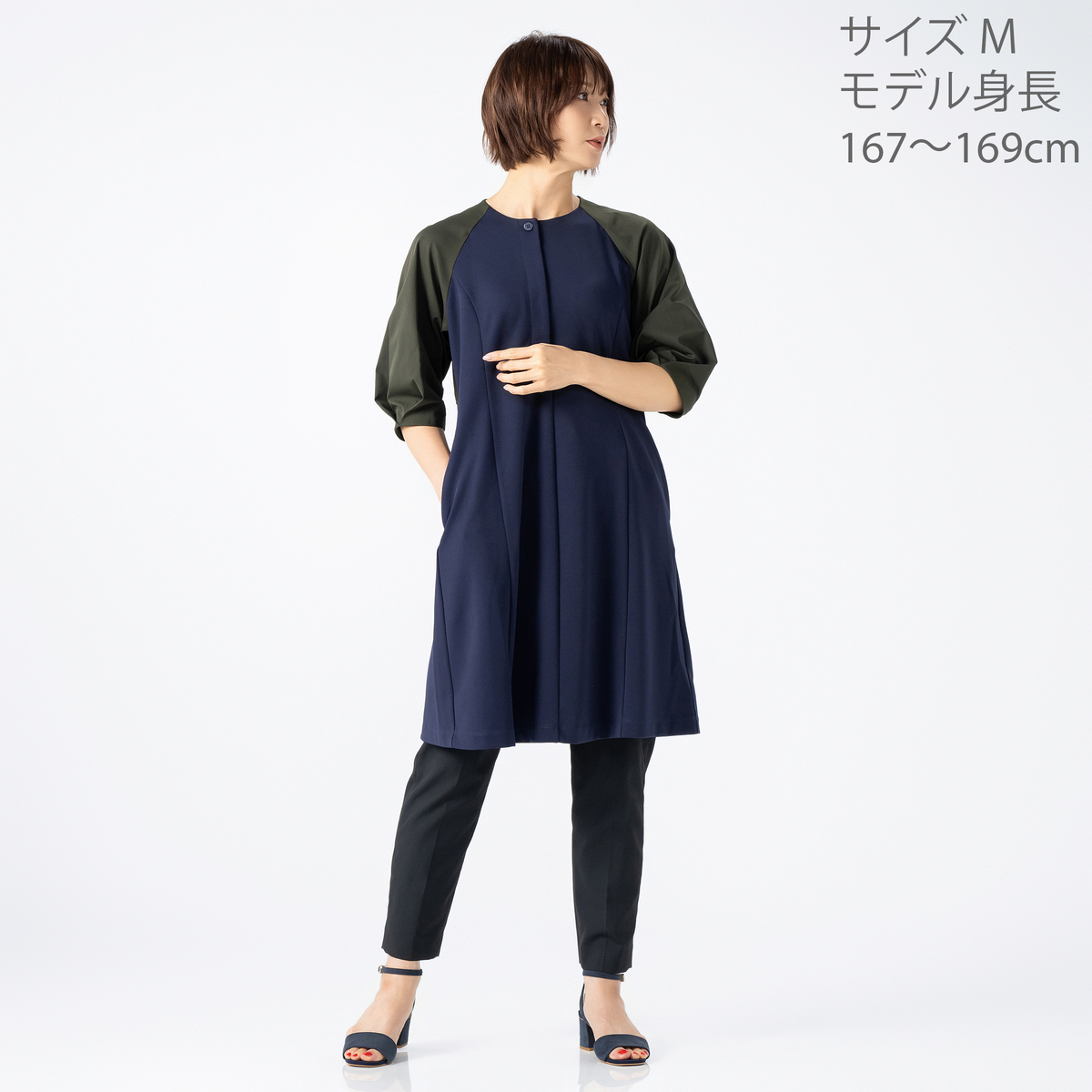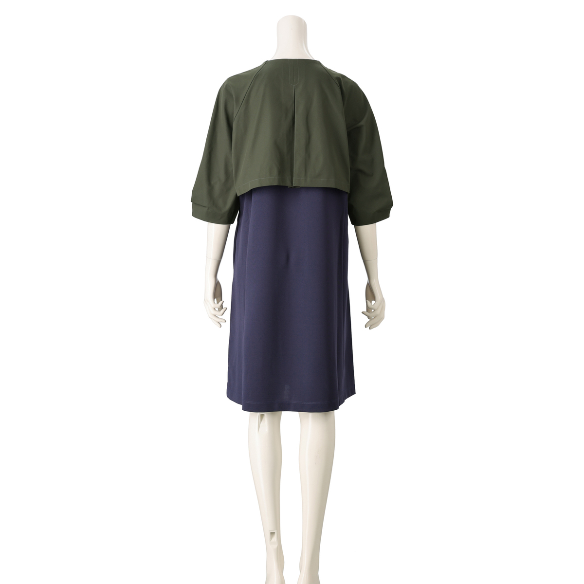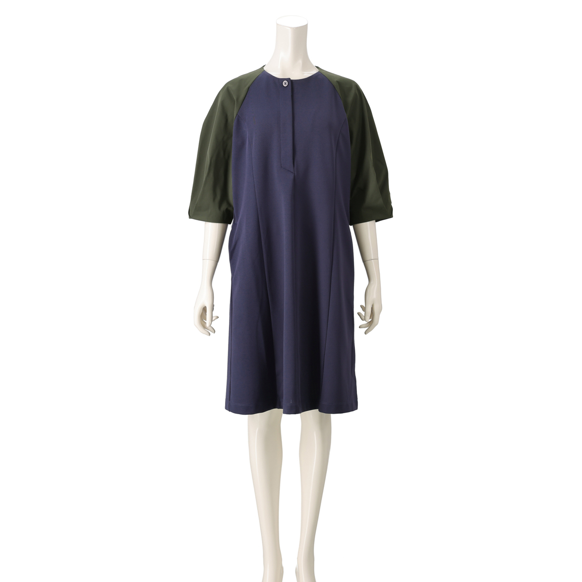 スタイリッシュな異素材切替のワンピース。背中にはアンブレラヨークを施し、後ろ姿まで美しく仕上げています。