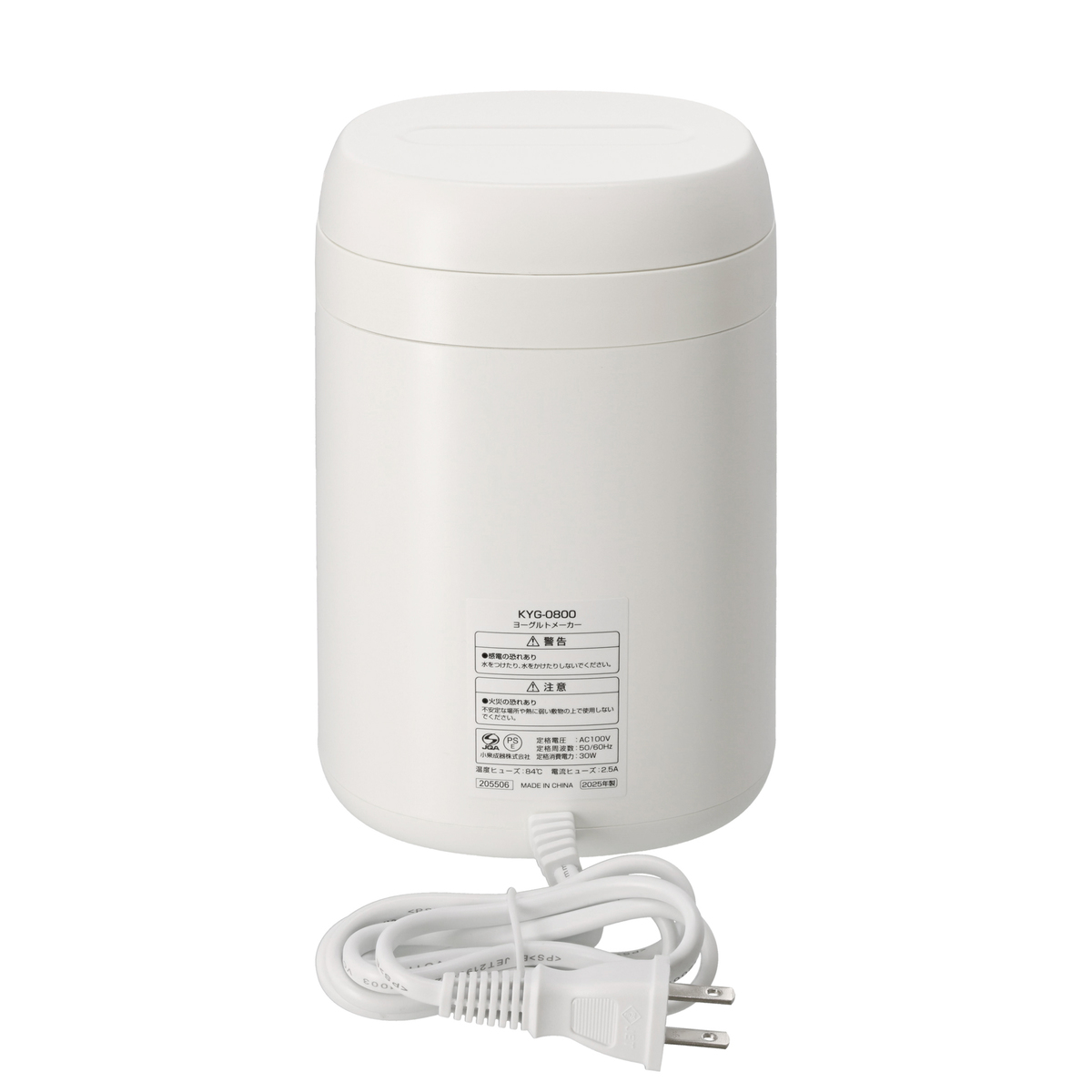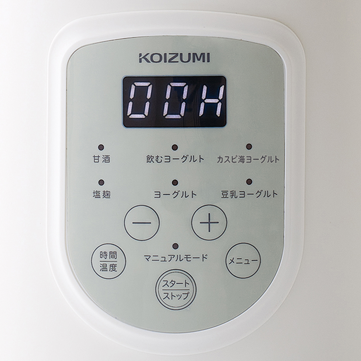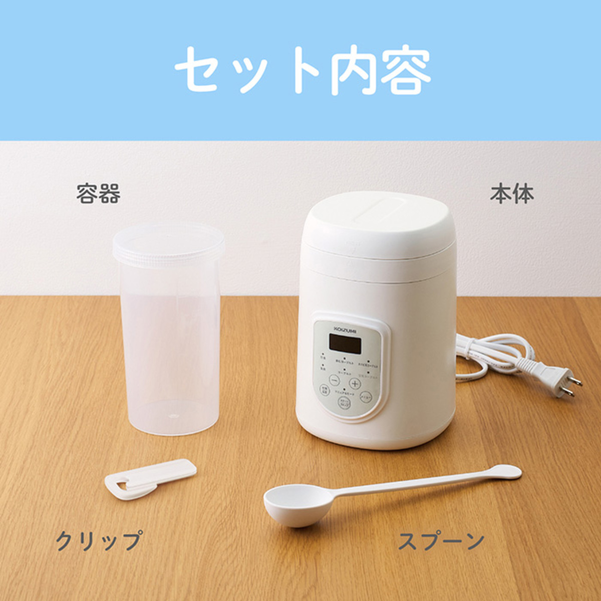 [商品内容] ・本体 ・容器 ・スプーン ・クリップ [サイズ] 約幅14×奥行14×高さ20cm [重量] 約660g [コード長さ] 約1.2m [容量] 800ml(牛乳パック使用時は1000mlまで) [消費電力] 30W [お手入れ] <本体> 1、水またはぬるま湯を含ませたやわらかい布で汚れを拭き取る 2、乾いたやわらかい布で水分を拭き取る <容器、容器ふた、スプーン、クリップ、本体ふた> 1、台所用中性洗剤を含ませたスポンジで洗う 2、水洗いする 3、乾いたやわらかい布で拭く [注意事項] ※使用不可:食器洗い機 ※カスピ海ヨーグルトを作る場合、必ず室温30℃未満の環境で調理する。カスピ海ヨーグルトは、30℃を超えるとうまく作ることができません。暑くなる場所を避け30℃以下の材料を使用して下さい ※牛乳パックで作る場合、天面が平らなもの(クリップで閉じられないもの)は使用しない ※改造はしない。修理技術者以外の人は、分解したり修理をしない ■取り扱い説明を充分にご確認の上、ご使用下さい 【中国製】 [使用方法] <使用前の準備> 器具を熱湯で消毒する ・使用前に容器やスプーンを必ず熱湯消毒する。調理物が腐敗し誤って摂取した場合に食中毒の原因となります ・熱湯消毒する際は、やけどに注意する ・容器に熱湯を入れて振らない。中身が漏れ出てやけどする恐れがあります(付属の容器は密閉容器ではありません) ・煮沸消毒はしない。破損や溶けの原因となります ※雑菌が混じると、ヨーグルトをうまく作ることができません。次のものは素手で直接触れないようご注意下さい ・熱湯消毒した容器・容器ふたの内側 ・熱湯消毒したスプーン(材料に触れる部分) ・材料 また、熱湯消毒した容器やスプーンをふきんなどで拭かないで下さい ・熱湯消毒が必要なもの:容器、容器ふた、クリップ、スプーン、その他計量カップなど材料に直接触れるもの <熱湯消毒の方法> 1、容器・容器ふた・スプーン・クリップを台所用中性洗剤でよく洗う ・洗浄後、洗剤が残らないように水でよく洗い流す 2、耐熱性のおけなどに器具と沸騰させたお湯を入れ、2〜3分つけおきする。または器具に沸騰させたお湯をまんべんなく回しかける ・容器や容器ふたは、内側までしっかり熱湯がかかるようにする ・熱湯消毒後、軽く水を切る ・容器や容器ふたの内側を素手で触ったり、ふきんなどで拭かない <材料を準備する> 付属の容器で作る場合 1、容器に材料を入れ、スプーンでよくかき混ぜる 2、容器のふたを確実に閉める。容器に密閉性はありません。材料を入れた後の容器を振らないで下さい 牛乳パックで作る場合 1、牛乳パックの注ぎ口をすべて開き分量外の牛乳を他の容器に移す ・牛乳パックは、必ず未開封で新しいものを使用する ・牛乳パックの内側を素手で触らない 2、牛乳パックにスターターを入れスプーンでよくかき混ぜる 3、牛乳パックの上部をクリップで確実に閉じる 使い方 1、材料を入れた容器、または牛乳パックを本体にセットし本体ふたをかぶせる 1000mlの牛乳パックを使用する場合は、本体ふたを取説を参照に引き伸ばす 2、電源プラグをコンセントに差し込む。主電源が入ります ・表示部に「888」と表示された後「00H」と表示されます ・すべてのランプが一度点灯し消灯します 3、[メニュー]ボタンを押す ボタンを押すたびに、メニューランプが順番に点滅します 使用したいメニューのランプが点滅するまで繰り返しボタンを押す メニューを選択すると、自動で時間と温度が設定されます(マニュアルモードを除く) マニュアルモードで作る場合 I、時間を設定する(1時間〜48時間) II、温度を設定する(25℃〜70℃) 4、スタート/ストップボタンを押す 調理が始まり選択したメニューのランプが点灯します 表示部には調理の残り時間が一時間刻みで表示されます 調理が終了すると表示部に「00H」と表示されて選択したメニューのランプが点滅します ・途中で調理を終了する時:スタート/ストップを押す。洗濯したメニューのランプが点滅し調理が停止します。再度スタート/ストップを押すと再開します 5、調理終了後は電源プラグをコンセントから抜く 6、容器/牛乳パックを本体から取り出し早めに冷蔵庫に入れる