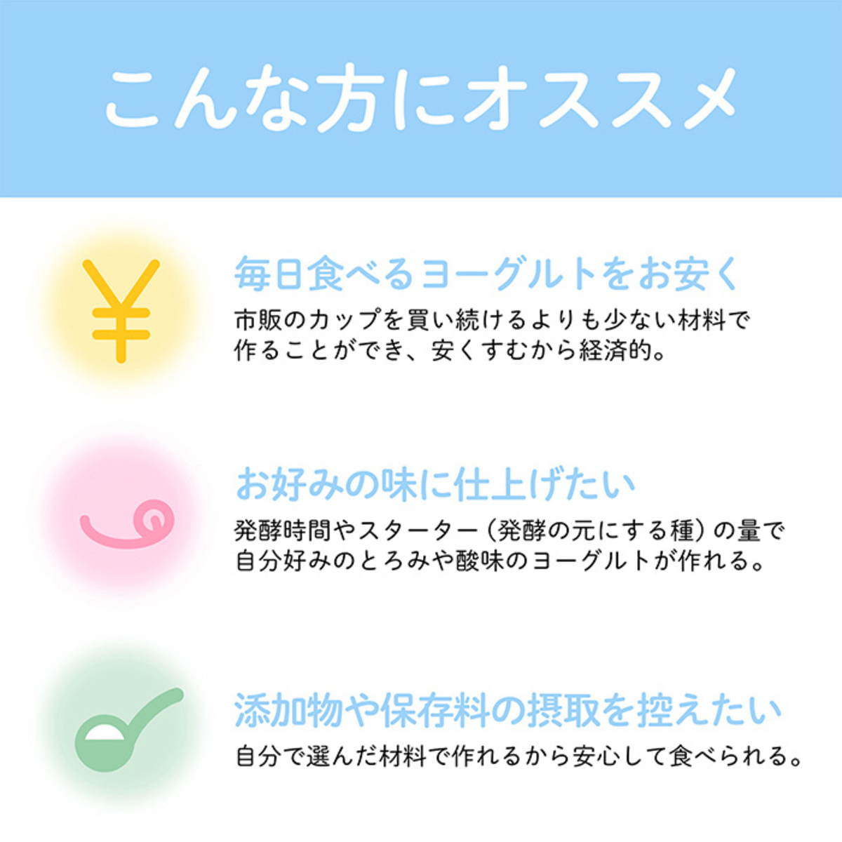 コンパクトなサイズ(*1)のヨーグルトメーカー。キッチンで邪魔になりにくく、簡単操作で手軽に発酵食品が作れます。市販のヨーグルトなどをスターター(*2)としてヨーグルトなどを作ることができる調理家電です