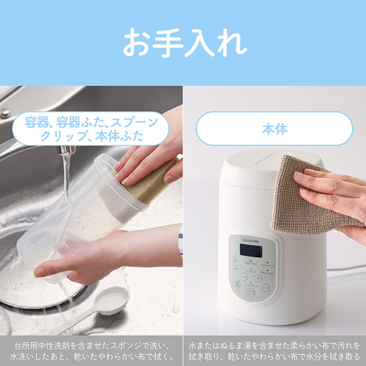容器、容器ふた、スプーン、クリップ、本体のふたは水洗いが可能。洗った後は乾いたやわらかい布で拭いて下さい
