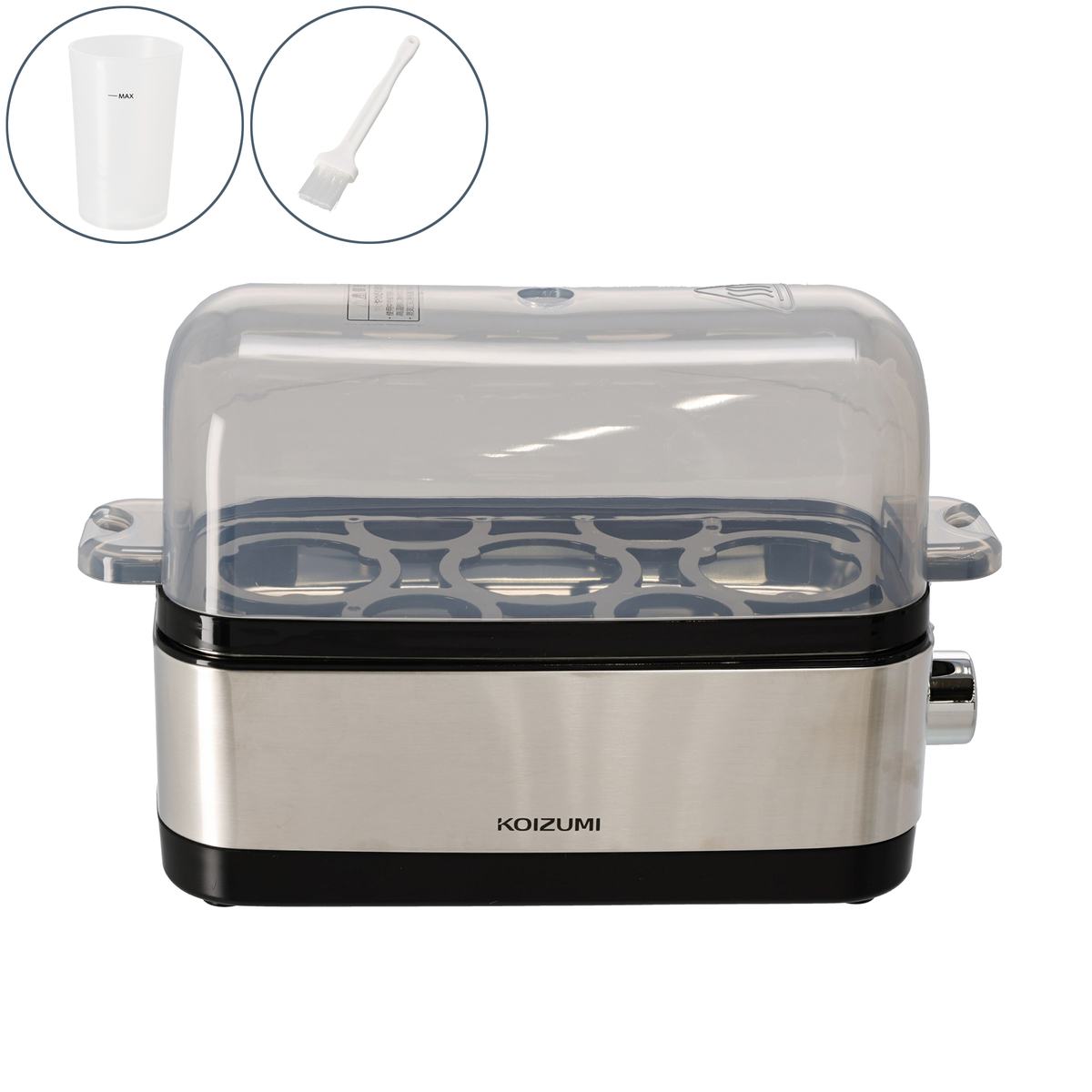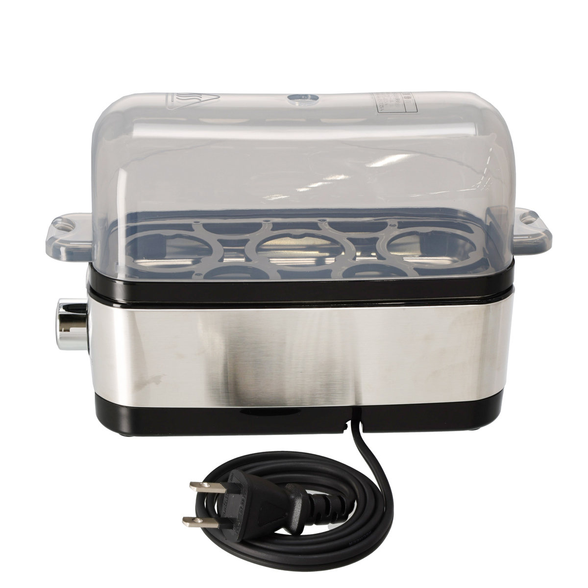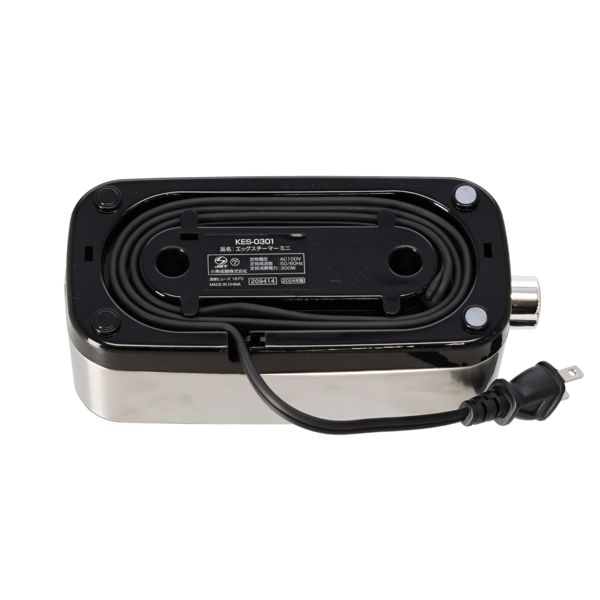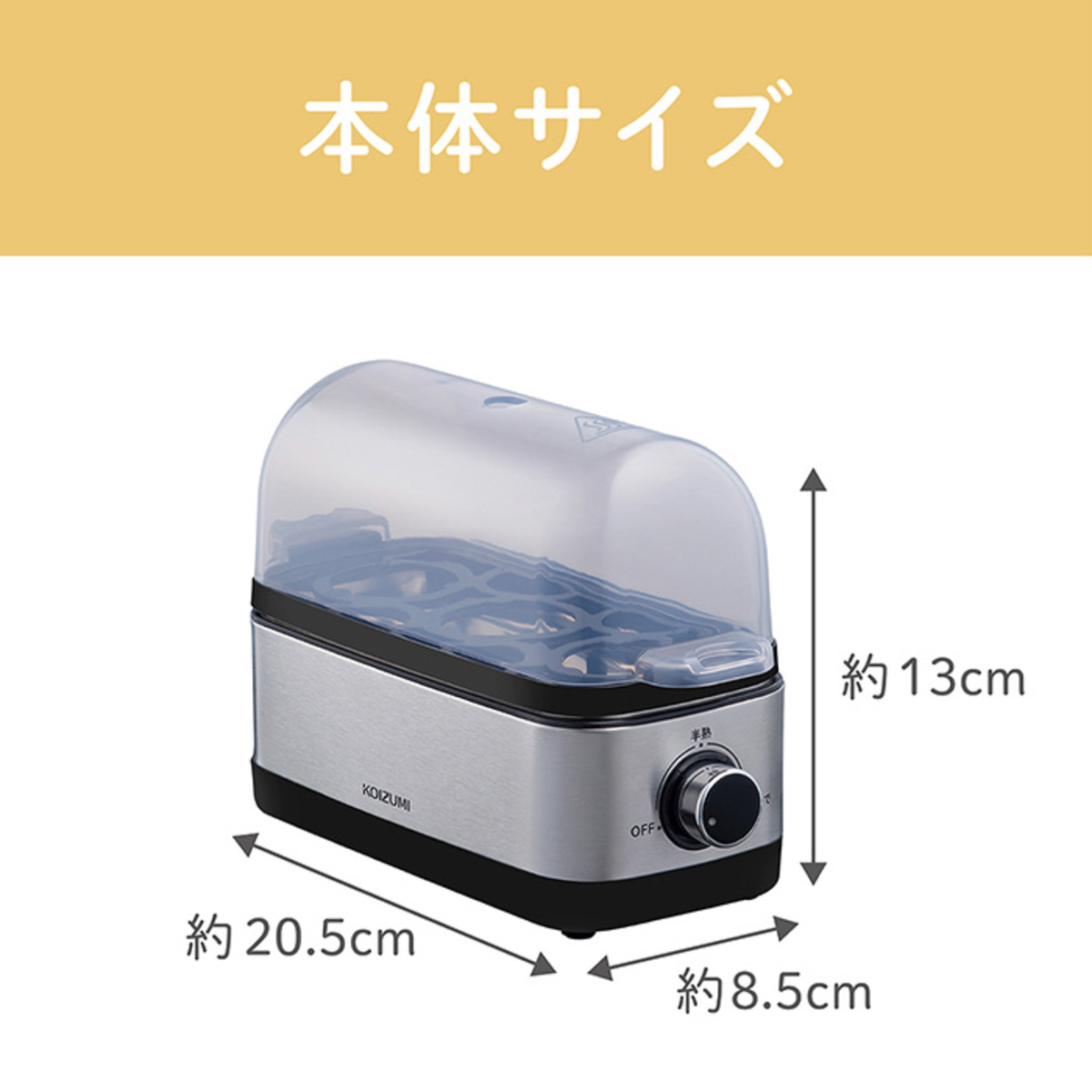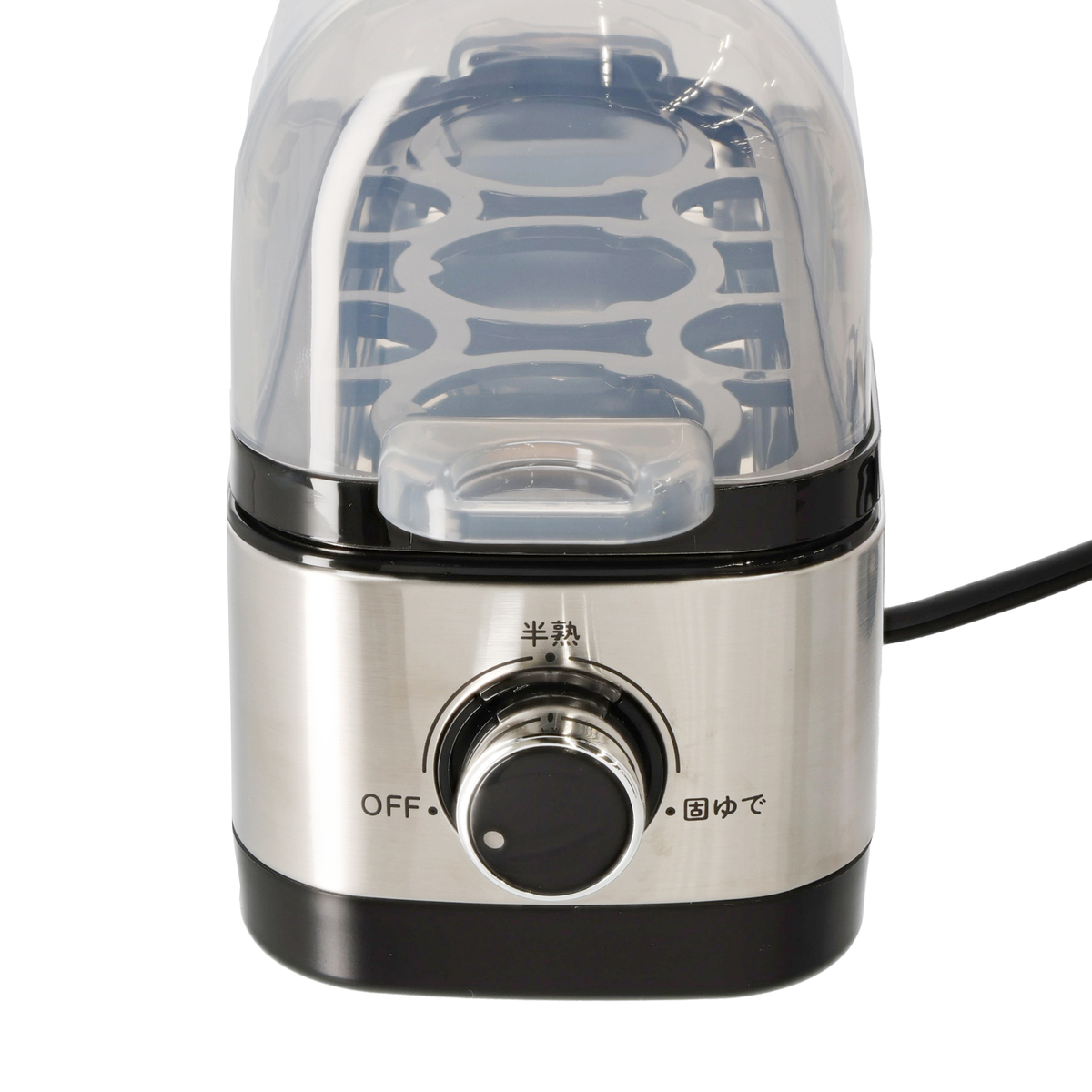 [商品内容] ・本体 ・計量カップ ・掃除用ブラシ [サイズ] 約幅8.5×奥行20.5×高さ13cm [重量] 約500g [コード長さ] 約1m [消費電力] 300W [注意事項] ※水以外の物を入れて調理しない。塩などを入れると故障の原因となります ■取り扱い説明を十分にご確認の上、ご使用下さい 【中国製】 [使用方法] 使用前の準備: 1.スイッチを[OFF]にあわせる 2.電源コードをみぞに通す 電源コードが余っているときは、本体裏側に巻き付けて長さを調節してください 電源コードは二重に巻かないでください 3.電源プラグをコンセントに差し込む 主電源が入り、「ピー」という音が鳴ってランプが短く赤点灯します 調理する: 1.計量カップに水を適量入れる 計量カップの「MAX」線(約95ml)を目安に水を入れてください ※たまごの仕上がりや個数にかかわらず「MAX」線まで水を入れてください 2.ふたを開け、水受けに計量した水を入れる 水をこぼさないように注意してください 仕上がりに影響が出るため、湯は入れないでください 3.本体にエッグスタンド、市販のたまご、ふたをセットする たまごのとがった方を下に向けて置きます たまごのまるい方に小さな穴をあけると、調理後にたまごの殻がむきやすくなります たまごを1個や2個調理する場合は、エッグスタンドのお好みの場所に置いてください 調理するたまごについて: 必ず次のたまごを使用してください 新鮮なもの ひびが入っていないもの 半熟たまごを調理するときは、冷蔵庫から取り出した冷たいもの 一度に複数のたまごを調理するときは同じ大きさのもの 4.スイッチを回す ゆで加減に応じてスイッチを回します ランプが赤く点灯し、調理が開始されます 約5〜16分の間で、お好みのゆで加減に合わせて調理できます [半熟]に合わせると約10分、[固ゆで]に合わせると約16分調理します ※温泉たまごは調理できません ランプが赤く点滅し、「ピピッ」という音が4回鳴ったときは:本体が空焚きになりたまごが正しく調理できていません 1、スイッチを[OFF]に戻す 2、本体と水受けの水が十分に冷めてから、いったん水を捨てる 3、計量カップで水の量を正しく量りなおし、水受けに入れる 4、ゆで加減に応じて、再度スイッチを回す 5、調理が終わったら、スイッチを[OFF]に戻す 調理が終わると、ランプが消灯し、しばらくたってから「ピー」という音が4回鳴ります 6、たまごを取り出す 本体が熱くなっていますので、ふた取っ手以外には手を触れないでください ふたを開けるときは、中から熱い蒸気が出ますので、顔を近づけないでください 本体が熱いうちに、続けて調理しないでください 調理したたまごを流水にさらして冷ましてください ※流水にさらさないと余熱で設定したゆで加減より固くなることがあります 使用後は電源プラグをコンセントから抜いてください/水受けに残ったお湯は、十分に冷めてから捨ててください/お湯は、図のようにスイッチの反対側から流してください/お手入れは必ず本体が十分に冷めてから行ってください