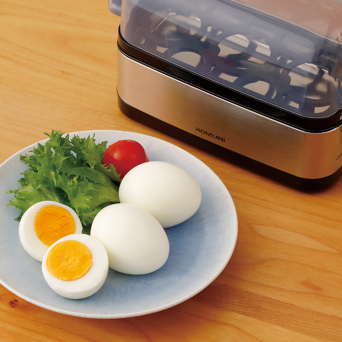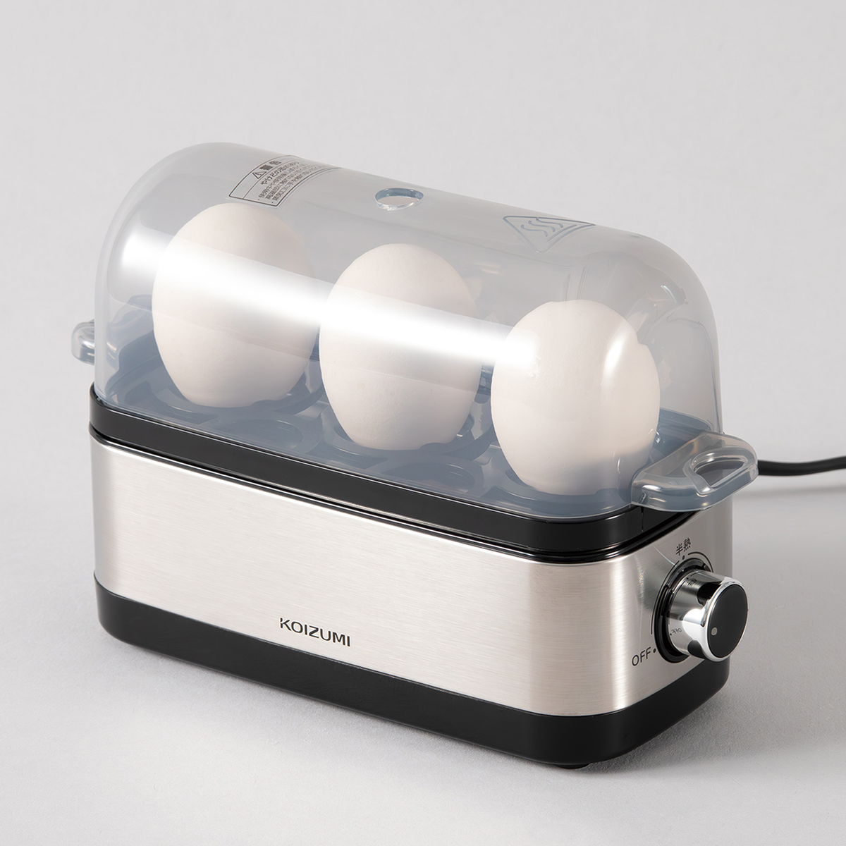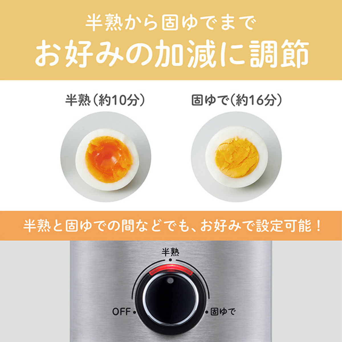 水とたまごをセットしてダイヤルを回すだけ。火を使わず、固ゆでたまごも半熟たまごも調理可能なエッグスチーマーです。調理時間の目安は、半熟たまごが約5〜10分、固ゆでたまごが約10〜16分です