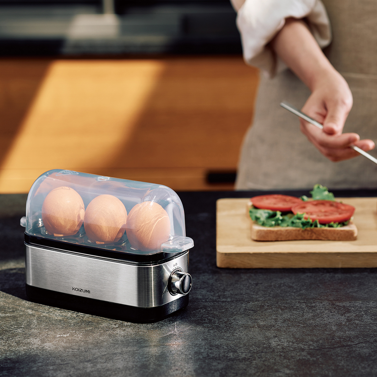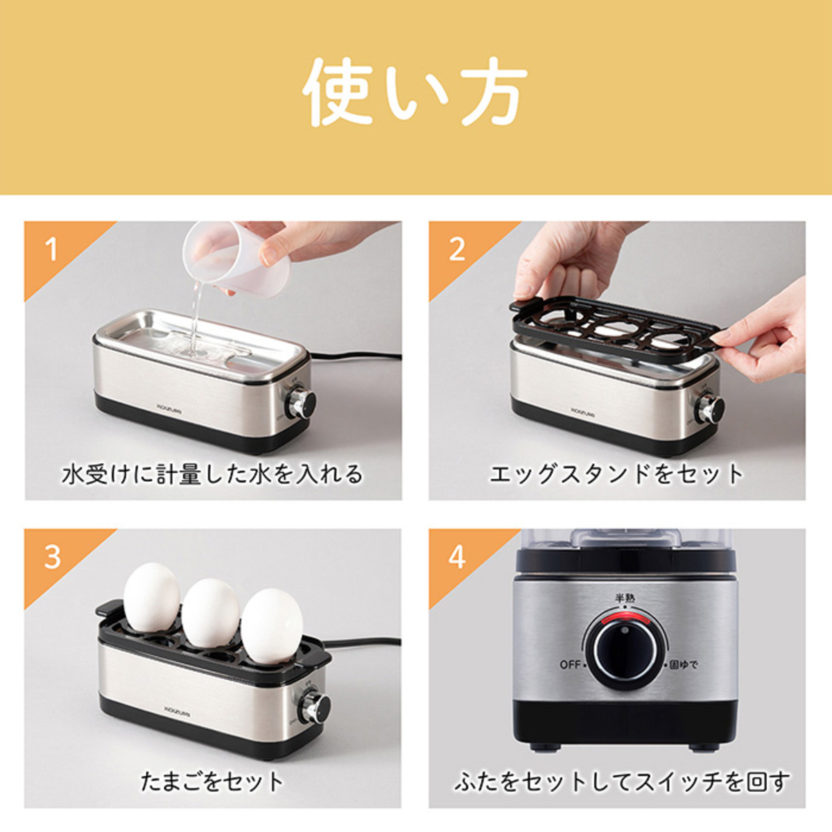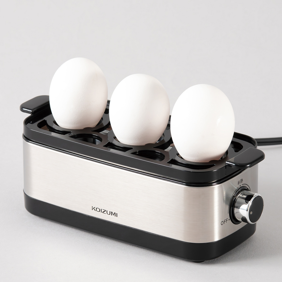 水とたまごをセットしてダイヤルを回すだけ。火を使わず、固ゆでたまごも半熟たまごも調理可能なエッグスチーマーです。調理時間の目安は、半熟たまごが約5〜10分、固ゆでたまごが約10〜16分です