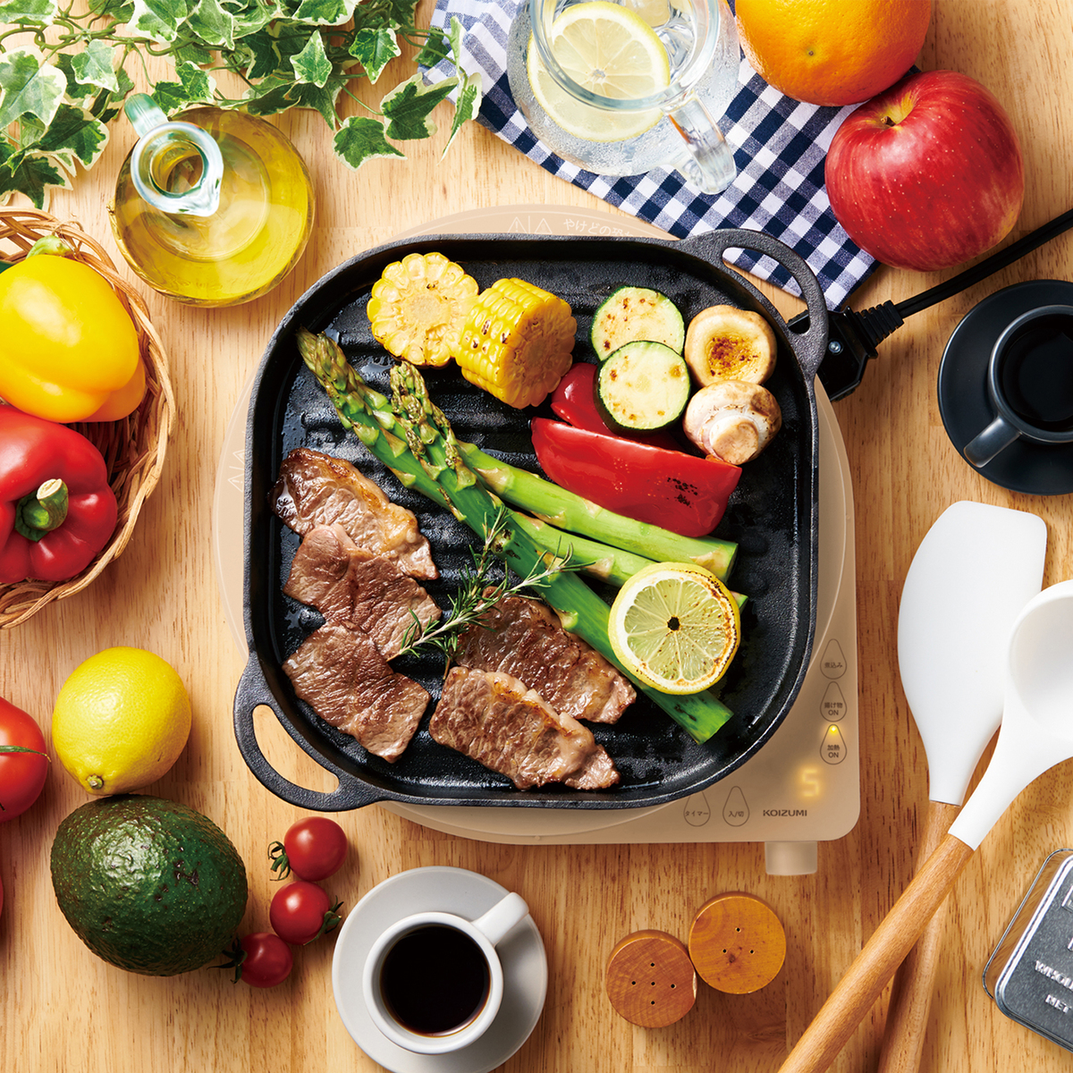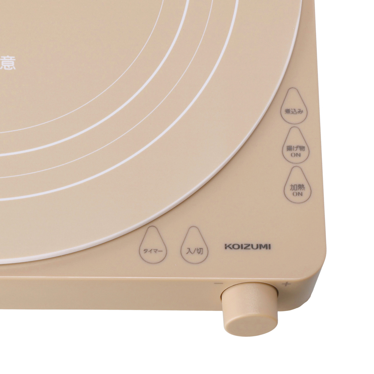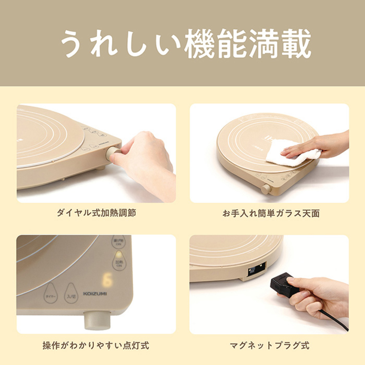 円型フォルムが特徴のIHクッキングヒーター。1400Wのハイパワーで、煮込みや揚げ物(*1)、加熱調理まで幅広く対応します。本体は約280(W)×295(D)×50(H)mmと卓上でも使いやすいサイズ感です