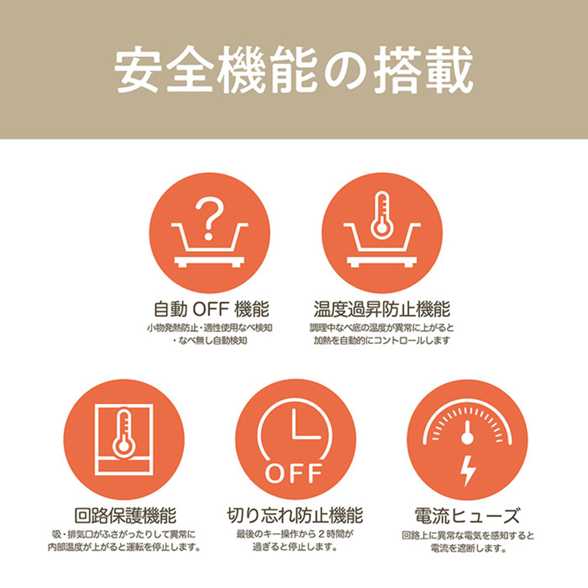 [商品内容] ・本体 ・電源コード [サイズ] 約幅28×奥行29.5×高さ5cm [重量] 約1.8kg [コード長さ] 約1.8m [消費電力] 1400W (急速加熱時) [安全装置] 自動OFF機能(小物発熱防止・適性使用なべ検知・なべ無し自動検知)、温度過昇防止機能、回路保護機能、切り忘れ防止機能(2 時間)、電流ヒューズ ■取り扱い説明を充分にご確認の上、ご使用下さい 【中国製】 [注意事項] ※定格15A以上のコンセントを単独で使用する ※電源プラグは清潔にする。刃および刃の取付面にほこりが付着している場合は拭き取る ※電源プラグはコンセントの奥までしっかり差し込む ※電源プラグ、器具用プラグを乳幼児が誤ってなめないようにする ※AC100V以外の地域では使用しない(日本国内専用) ※電源コードを傷付けたり、破損したり、加工したり、無理に曲げたり、引っ張ったり、ねじったり、束ねて使用しない。また重い物を載せたり、はさみ込んだり、排気口や高温部に近づけたりしない ※電源コードや電源プラグ・器具用プラグが傷んだり、コンセントの差し込みがゆるいときは使用しない ※器具用プラグ先端にピンやごみを付着させない(器具用プラグ先端はマグネット式です) ※ぬれた手で、電源プラグ・器具用プラグを抜き差ししない ※改造はしない。修理技術者以外の人は分解したり修理しない ※異常、故障時は直ちに使用を中止する ※調理器具の扱いに不慣れな方や子どもだけで使用させたり、乳幼児の手の届く場所で使用しない ※トッププレートに衝撃を加えない ※吸気口や排気口などのすき間にピン、針金、金属物などの異物を入れない ※業務用として使用しない。また、不特定多数の人が使う場所に置かない ※本体を水につけたり、水をかけたりしない ※本体は、可燃性の壁や棚などから離して設置する ※吸気口や排気口をふさがない ※次のような場所では使用しない ※揚げ物調理中はそばを離れない ※いため物、焼き物など加熱調理中はそばを離れない ※予熱の火力は弱めにし、加熱しすぎない ※電源プラグを抜くときは、電源コードを持たずに、必ず先端の電源プラグを持って引き抜く ※専用の電源コード以外を使ったり、電源コードを他の機器に転用しない ※使用時以外は電源プラグをコンセントから抜く ※調理以外の目的に使用しない ※トッププレートに10kgを超える物をのせない ※本体になべをのせたまま持ち運ばない ※不安定な場所で使用しない ※鉄板など金属を使用したテーブルなどの上では使用しない。また、アルミシートの上で使用しない ※他の器具(ガスコンロなど)であらかじめ加熱した油を使用しない ※油煙が多く出たら電源を切る ※揚げ物調理中は飛び散る油に気を付ける ※空だきしたり加熱しすぎない ※缶詰・アルミ箔・カセットボンベ・スプレー缶など、なべ以外の物をのせない ※なべの下に紙、ふきん、汚れ防止カバーなどを敷かない ※トッププレートやなべ底がぬれた状態で加熱しない ※電源コードを引っかけない ※なべやフライパンはトッププレートの上でこすらない ※なべはトッププレートの中央にのせて使用する ※ふきこぼれに注意する ※なべやフライパンを予熱するときは、油をあらかじめ入れておく ※レトルト食品やアルミパック食品などを加熱するときは、なべの中に必ず水を入れる ※トッププレートに酸の強い食品が付いた場合は、早めに拭き取る ※突沸(噴き出し)現象に注意する ※使用中や使用後は、トッププレートが高温になっているため触れない ※心臓用ペースメーカーをお使いの方は、本製品のご使用にあたって医師とよく相談する ※本体の上方や周囲に可燃性の壁や棚があるときは、取説に記載の距離を離してください。前面および側面の片側は開放してください ※吸気口や排気口をふさがないようにしてください ※水平で安定した場所で使用してください