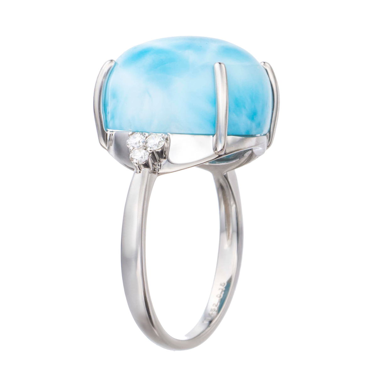 明るい海の波模様が印象的なラリマーを、14.00ctUPの大きさであしらったリング。プラチナの枠で停めた爽やかなデザインで、サイドには合計6石のダイヤモンドを添えました