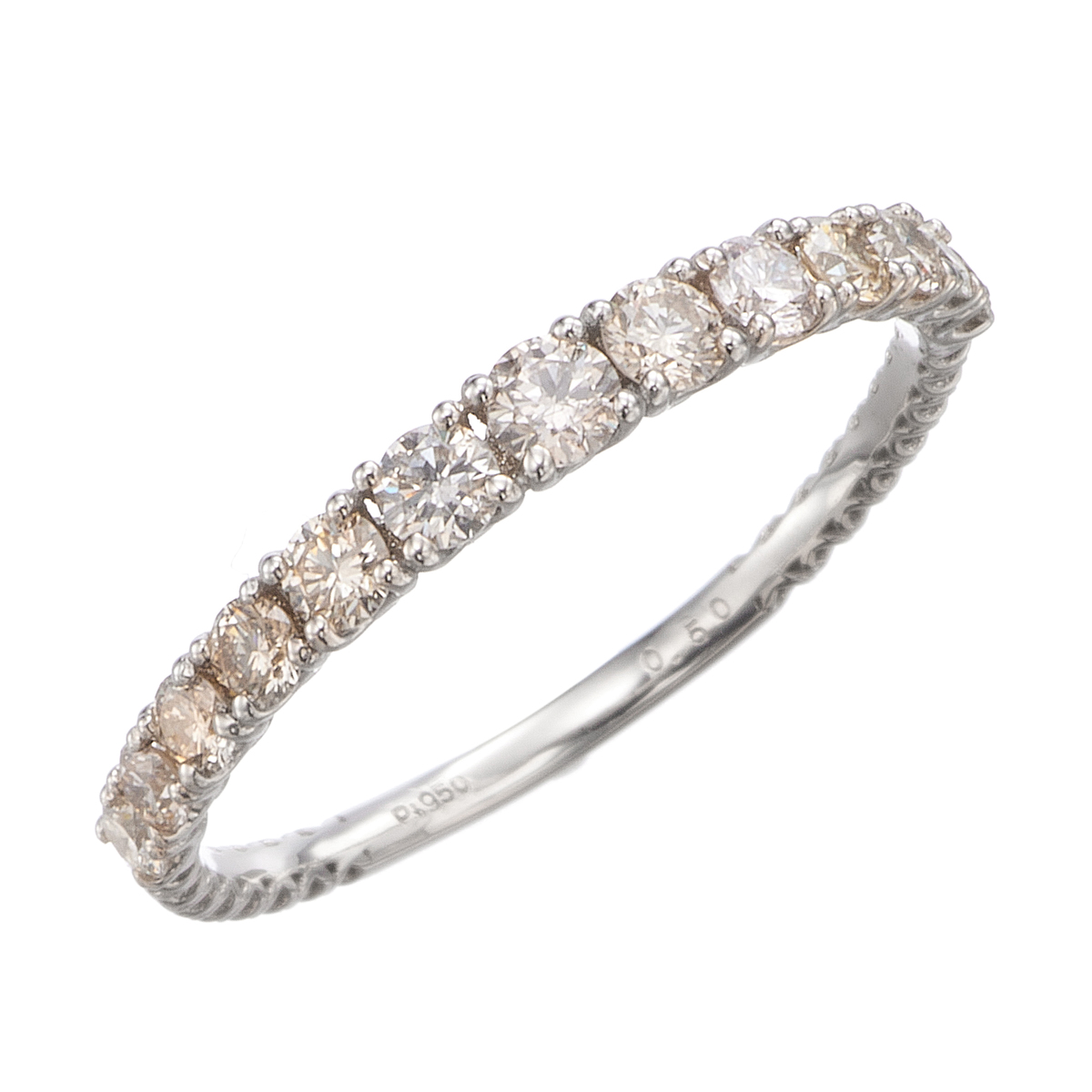 大きさの異なるダイヤモンドをグラデーション状に並べたハーフエタニティリング。他のリングと重ね着けしても素敵で、さまざまなシーンでお手元を上品に演出します。地金にはプラチナを採用しました
