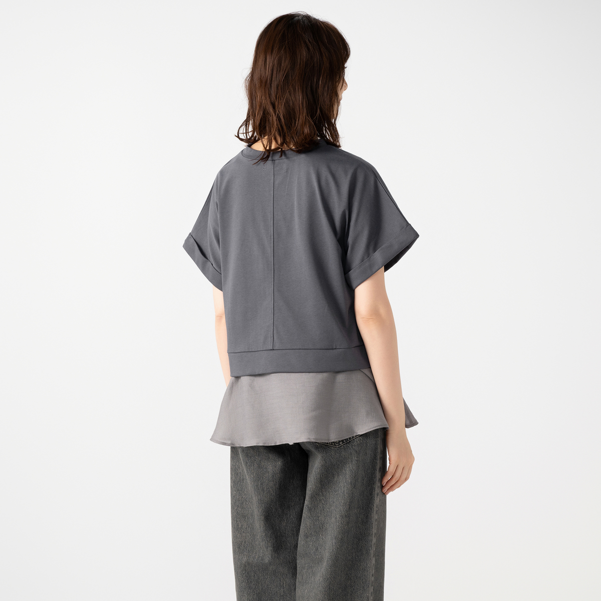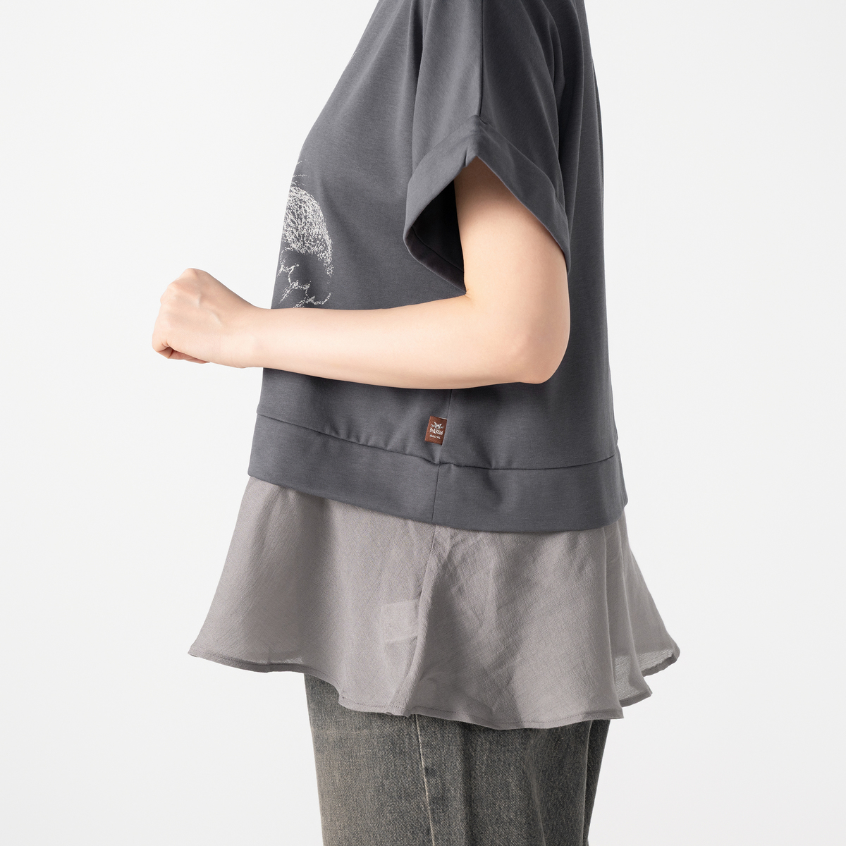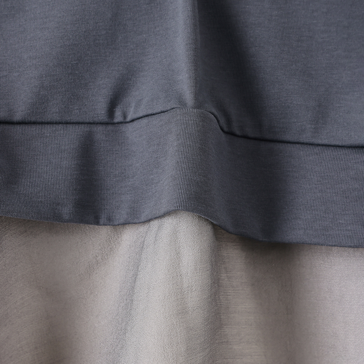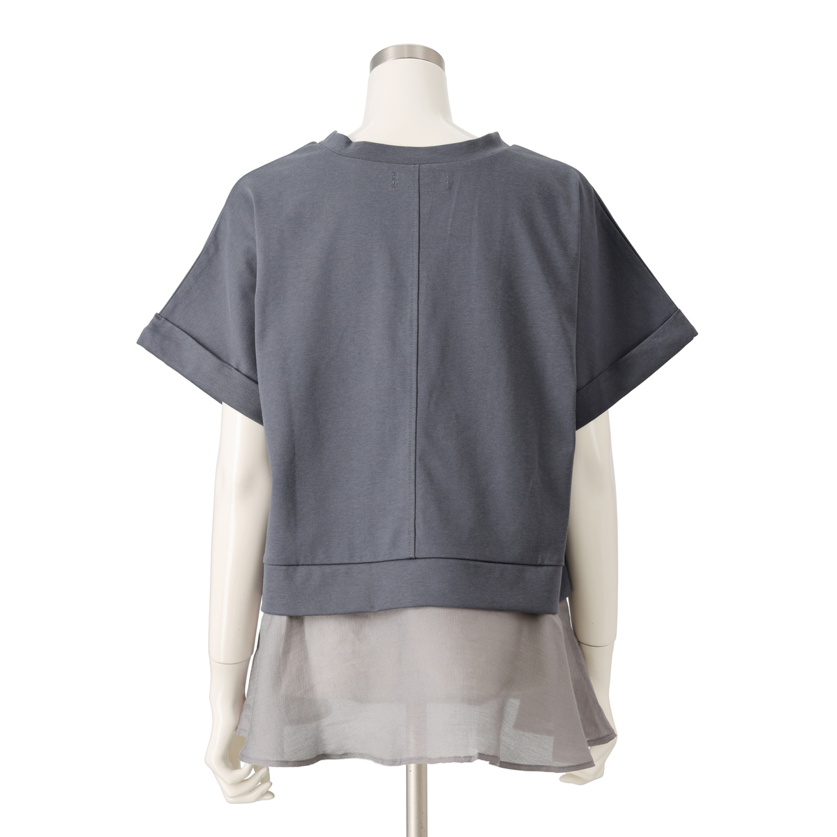 Tシャツ部分は双糸(そうし)で編み、適度なハリ感とコシで上品な目面です。ペプラムはレーヨン・ポリエステル・シルク混の軽やかなシアー素材で、ほのかな透け感が、爽やかさを引き立てます
