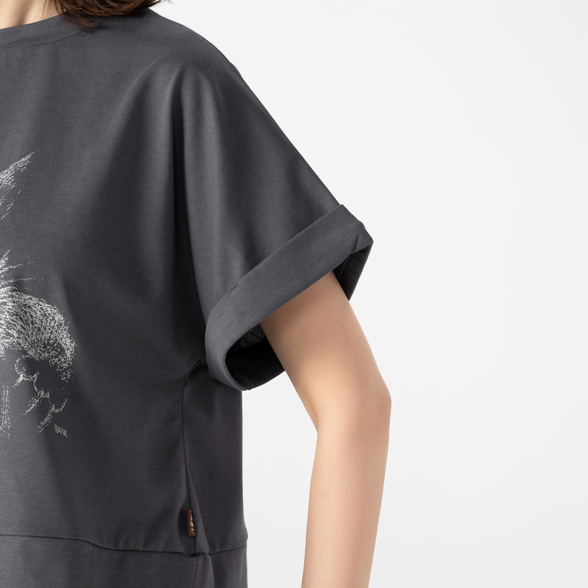 池田あきこ先生のタッチを忠実に再現したペン画風プリントを、水性顔料の優しい色合いで表現しました。ウエストのシアー素材の切り替えが全体に軽やかさと抜け感を与える、おしゃれなデザインです