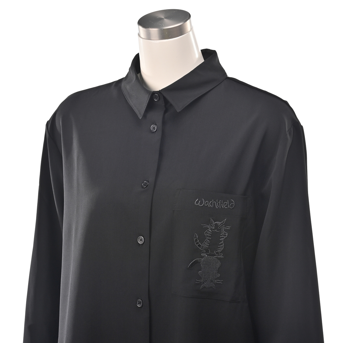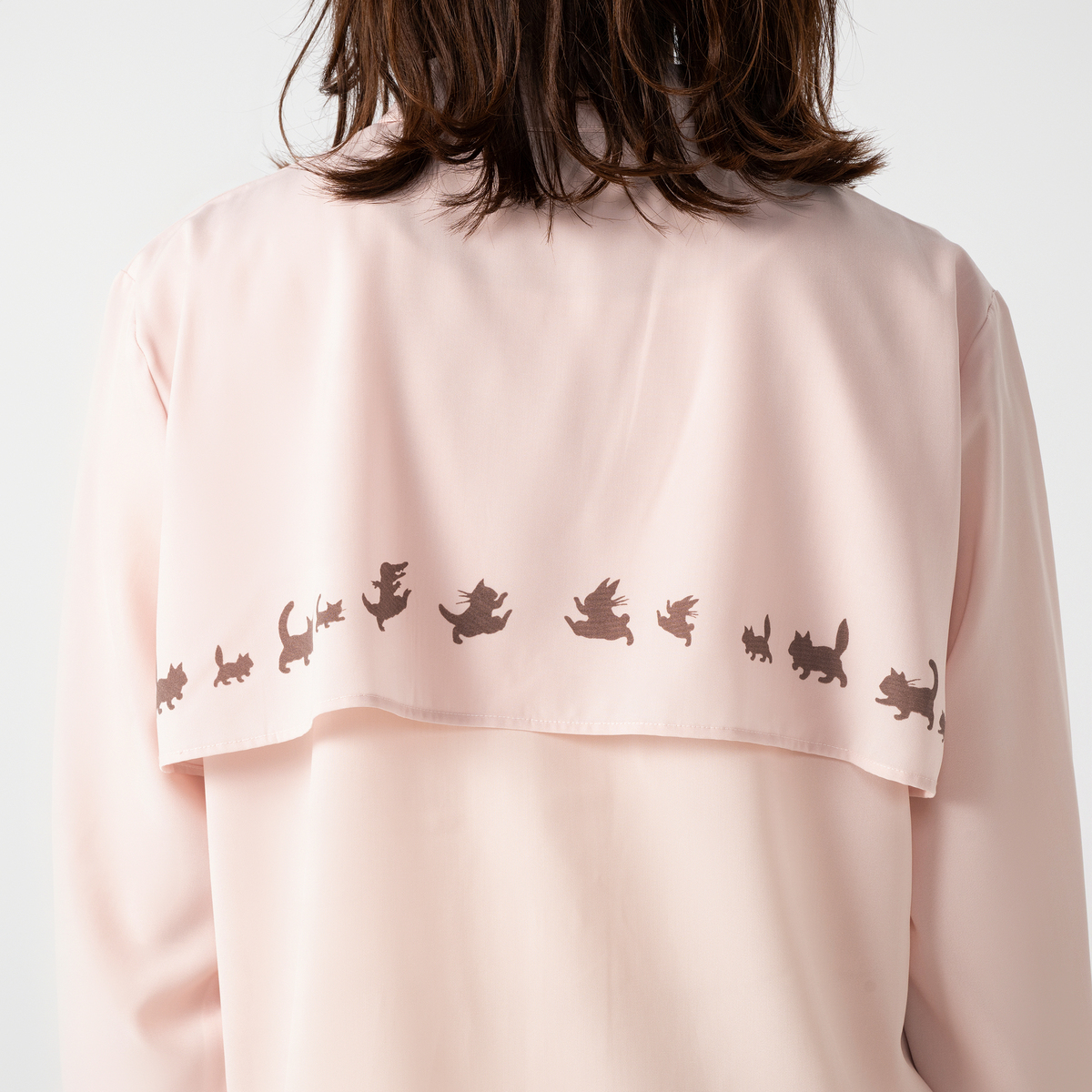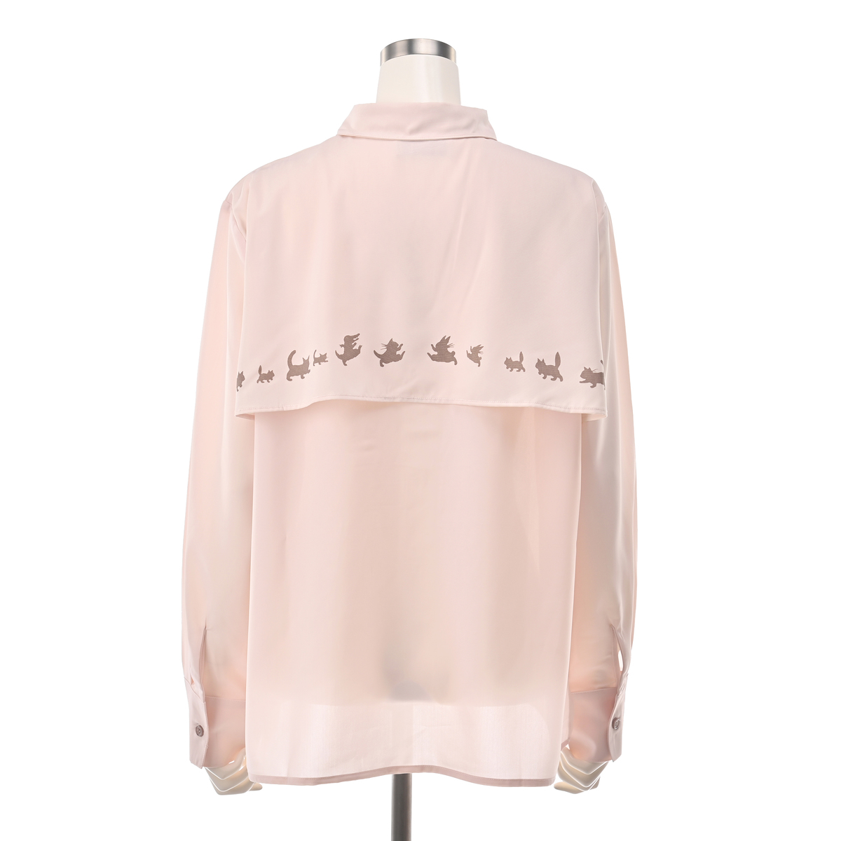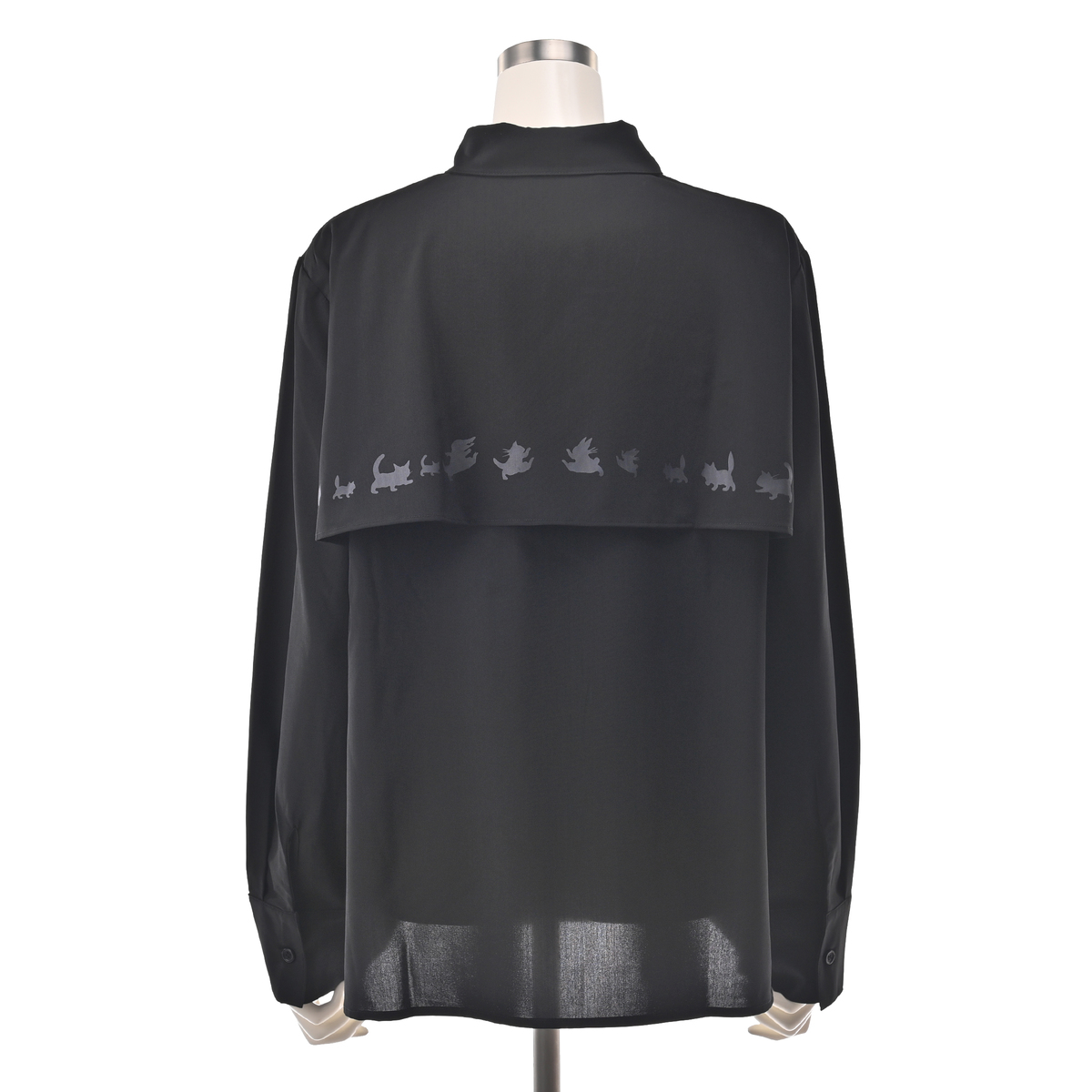 『チビクロ・パーティ』の世界観を表現したプリントが魅力的なシャツ。前ポケットには物語の主人公のダヤンと、その影であるチップを刺繍。さらに後ろ身頃のヨーク切替部分には、動物たちの影がプリントされ、物語のワンシーンを思い起こさせます