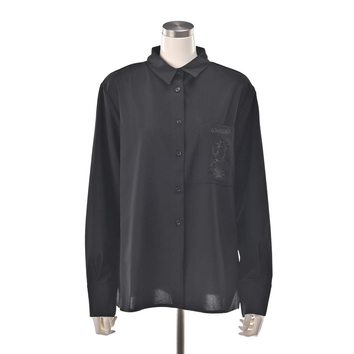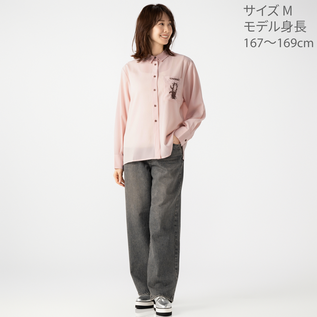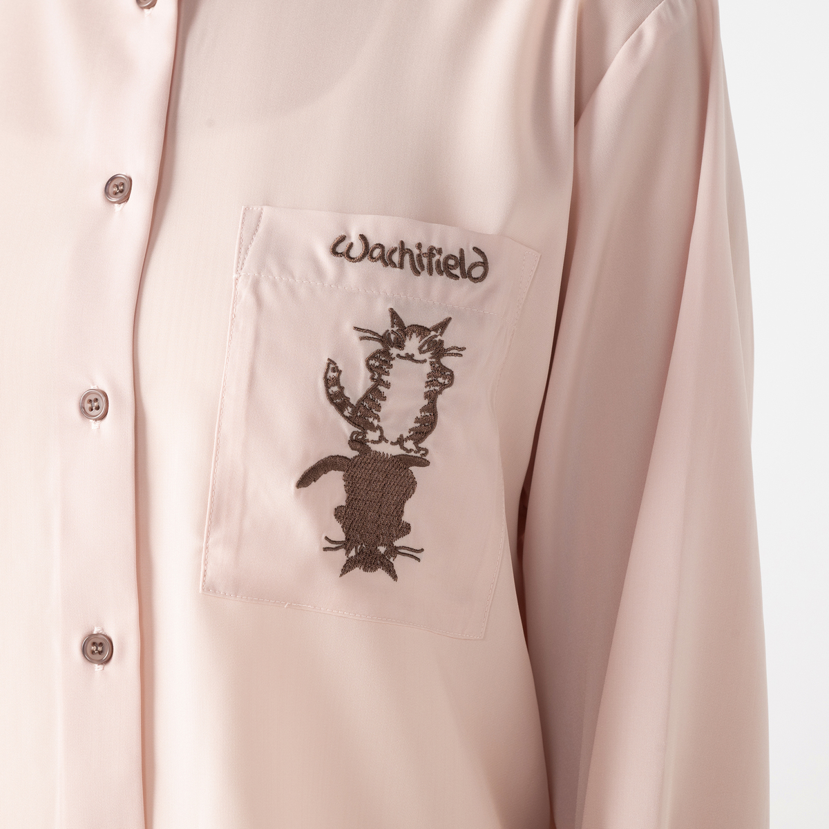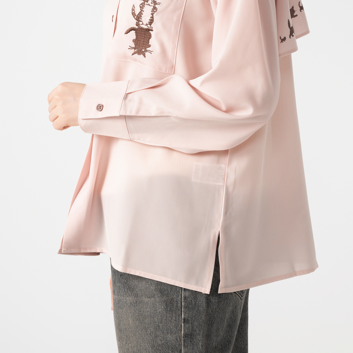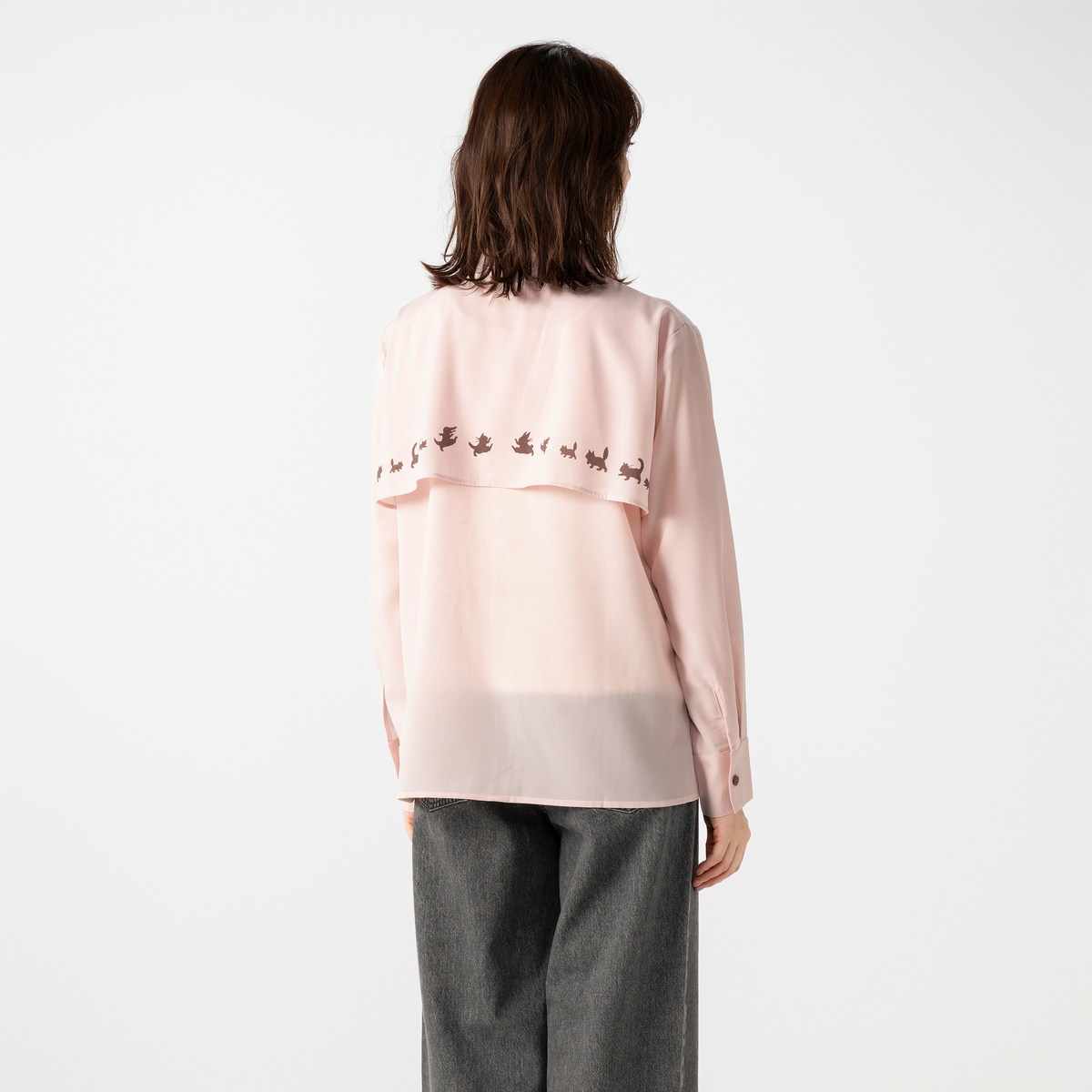 『チビクロ・パーティ』の世界観を表現したプリントが魅力的なシャツ。前ポケットには物語の主人公のダヤンと、その影であるチップを刺繍。さらに後ろ身頃のヨーク切替部分には、動物たちの影がプリントされ、物語のワンシーンを思い起こさせます