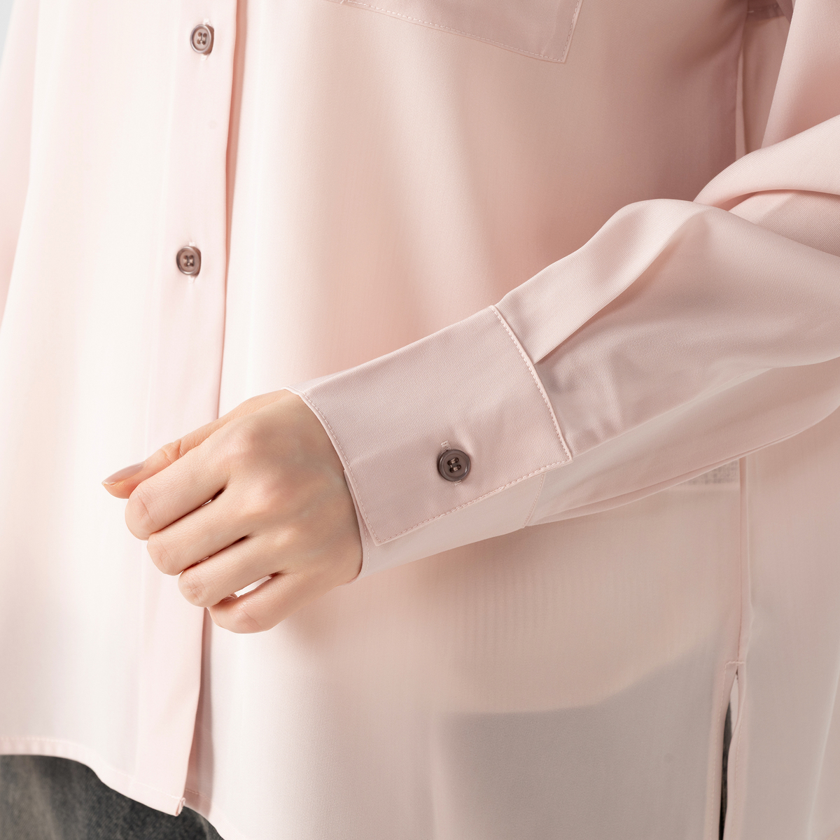 肌にべたつきにくい素材が汗ばむ季節でも快適さを保ちます。ご自宅で手軽に洗えるので、デイリーに活躍。バックレイヤードのゆったりシルエットが体型を自然にカバーします