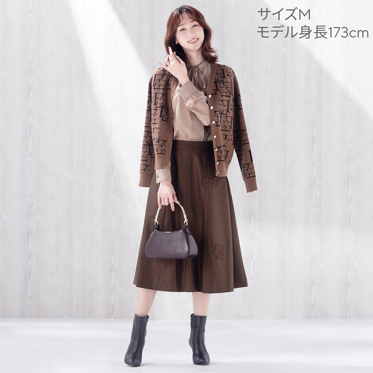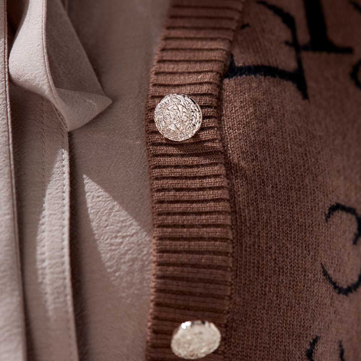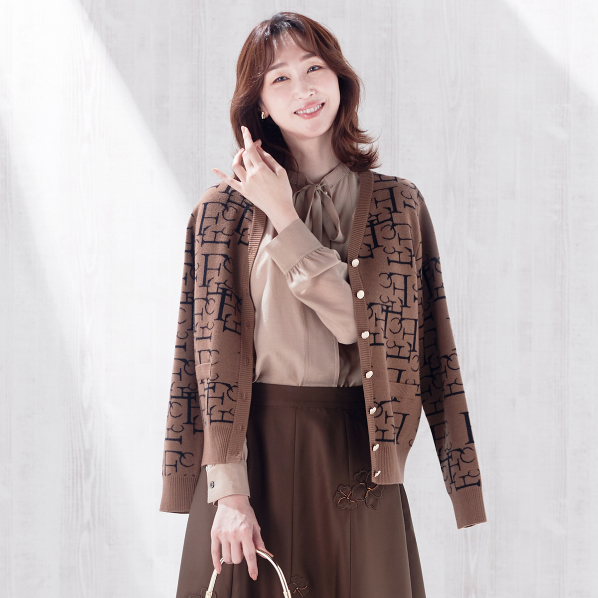 オーストラリア原産のメリノウールを使用したニットカーディガン。ブランド名をアレンジしたグラフィック柄が目を引くデザインで、Vネックが襟元をすっきりと見せてくれます。前左右には飾り箱ポケット付きです