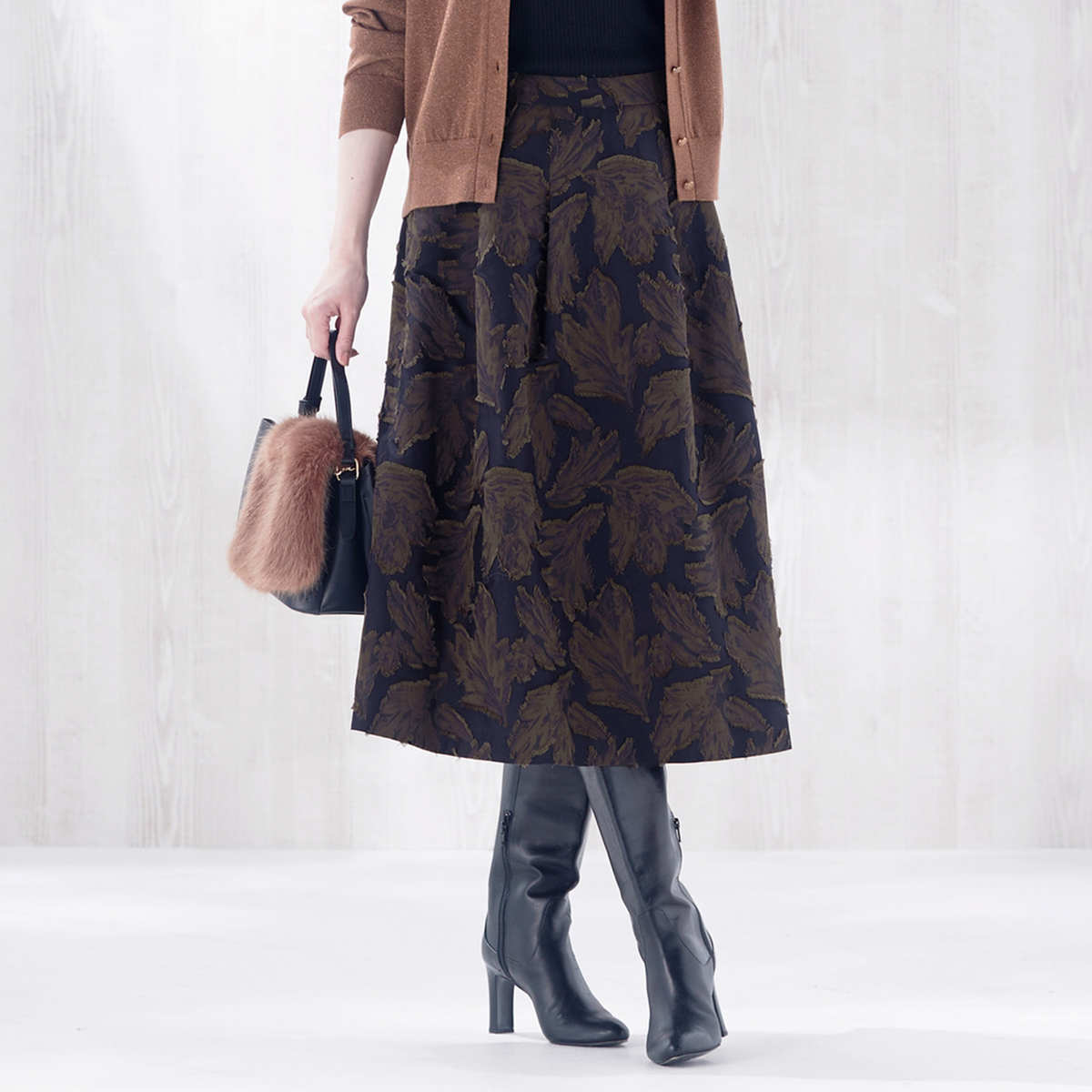 切り花を表現したジャガード生地が、エレガントな雰囲気を演出するAラインスカート。ヒップまわりを自然にカバーしながら、程よい広がりが歩きやすさと動きやすさを叶えます