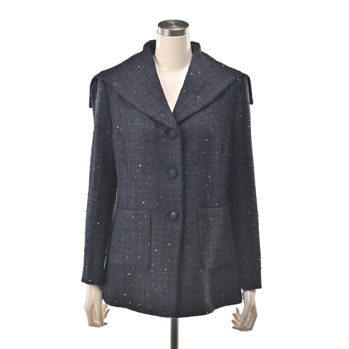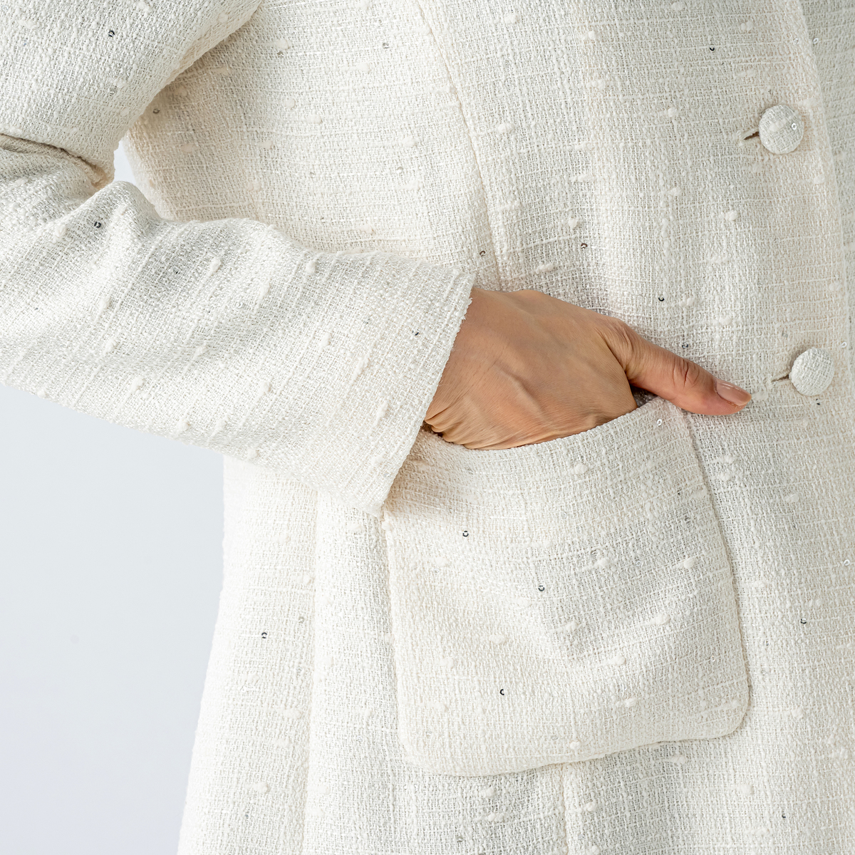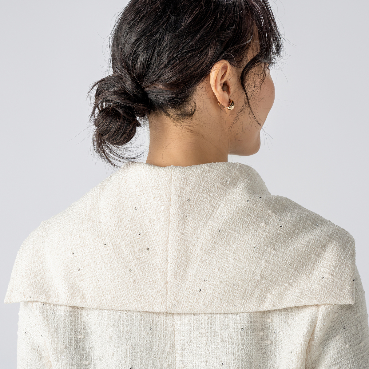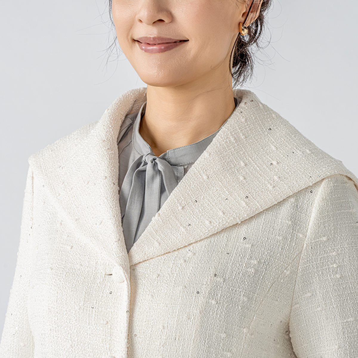スパンコールを織り込んだポリエステルツイードが控えめな華やかさを添えるジャケット。ざっくりとした素材感が洗練された印象を与えます