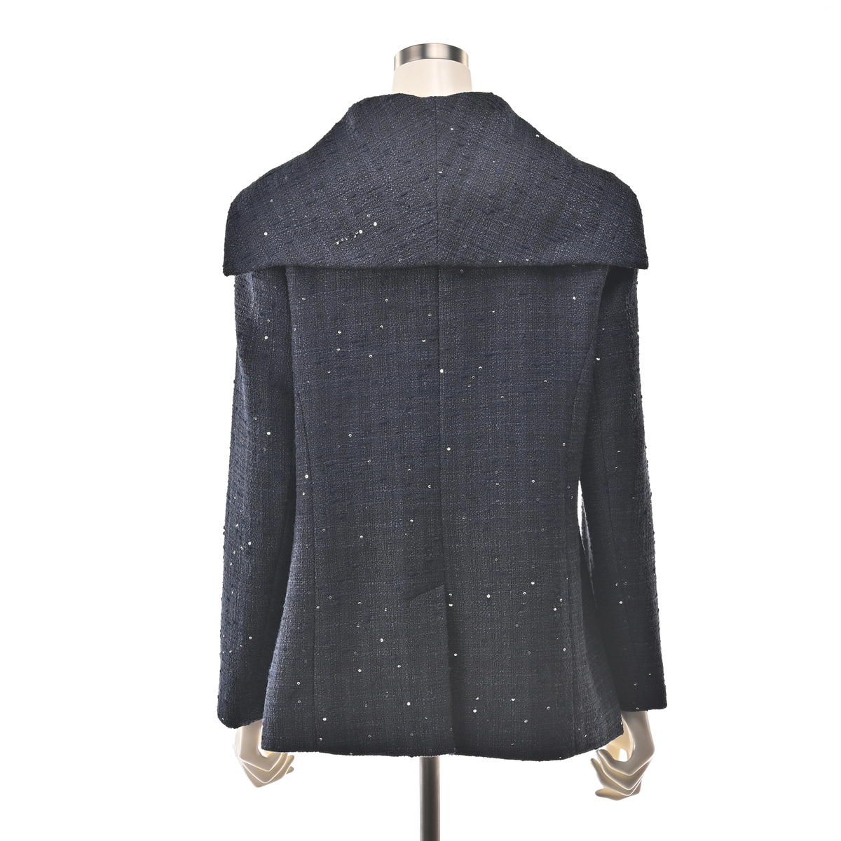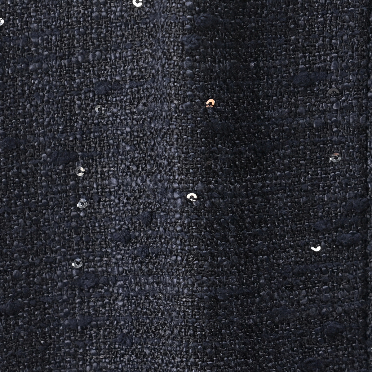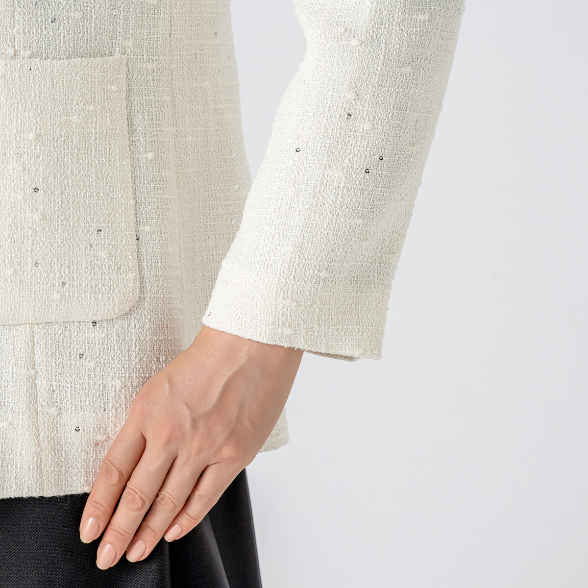 スパンコールを織り込んだポリエステルツイードが控えめな華やかさを添えるジャケット。ざっくりとした素材感が洗練された印象を与えます