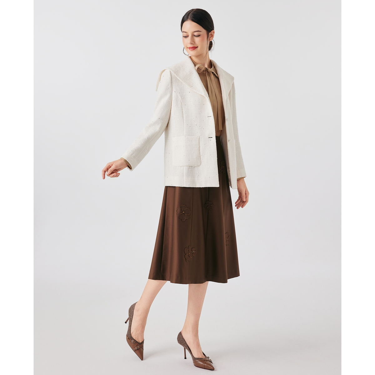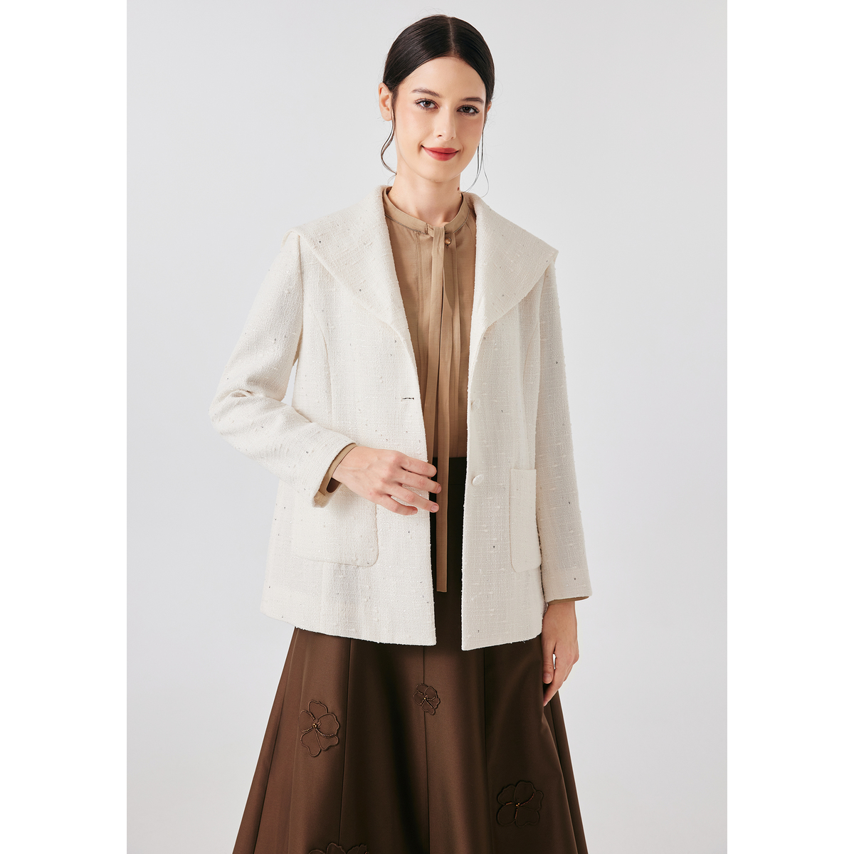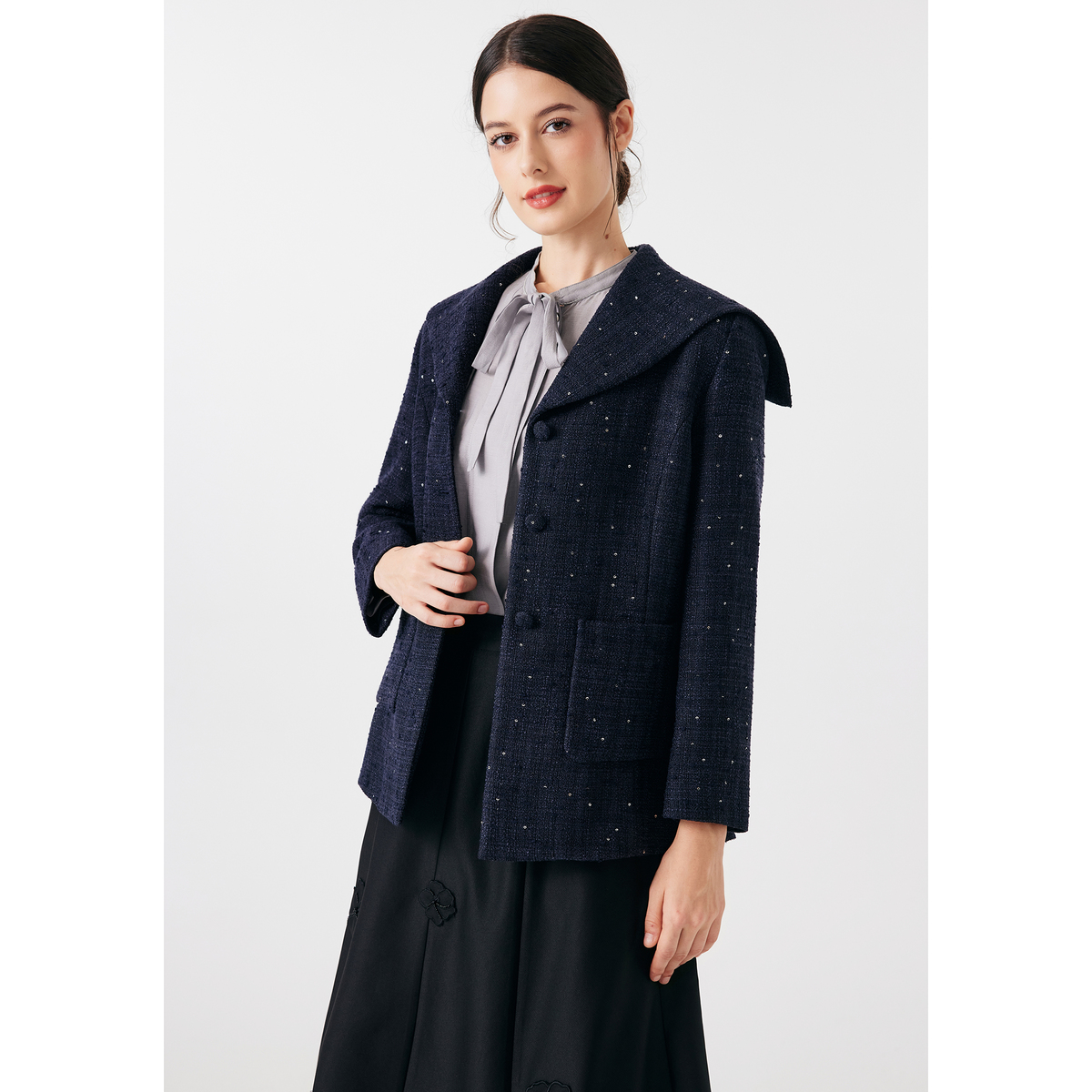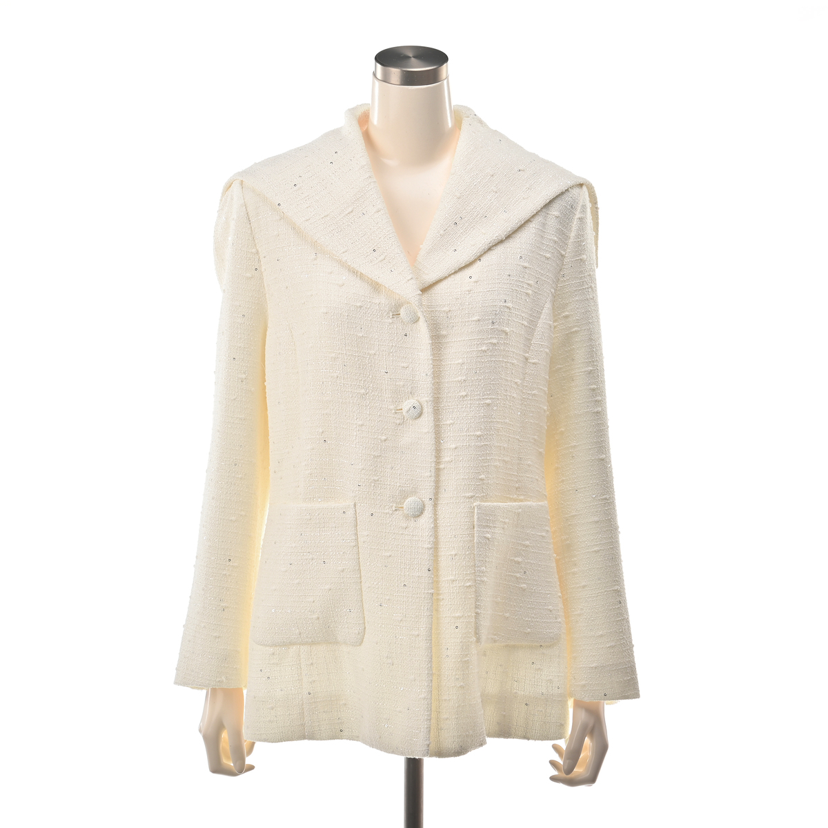 スパンコールを織り込んだポリエステルツイードが控えめな華やかさを添えるジャケット。ざっくりとした素材感が洗練された印象を与えます