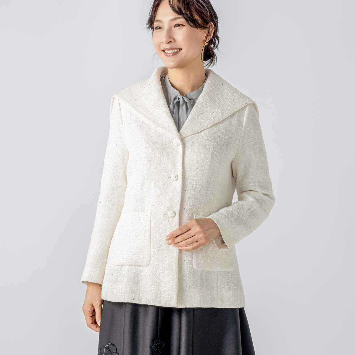 スパンコールを織り込んだポリエステルツイードが控えめな華やかさを添えるジャケット。ざっくりとした素材感が洗練された印象を与えます
