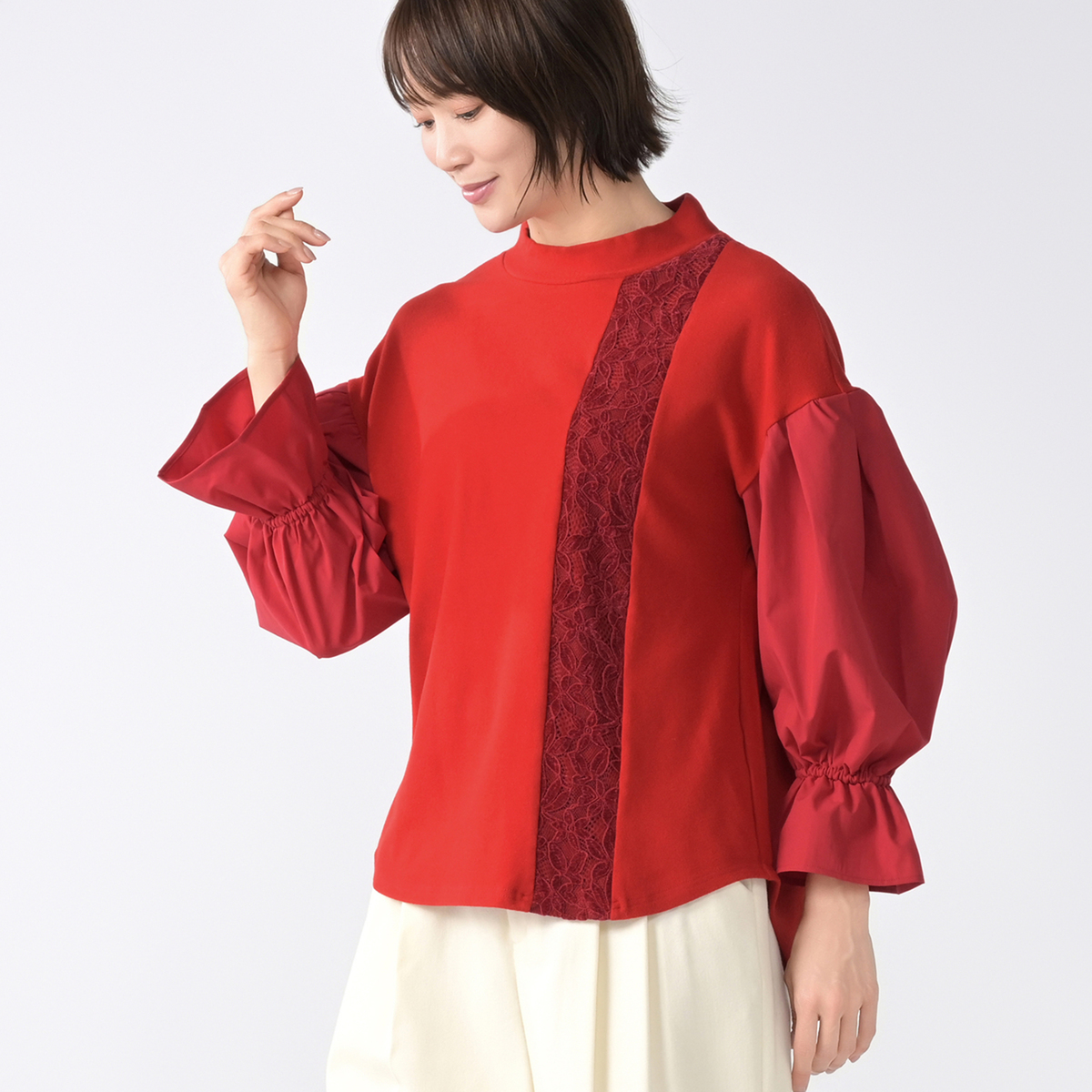袖にタフタ素材を使用した異素材ミックスのニットソープルオーバー。さらにフロントの切替部分にはレースをあしらい、華やかなポイントになっています