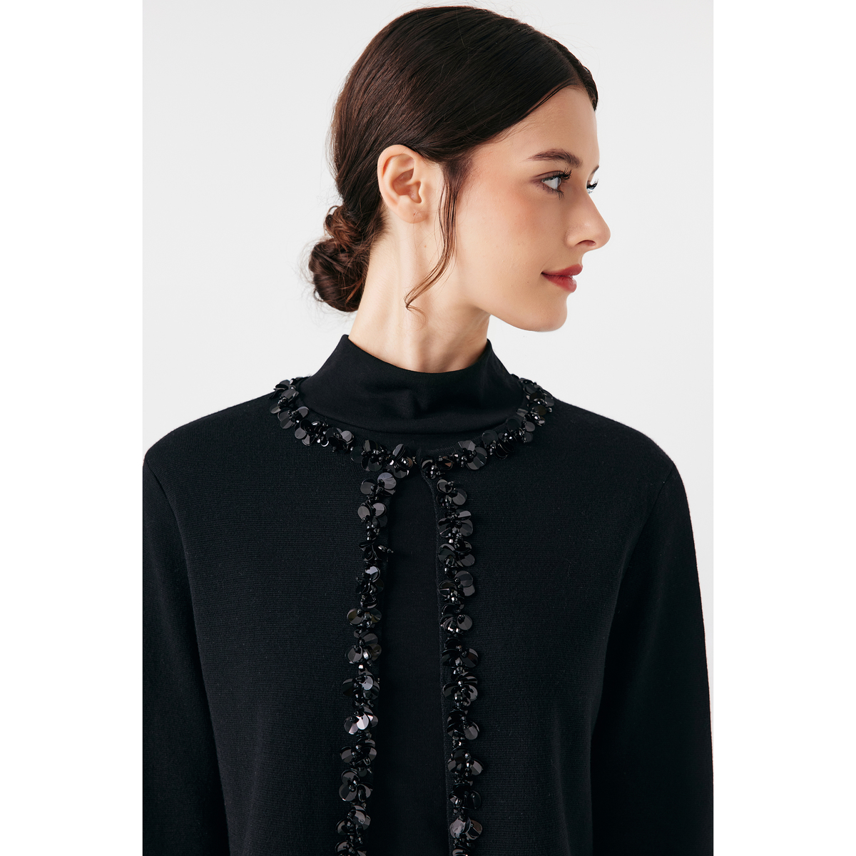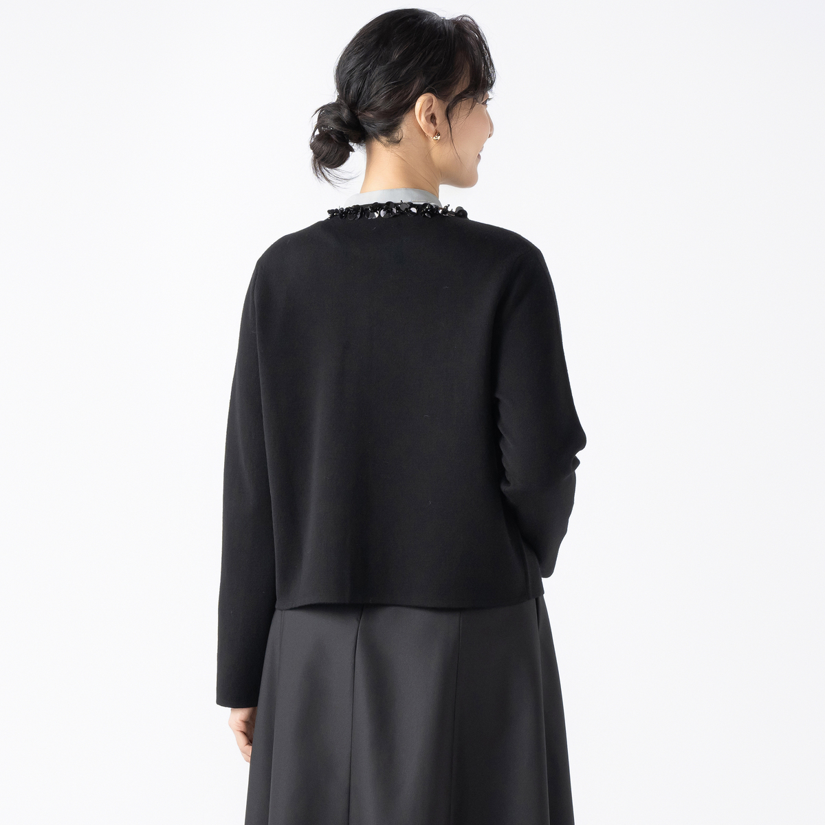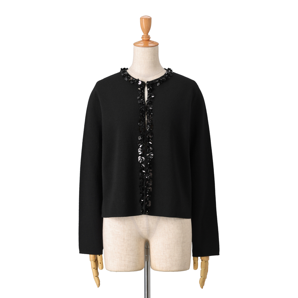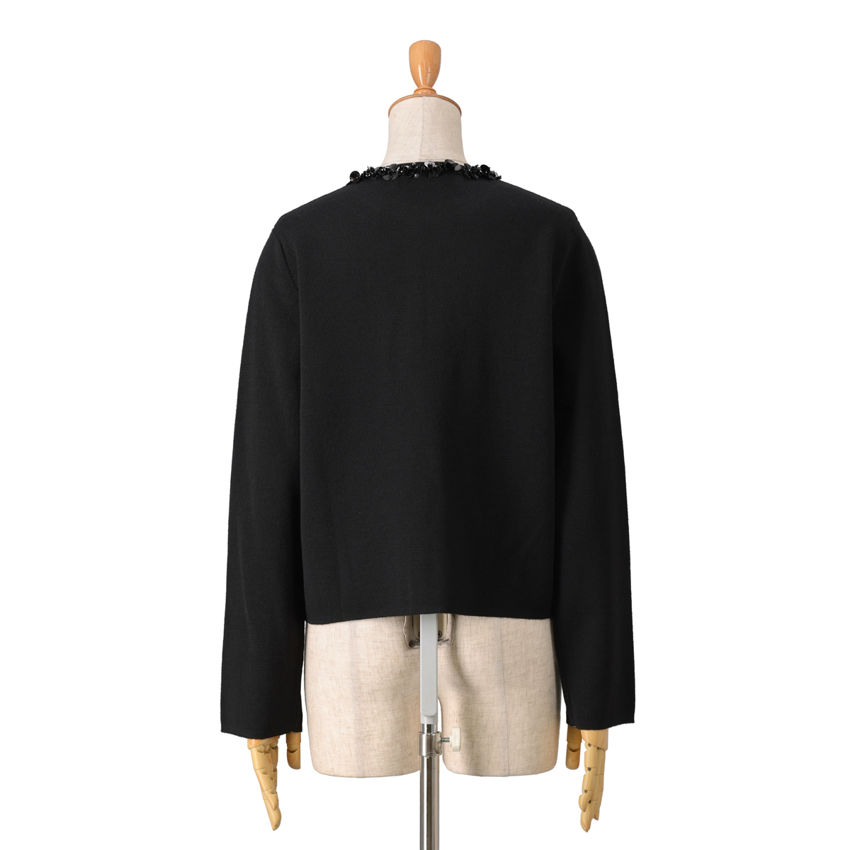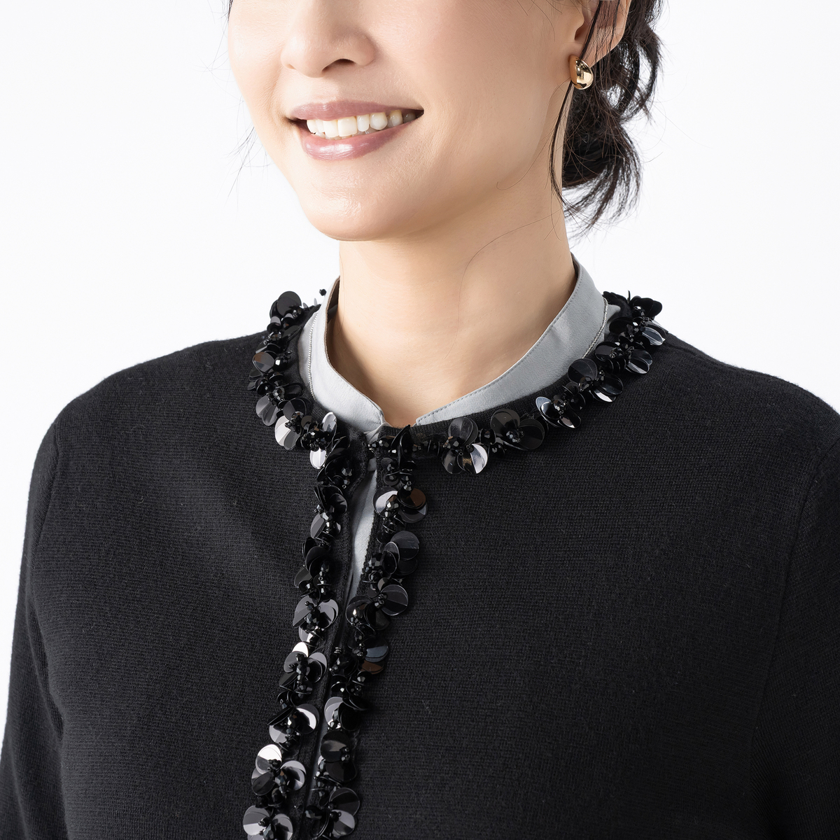 煌めくスパンコールがアクセントになったメリノウールのミラノリブジャケット。襟元と前立て部分には、完全手作業でビーズの装飾を施しています