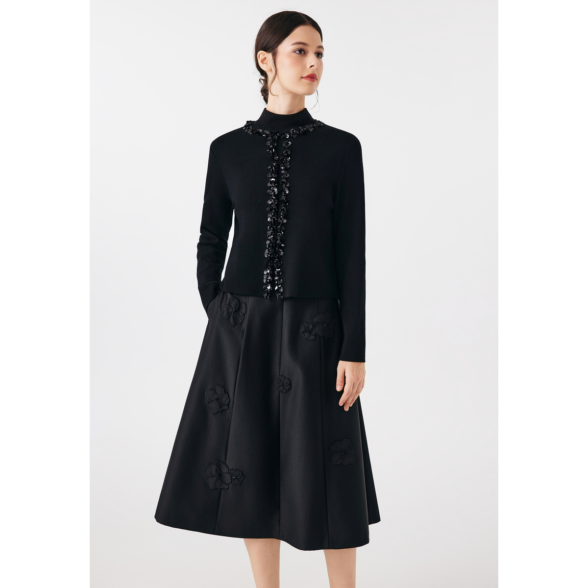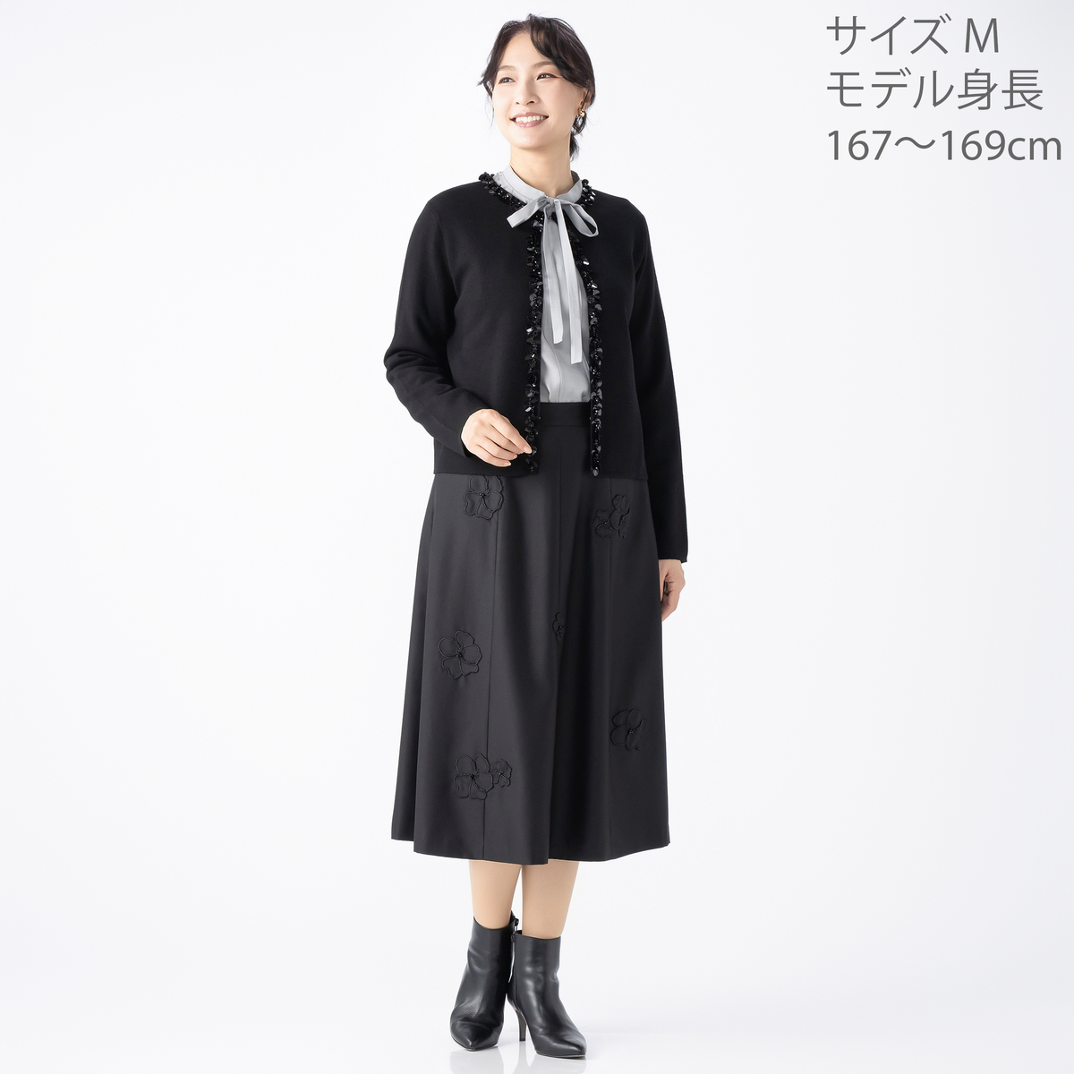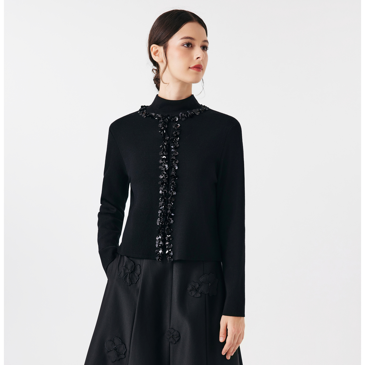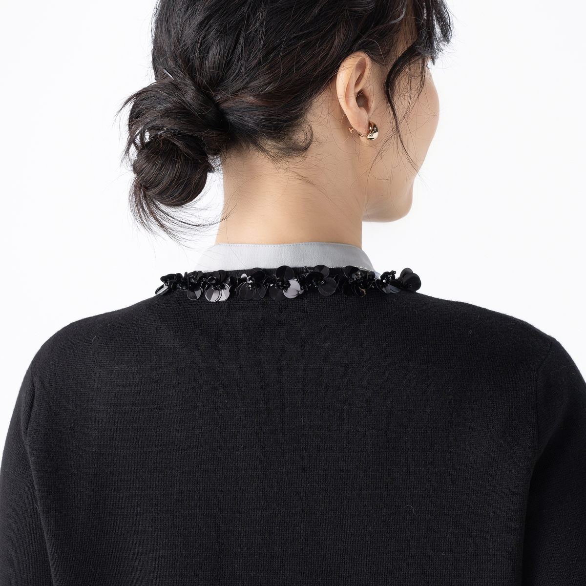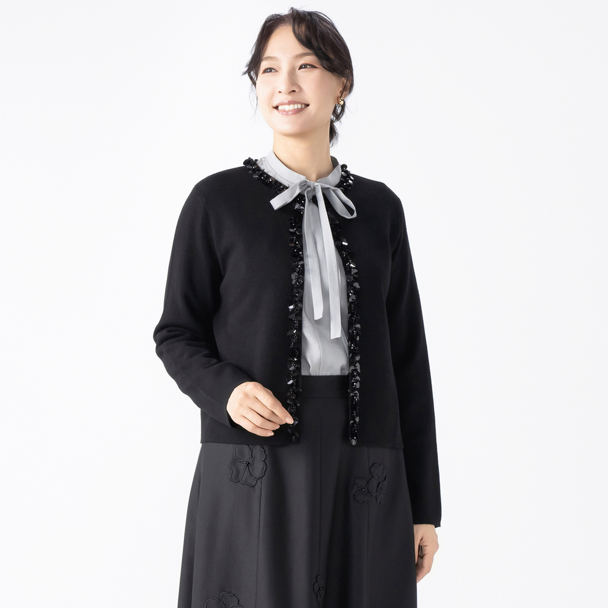 煌めくスパンコールがアクセントになったメリノウールのミラノリブジャケット。襟元と前立て部分には、完全手作業でビーズの装飾を施しています