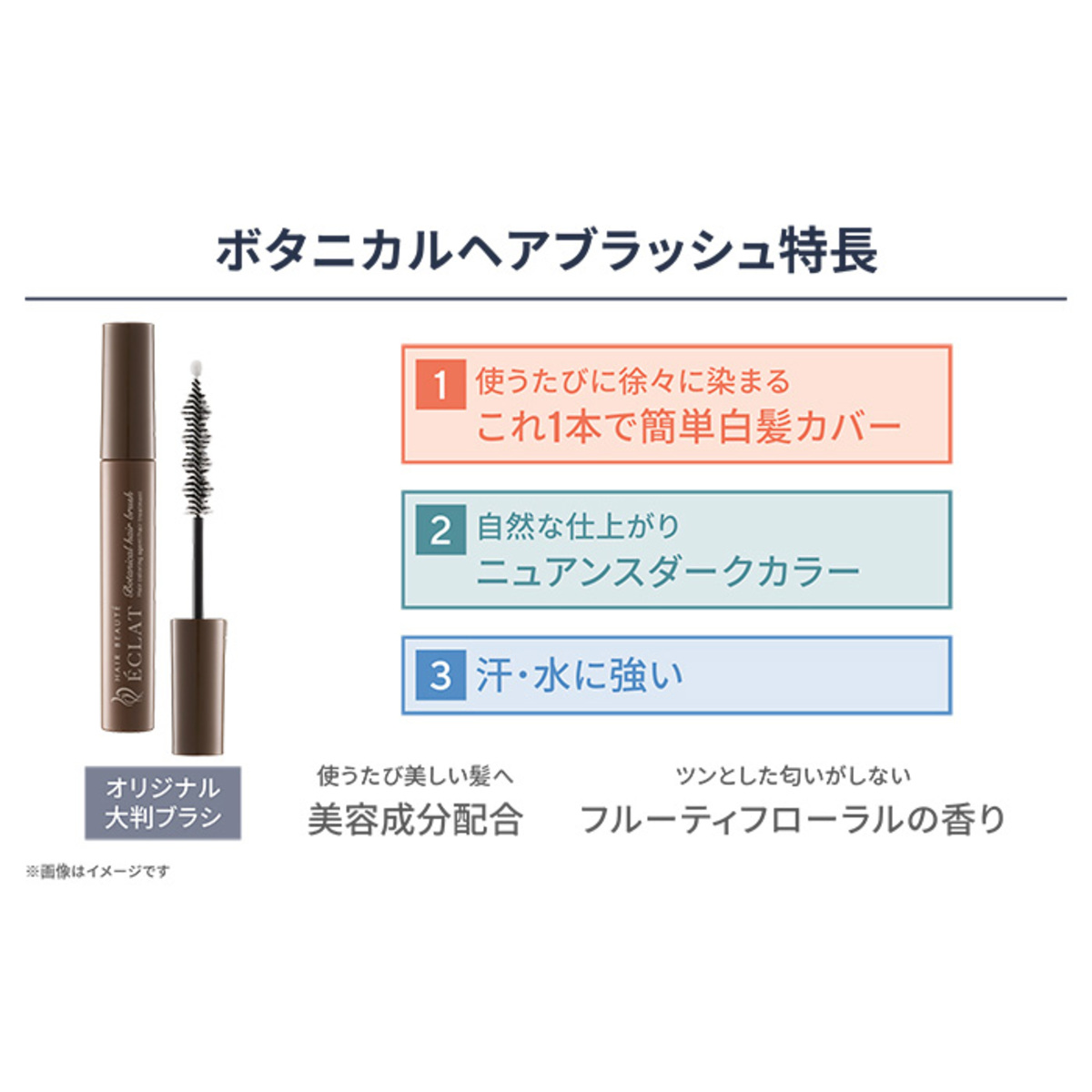 [商品内容] ヘアボーテエクラ ボタニカルヘアブラッシュ [使用方法] 白髪の気になる部分に4つ玉ブラシを横向きに当て、根元から毛先に向かって滑らせるように塗ってください。先端のチップは、もみあげ付近やうぶ毛などの細かい箇所にご使用ください [注意事項] ※頭皮やお肌に異常が生じていないかよく注意して使用し、使用中、または使用後に直射日光にあたって赤み・はれ・かゆみ・刺激・色抜け(白斑等)・黒ずみ等の異常があらわれたときはご使用をおやめください 。そのまま使用を続けると、症状を悪化させることがありますので、皮膚科専門医等へのご相談をおすすめします ※傷・はれもの・湿疹等、異常のあるところにはお使いにならないでください ※まつ毛や眉毛など、頭髪以外の部位に使用しないでください ※皮膚や頭皮、衣服等につかないようにご注意ください ※皮膚についた時は直ちに水やぬるま湯で洗い落としてください ※目に入ったときは、直ちに洗い流してください ※目に異物感が残る場合は、眼科医にご相談ください ※使用後は容器の口元をきれいにふき取り、しっかりとキャップを閉めてください ※乳幼児の手の届くところ、直射日光のあたる場所や極端に高温または低温の場所には保管しないでください ※暗所への保管をおすすめします 【日本製】 [成分]水、エタノール、(ジビニルジメチコン/ジメチコン) コポリマー、ミリスチルアルコール、ベヘニルアルコール、BG、 ステアルトリモニウムブロミド、セテス-30、リゾレシチン、 加水分解卵黄、セイヨウアカマツ球果エキス、チャ葉エキス、 アセチルテトラペプチド-3、アカツメクサ花エキス、センブリエキス、オタネニンジン根エキス、ビワ葉エキス、オウゴン根エキス、 ノイバラ果実エキス、ワレモコウエキス、シャクヤク根エキス、 クララ根エキス、マグワ根皮エキス、ハトムギ種子エキス、 アカヤジオウ根エキス、モモ葉エキス、 (アクリル酸ブチル/イソプロピルアクリルアミド/ジメタクリル酸PEG-18)クロスポリマー、アクリレーツコポリマー、 ゼイン、ケイ酸(Li/Mg/Na)、γ-ドコサラクトン、 セバシン酸ジエチル、(カプリル酸/カプリン酸)ヤシアルキル、 シクロヘキサン-1,4-ジカルボン酸ビスエトキシジグリコール、 グリシン、ベタイン、DPG、グリセリン、ペンチレングリコール、 デキストラン、ヒドロキシエチルセルロース、 ステアラミドエチルジエチルアミン、セテス-2、ラウレス-21、 (C12,13)パレス-23、(C12,13)パレス-3、コカミドMEA、 PEG-40水添ヒマシ油、イソプロパノール、クエン酸Na、クエン酸、 ピロ亜硫酸Na、塩化亜鉛、デヒドロ酢酸Na、メチルパラベン、香料、 カーボンブラック、塩基性青99、塩基性茶16、HC青2、HC黄4、HC赤3