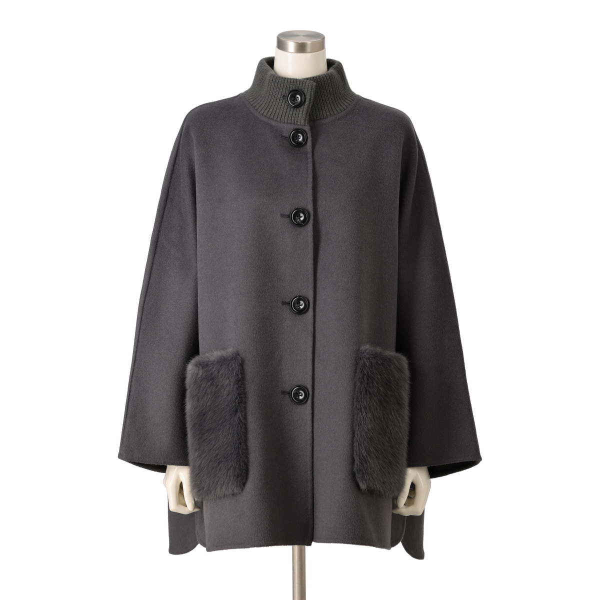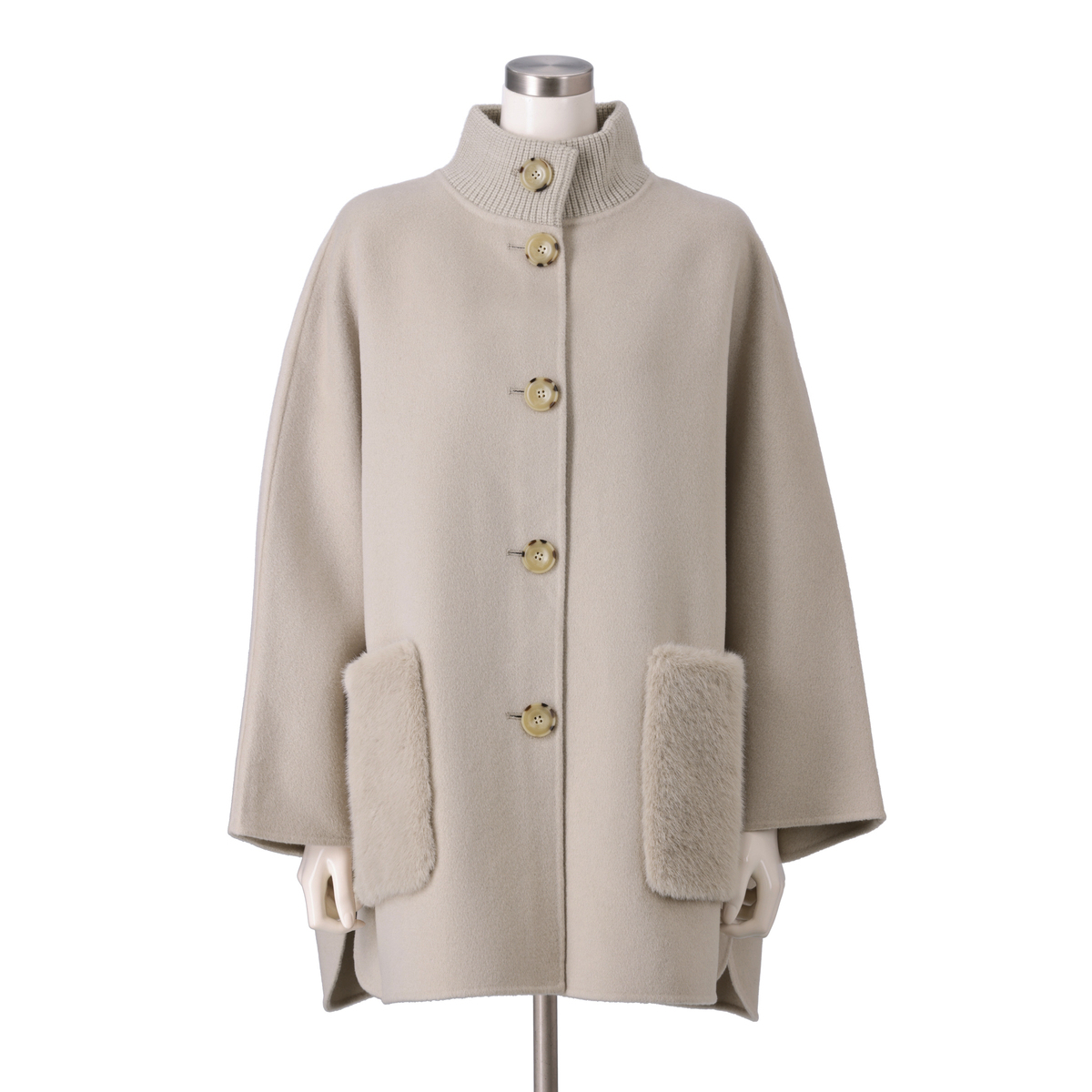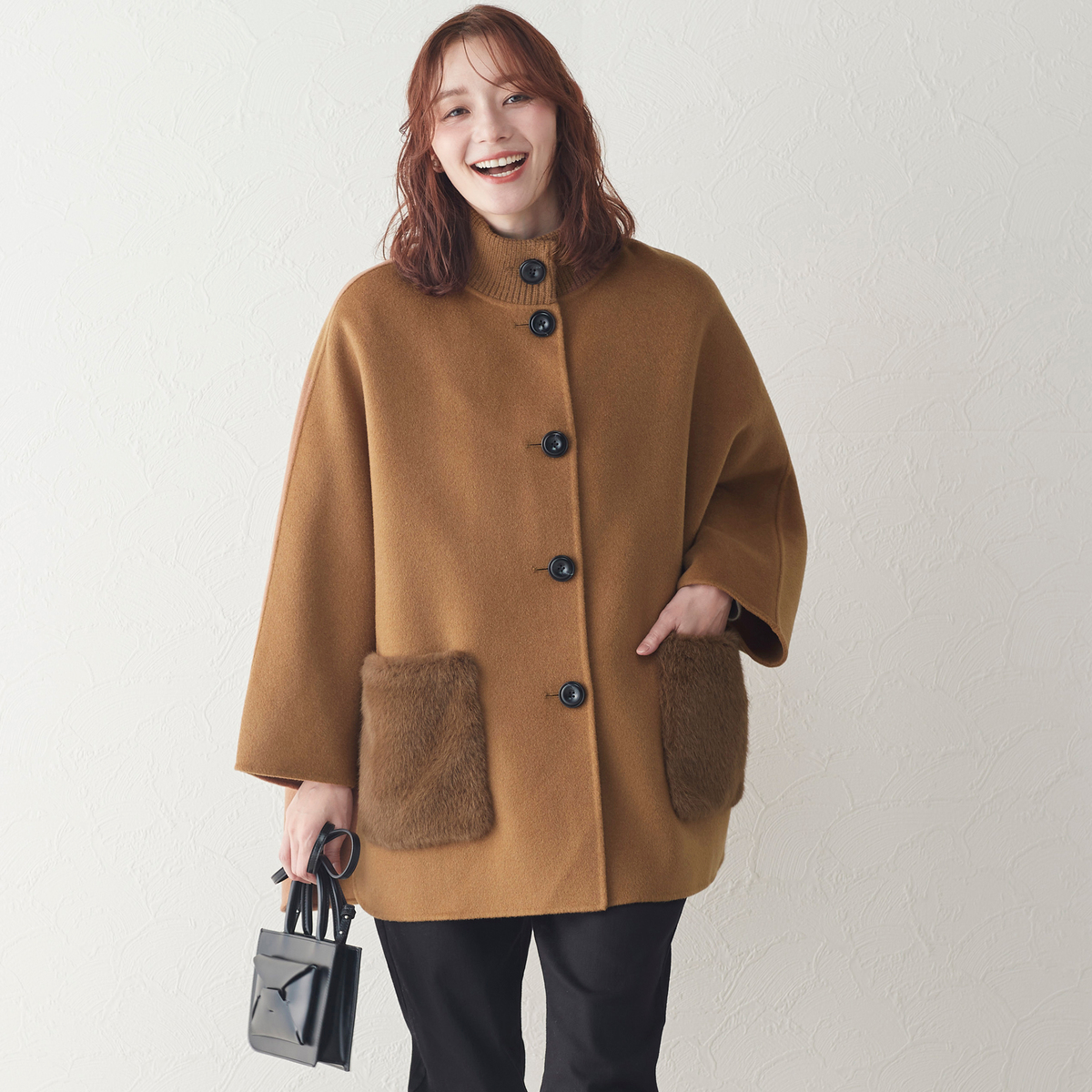 本体にオーストラリア産ウール100%を使用したコート。カシミヤのような光沢と肌触りが魅力です。ニット素材のスタンド衿が暖かく、ミンク風のフェイクファーを使用したアウトポケットがゴージャスで可愛らしいアクセントになっています