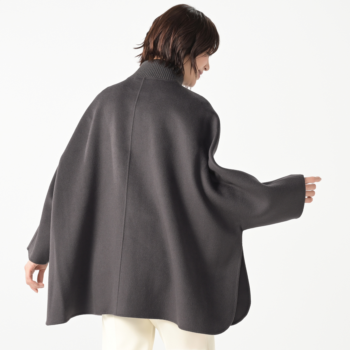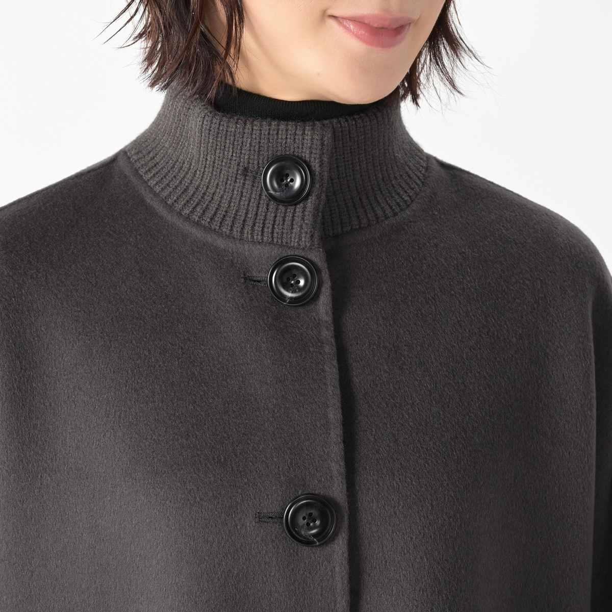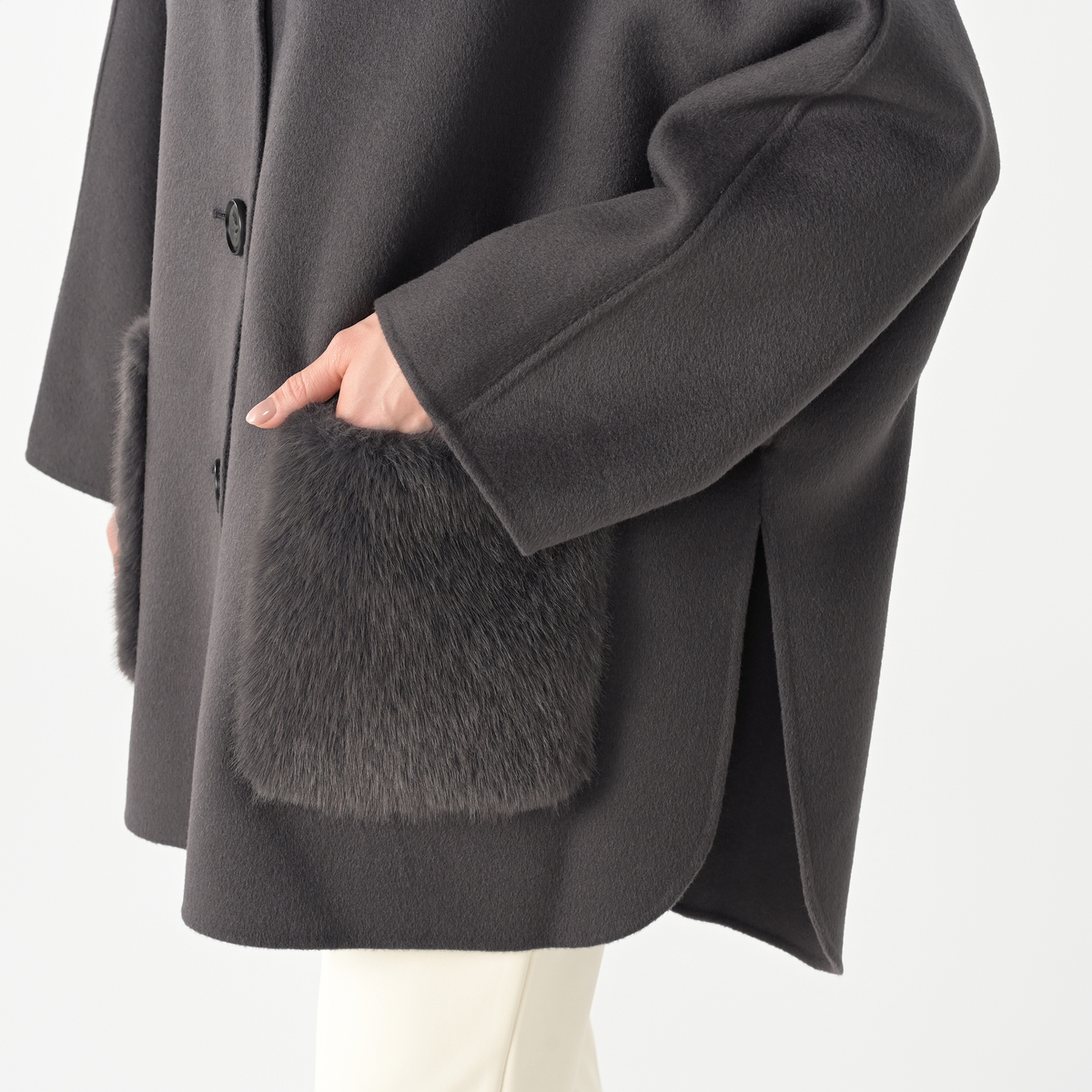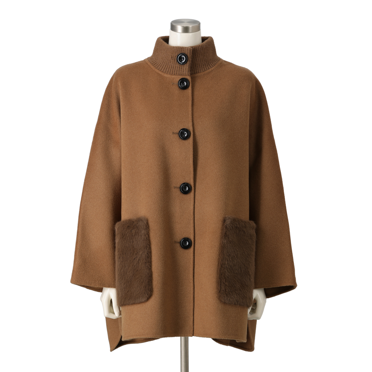 本体にオーストラリア産ウール100%を使用したコート。カシミヤのような光沢と肌触りが魅力です。ニット素材のスタンド衿が暖かく、ミンク風のフェイクファーを使用したアウトポケットがゴージャスで可愛らしいアクセントになっています