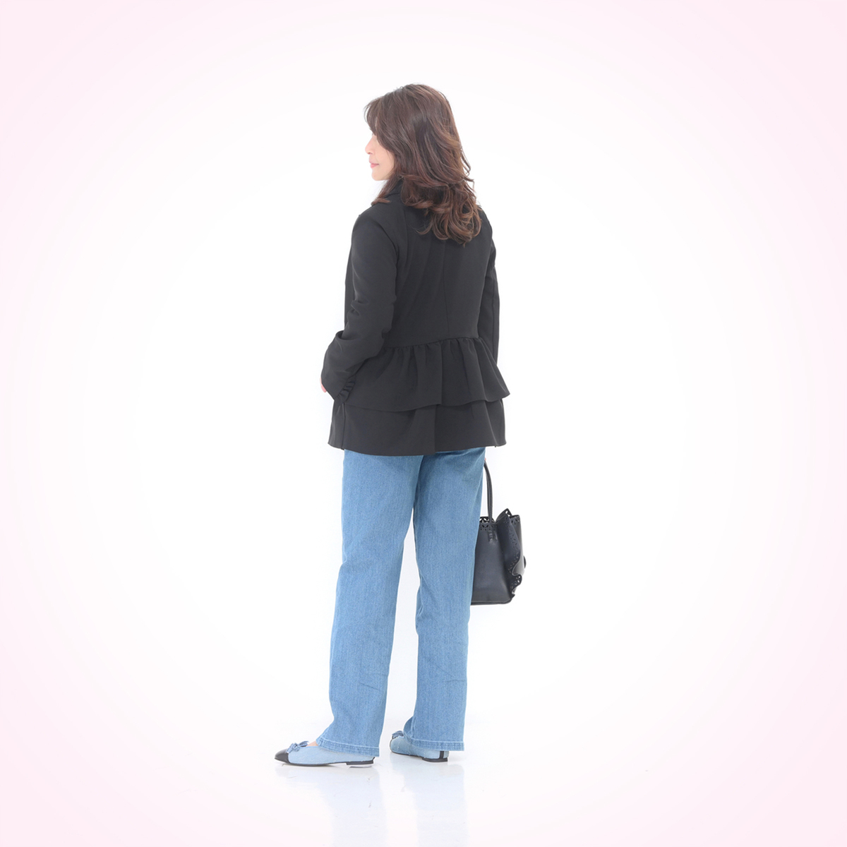 前両腰ポケットは直線に近い斜めラインの口で、すっきり収まりが良い仕様。後ろの貼り付けポケットは程よい大きさと位置にこだわり、小尻見えを意識しています