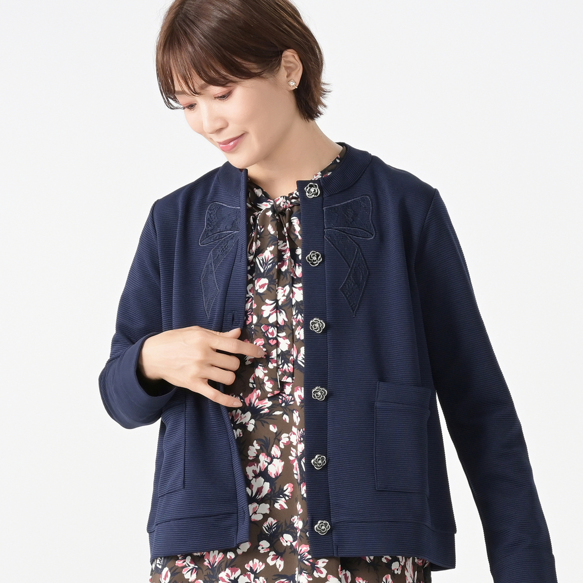 同色のレースを重ねた、立体的なリボンモチーフ刺繍が目を惹くカーディガン。フロントには煌めくラインストーンをあしらったカメリアボタンを使い、華やかさをプラスしました