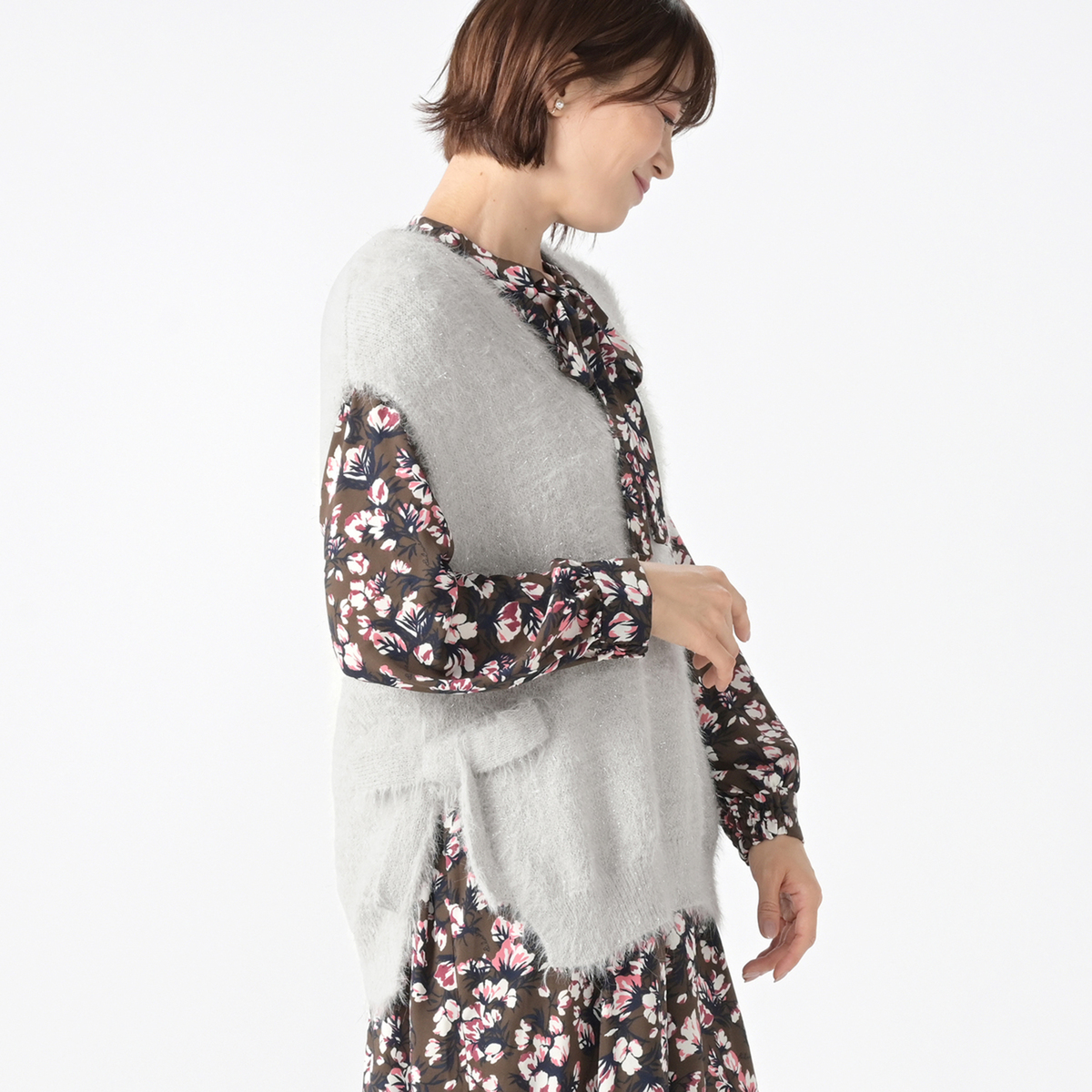 脇のスリット止まりにフワフワキラキラのリボンをあしらったニットベスト。Vネックとゆとりのあるシルエットで、様々なインナーと組合せやすく、コーディネートの幅が広がります