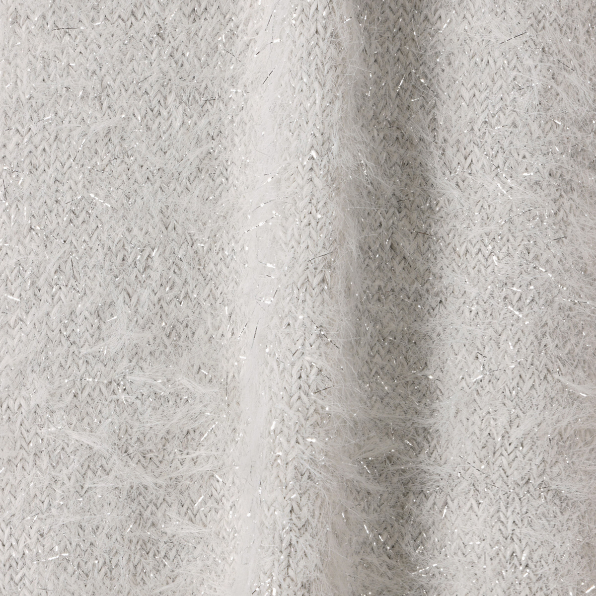 フワフワのフェザーヤーンにラメが入った素材を5ゲージで編み立てています。天竺の度詰めで編むことで重くなりすぎず、ダレにくいように作成しています