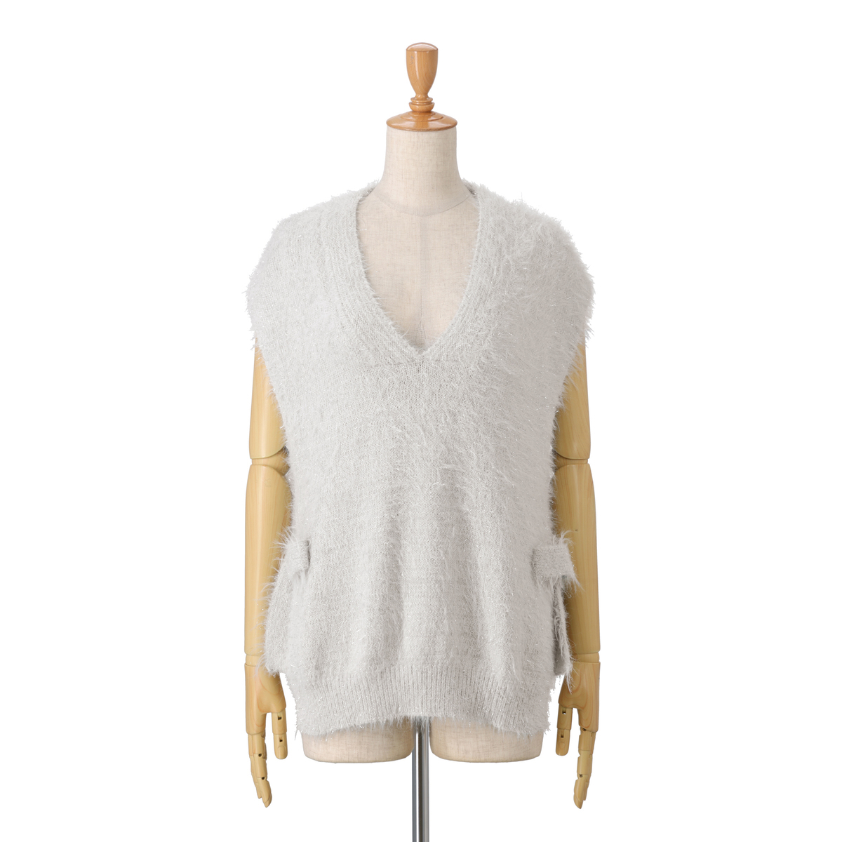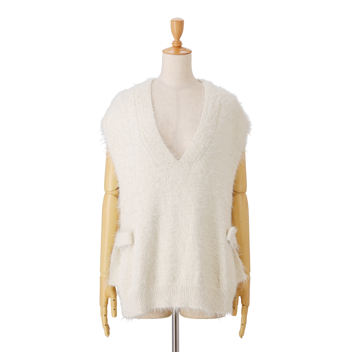 脇のスリット止まりにフワフワキラキラのリボンをあしらったニットベスト。Vネックとゆとりのあるシルエットで、様々なインナーと組合せやすく、コーディネートの幅が広がります